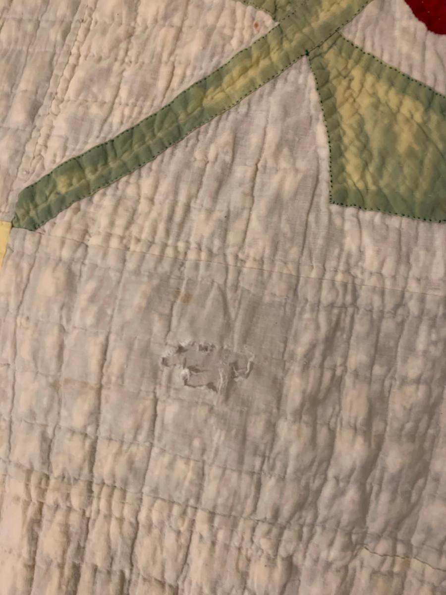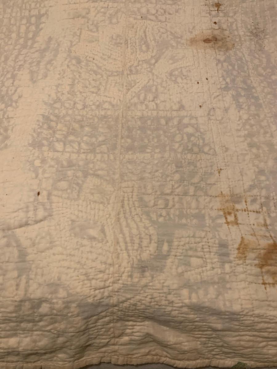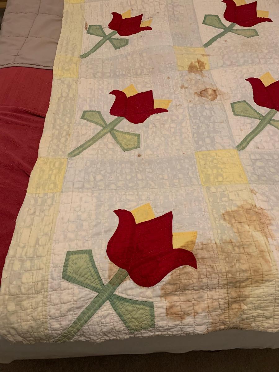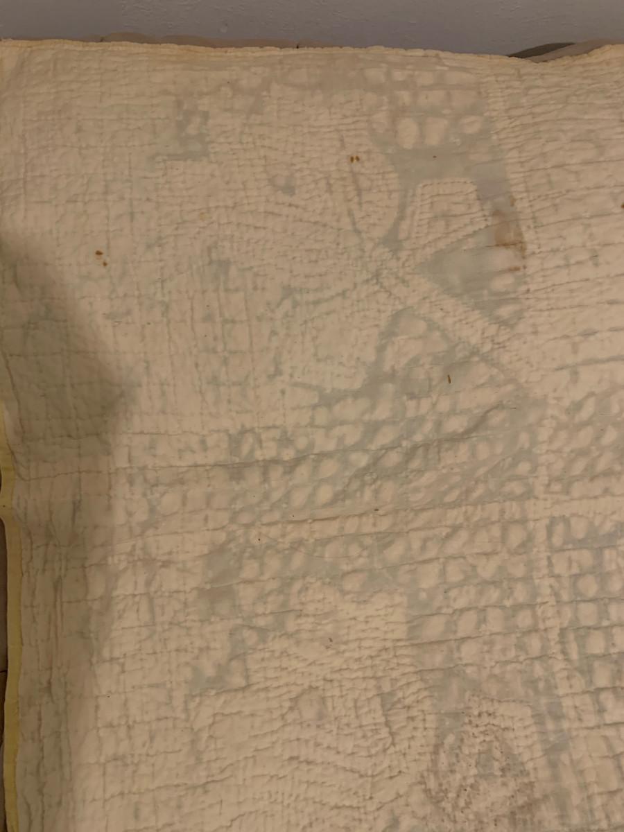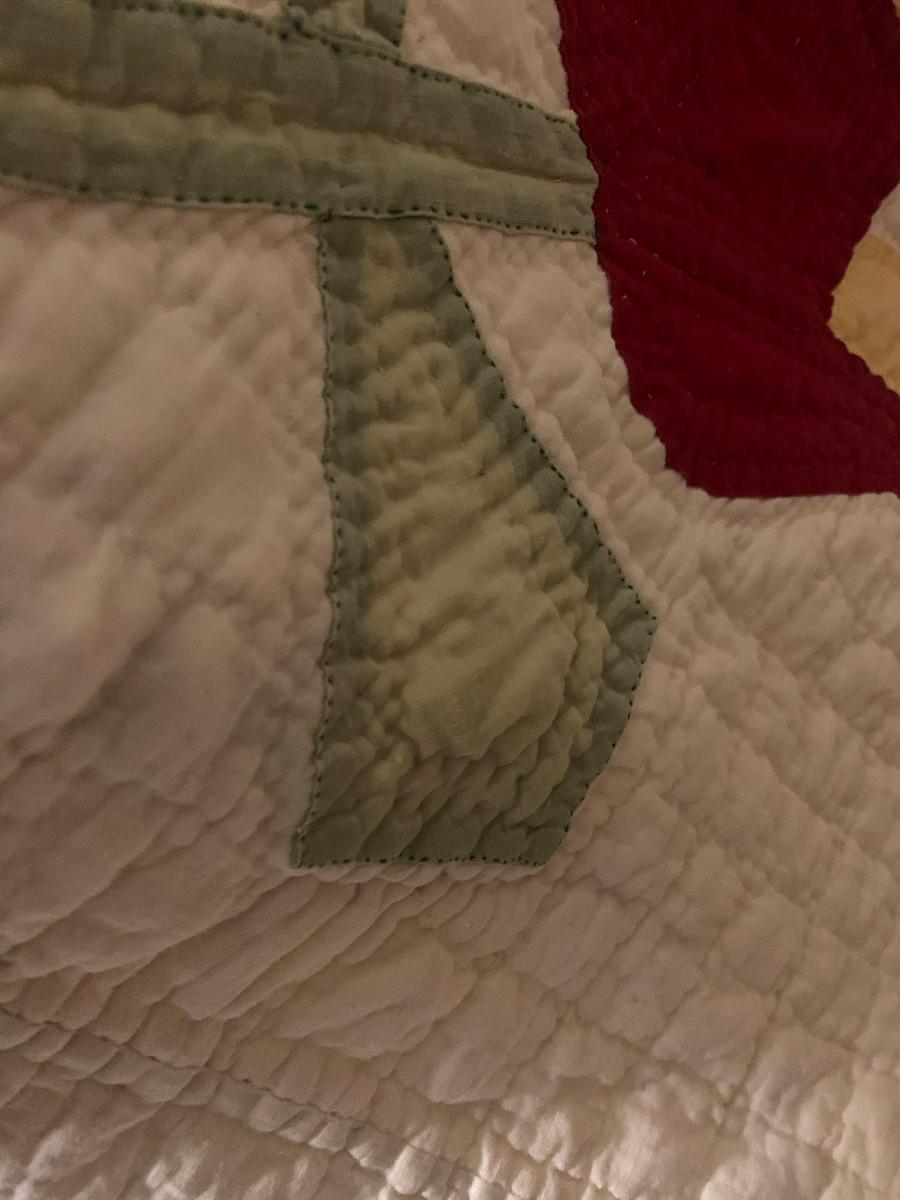 Hand sewn quilt w tulip flower design has some staining. Owner has used dawn platinum and soaked overnight- some of the staining was removed-no idea what it is -please view pics and make your decision. This is beautiful hand stitching, very detailed, using multiple colors and each tiny square is hand stitched. Perhaps it can be restored or used to make other items.