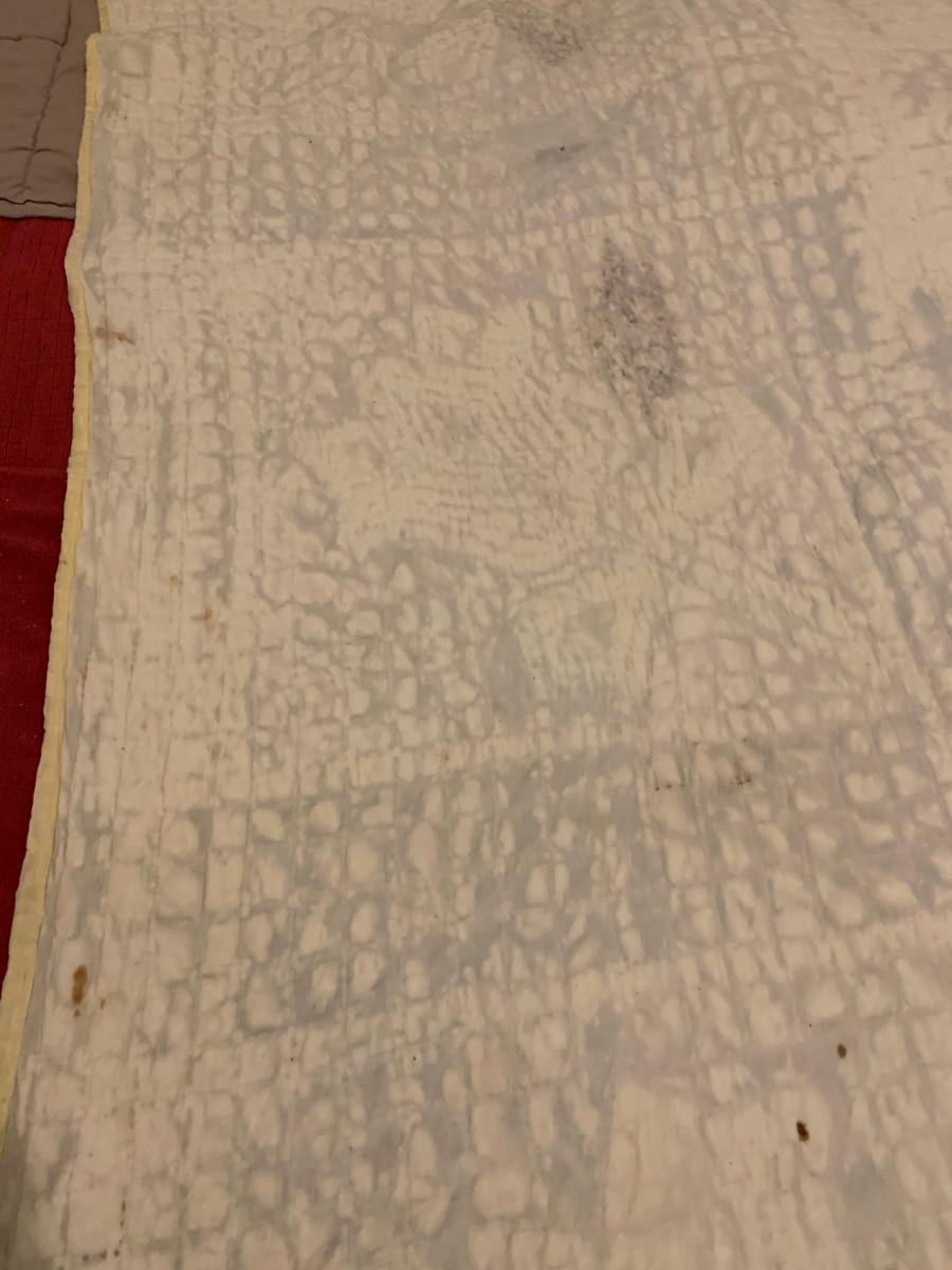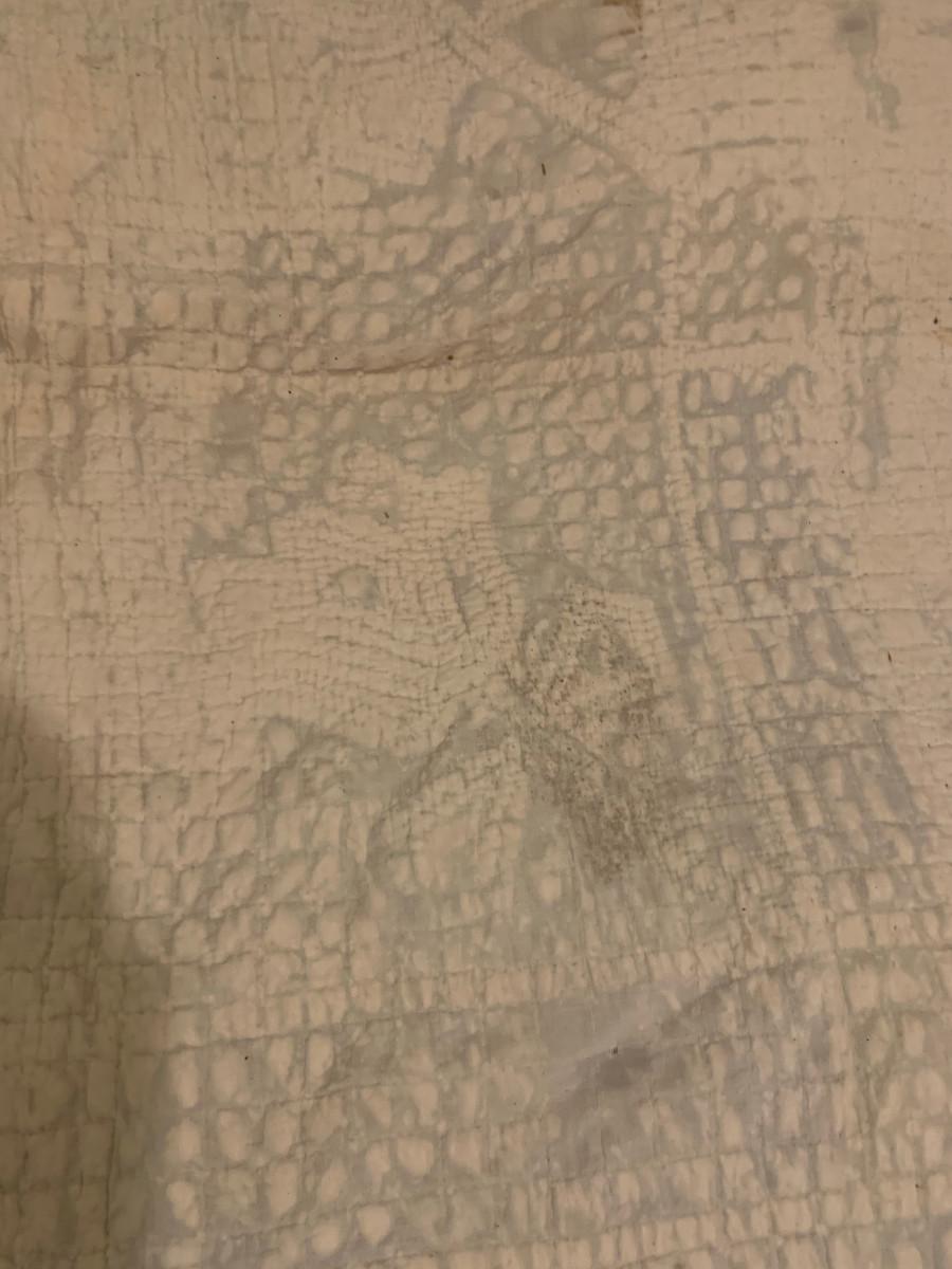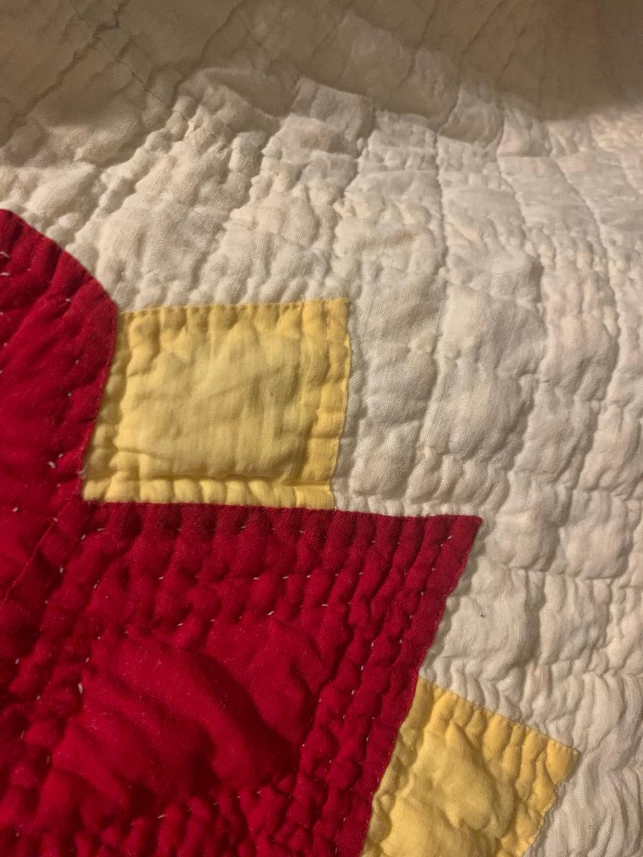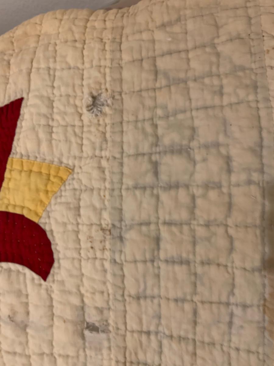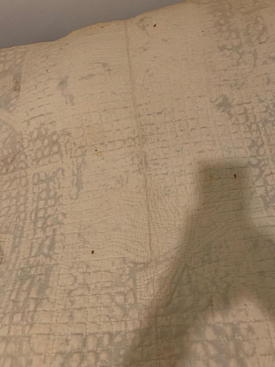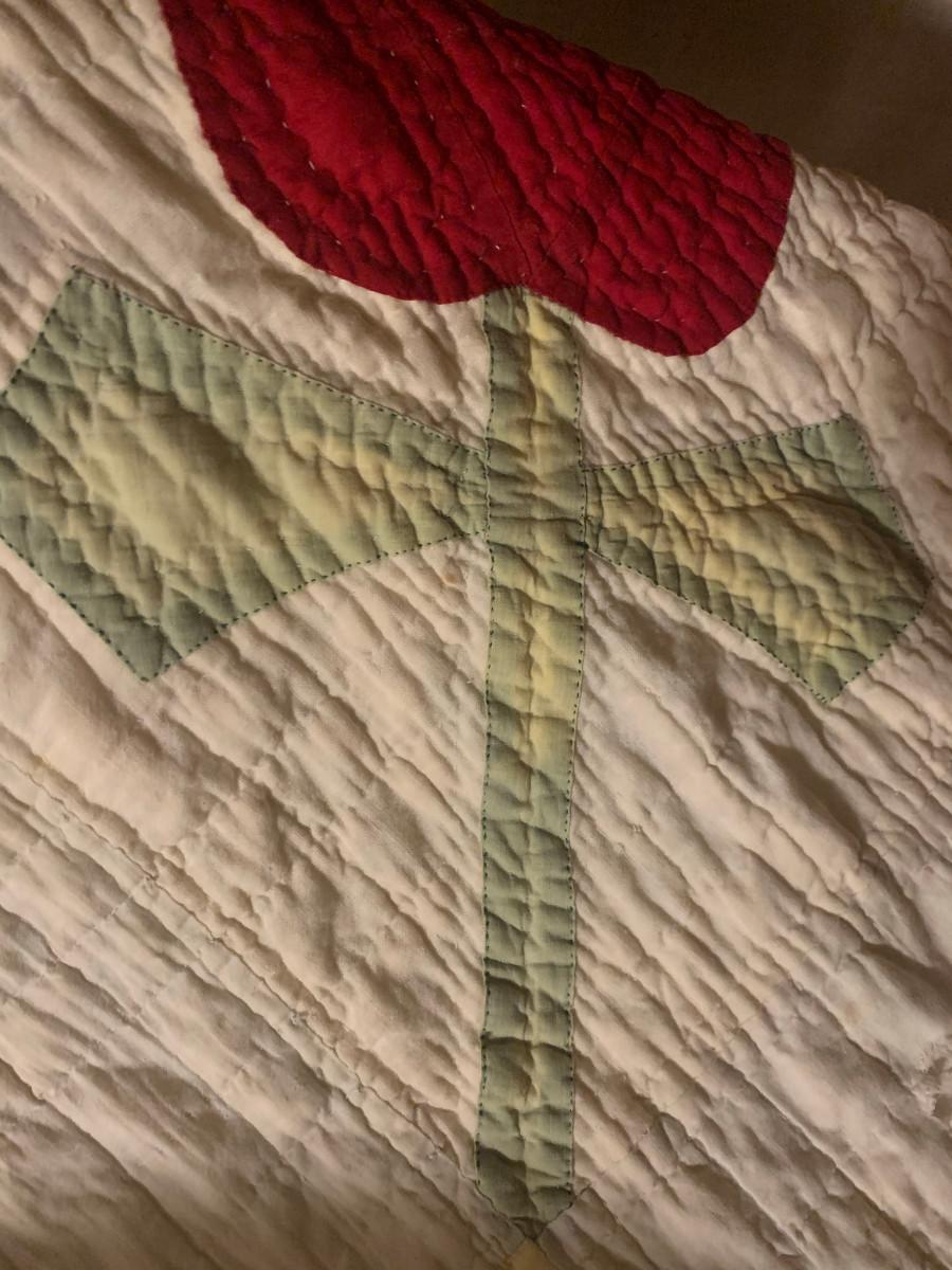 Hand sewn quilt w tulip flower design has some staining. Owner has used dawn platinum and soaked overnight- some of the staining was removed-no idea what it is -please view pics and make your decision. This is beautiful hand stitching, very detailed, using multiple colors and each tiny square is hand stitched. Perhaps it can be restored or used to make other items.