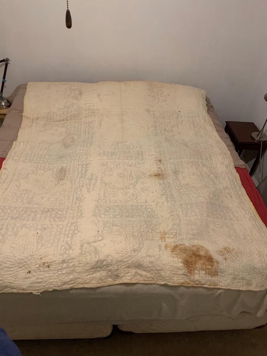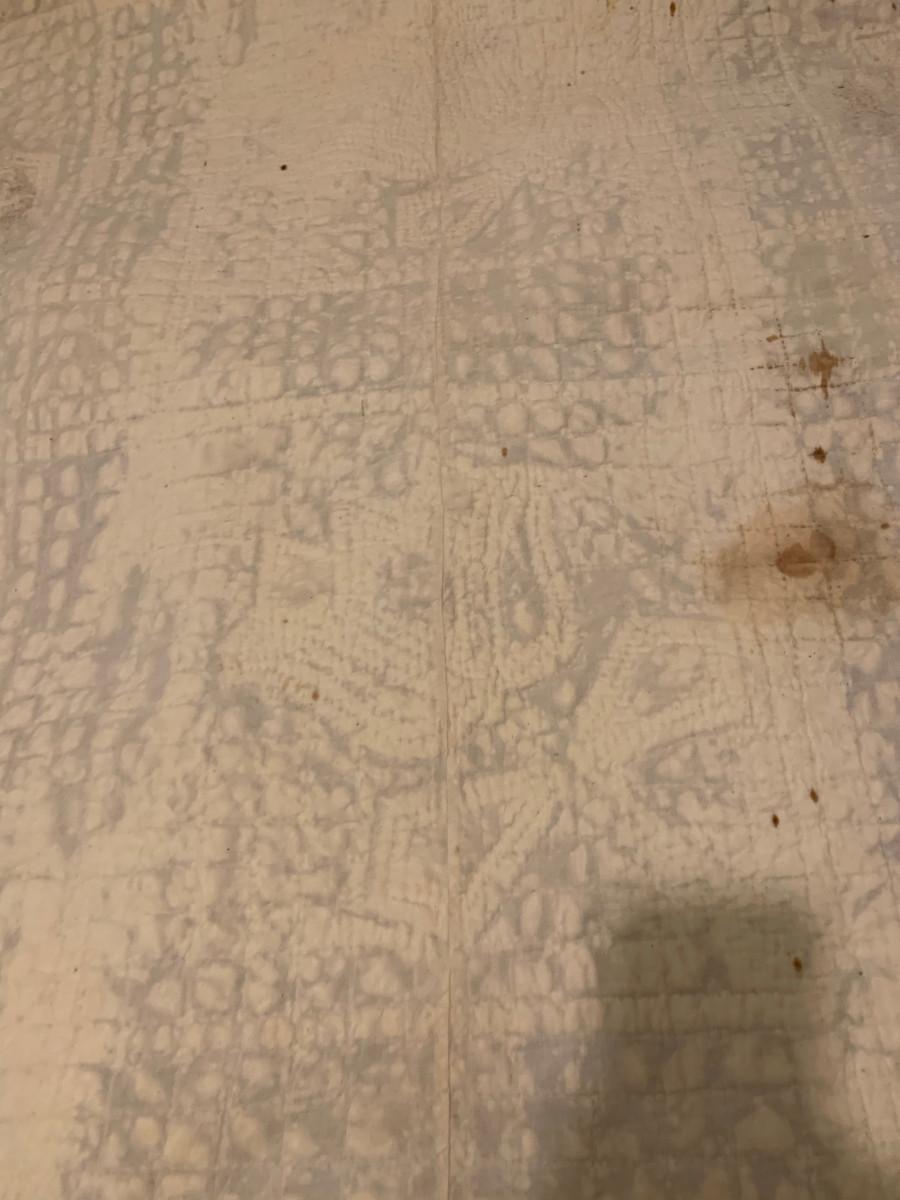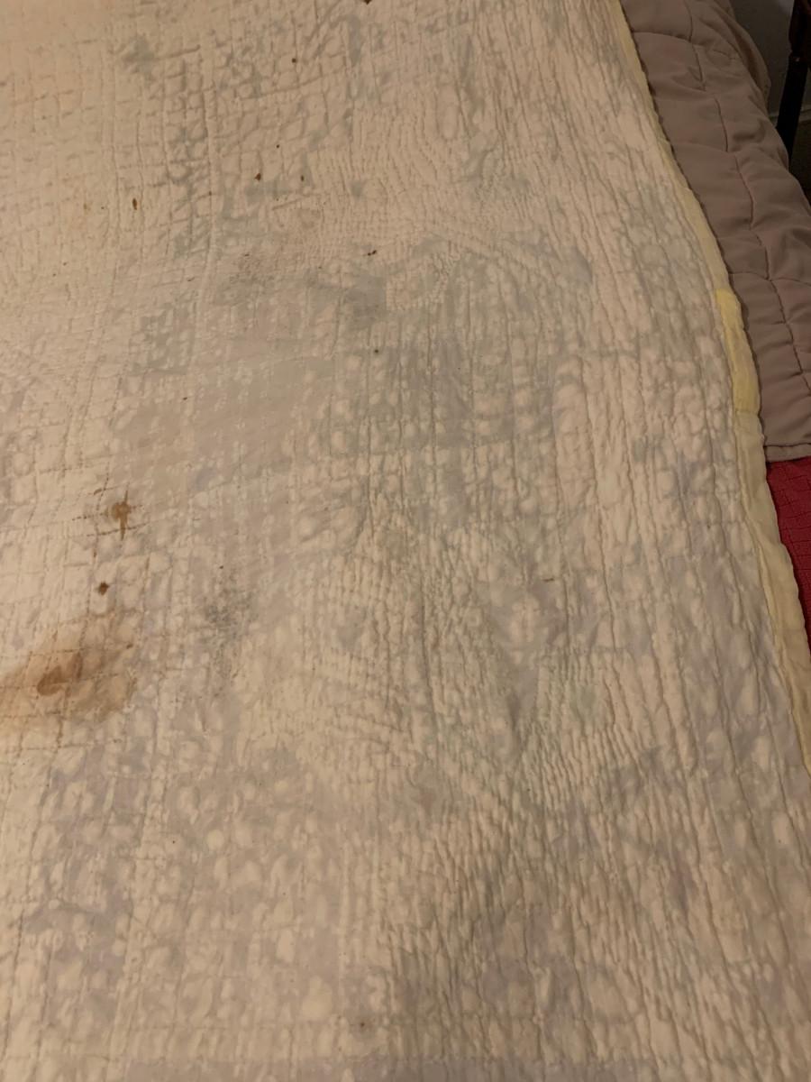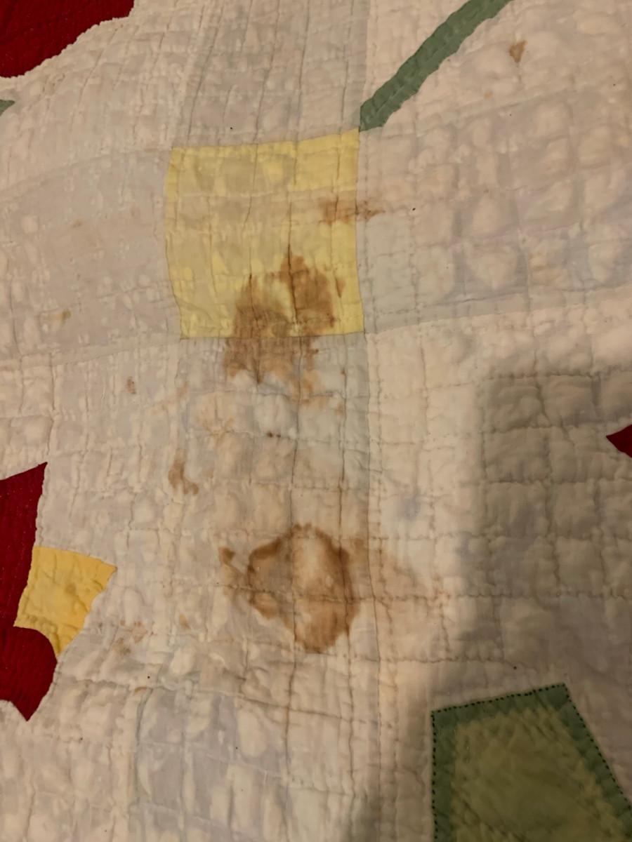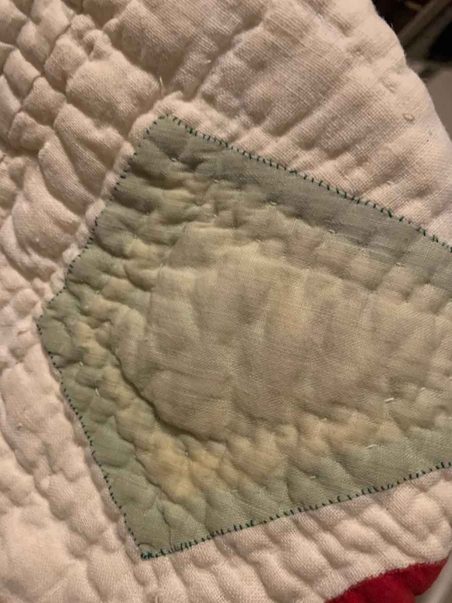 Hand sewn quilt w tulip flower design has some staining. Owner has used dawn platinum and soaked overnight- some of the staining was removed-no idea what it is -please view pics and make your decision. This is beautiful hand stitching, very detailed, using multiple colors and each tiny square is hand stitched. Perhaps it can be restored or used to make other items.