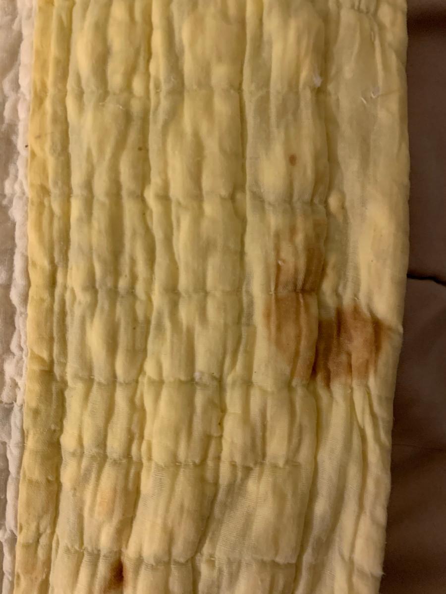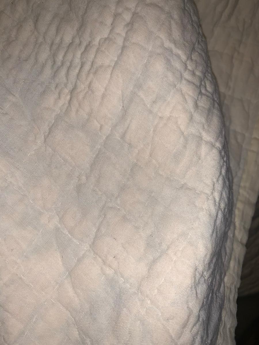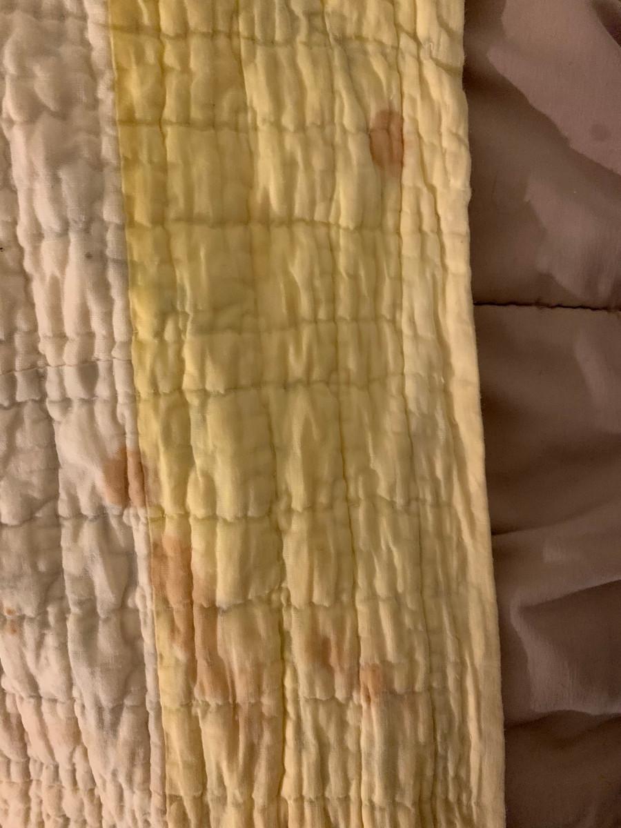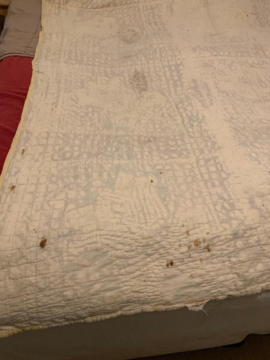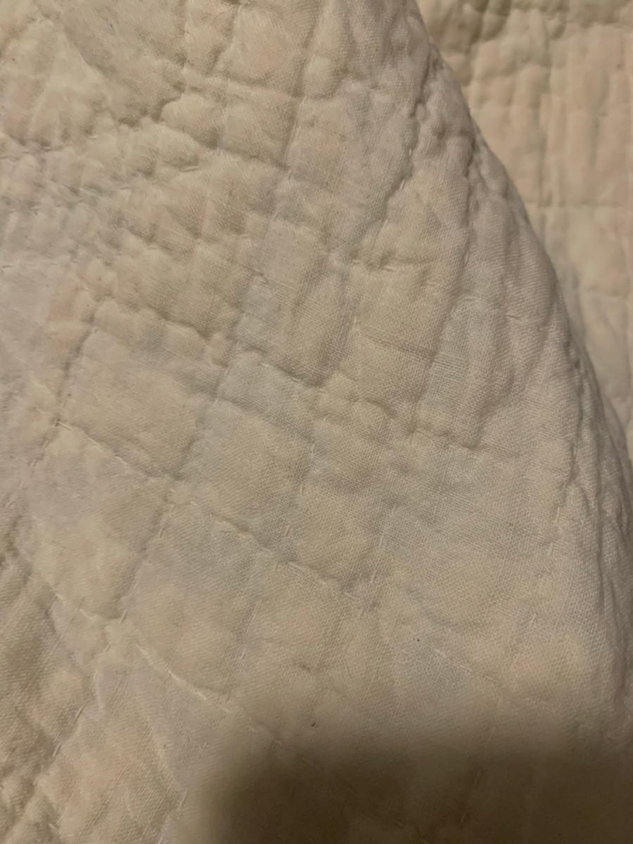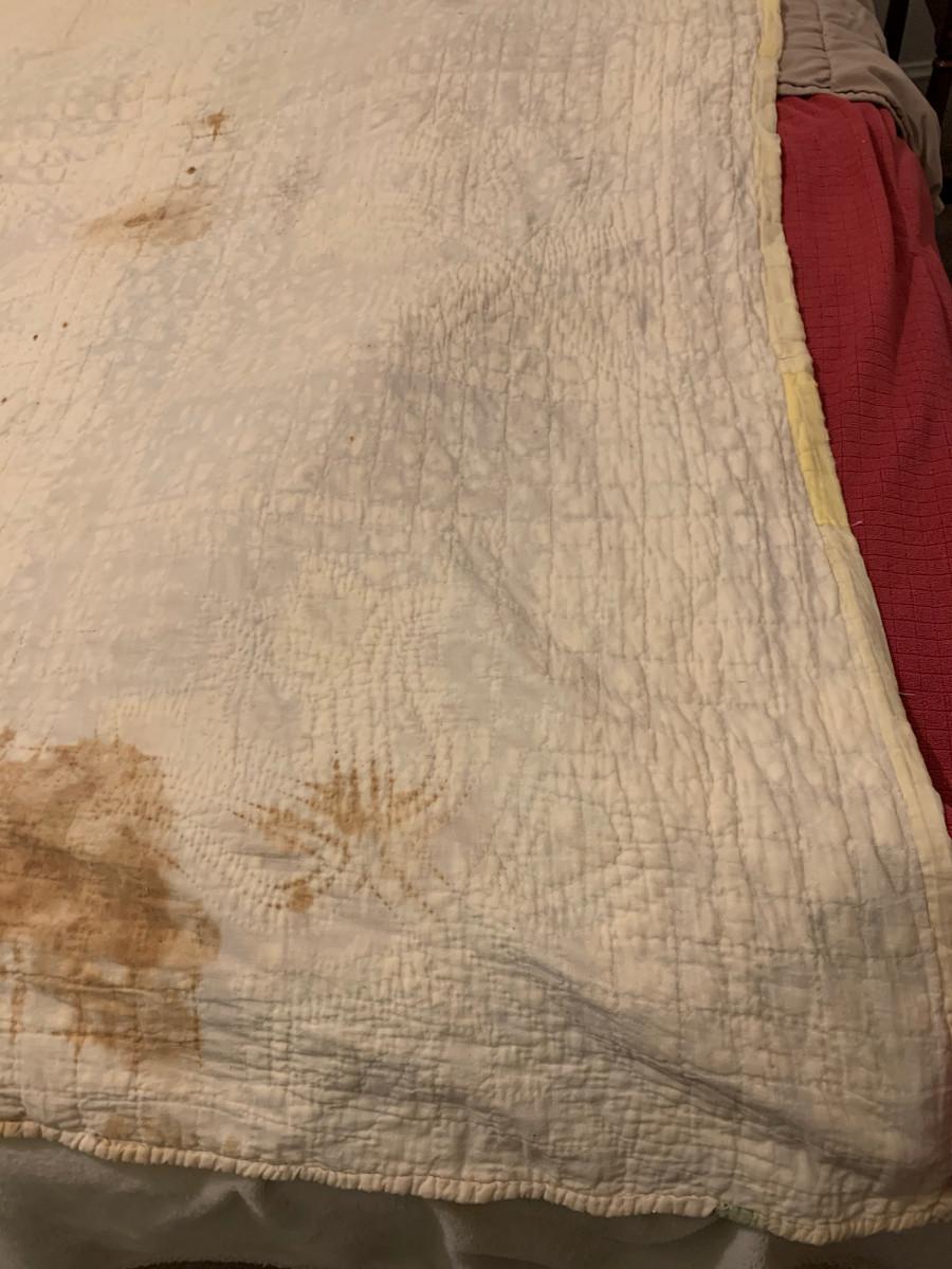 Hand sewn quilt w tulip flower design has some staining. Owner has used dawn platinum and soaked overnight- some of the staining was removed-no idea what it is -please view pics and make your decision. This is beautiful hand stitching, very detailed, using multiple colors and each tiny square is hand stitched. Perhaps it can be restored or used to make other items.