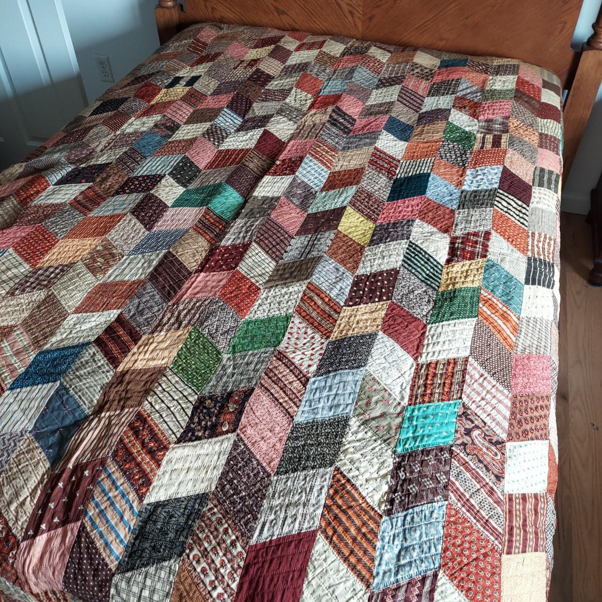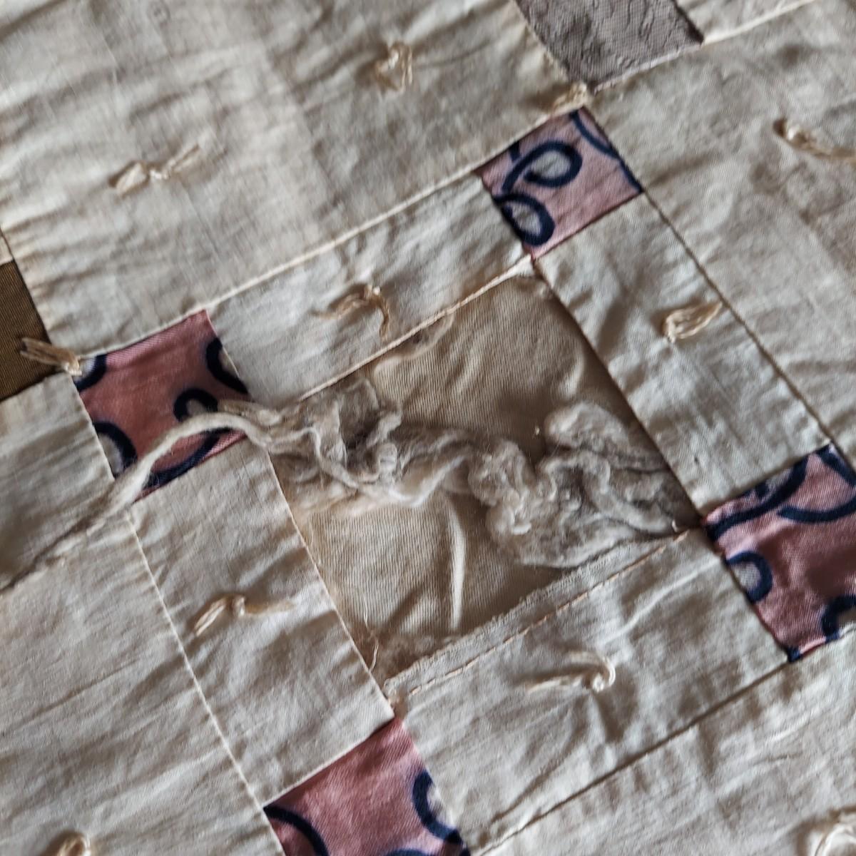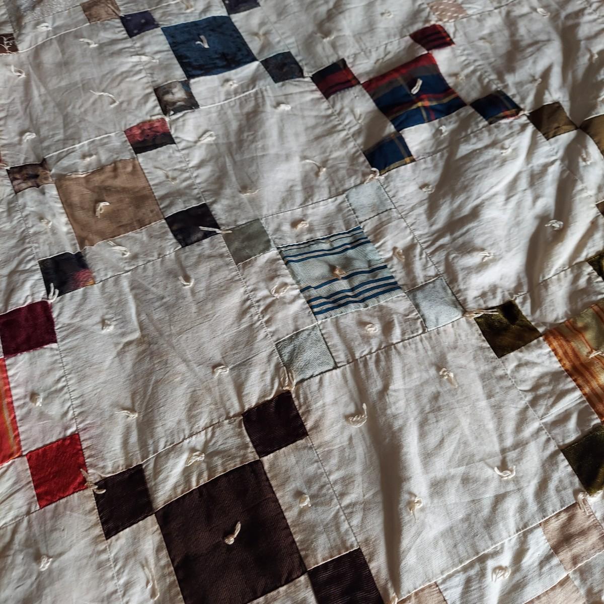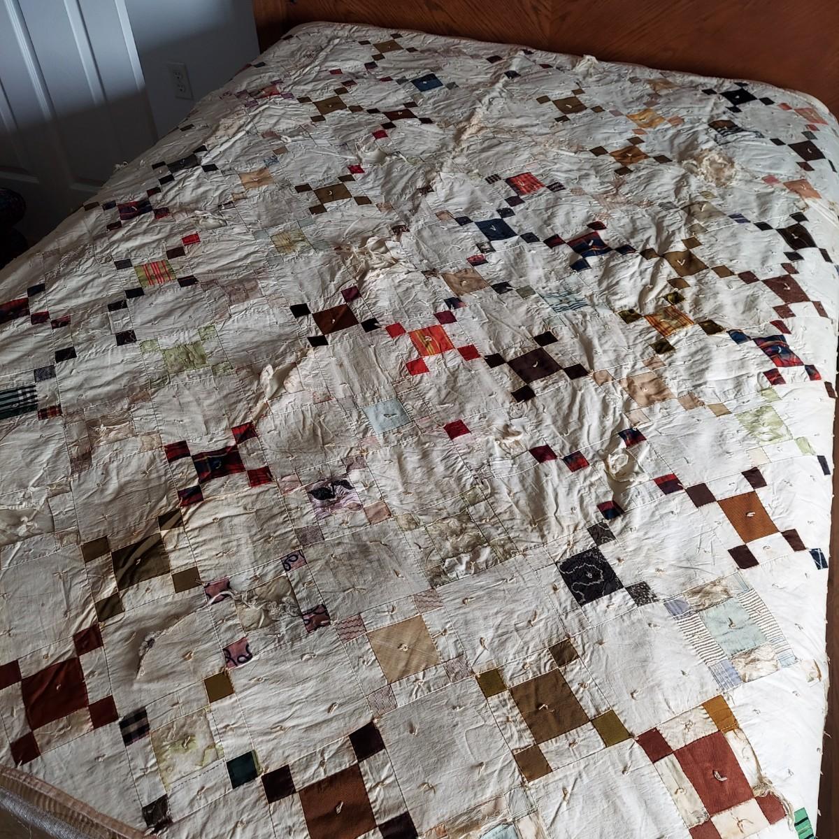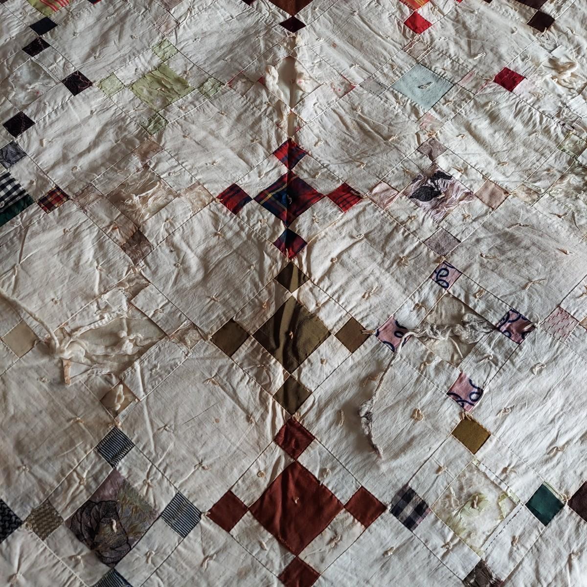 Five quilts that appear to be hand stitched and/or hand quilted. One quilt is quite old. It's dated 1891. It is very fragile and has some tears and worn areas. It measures 69” x 76"H. Another quilt, mostly white, also has some areas with wear. Please see photos for details. Shipping available