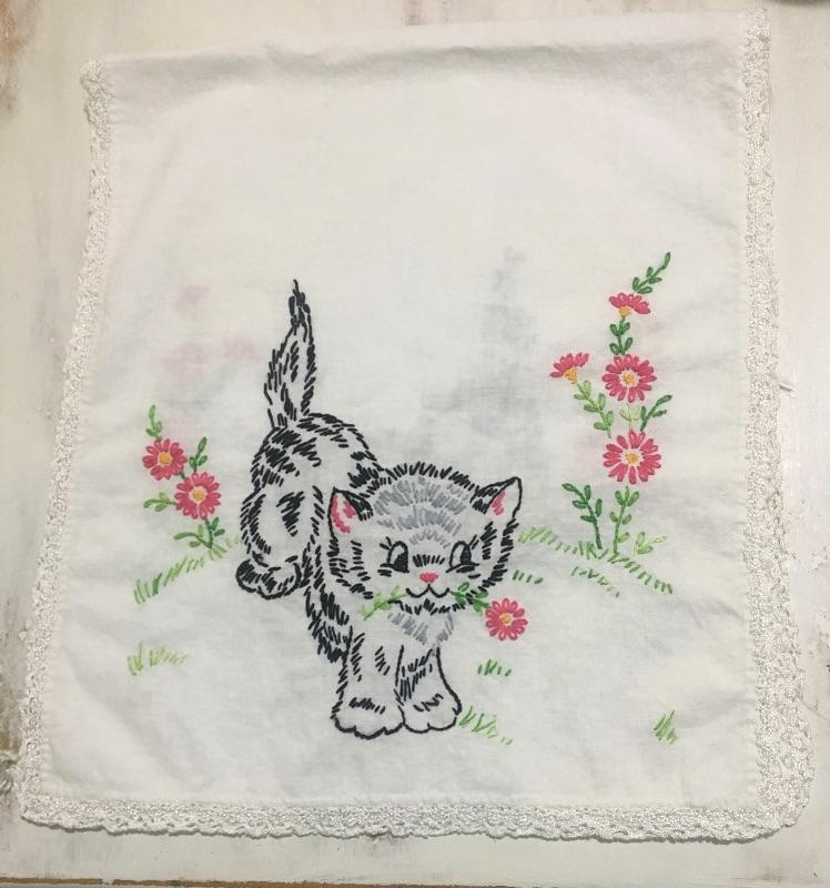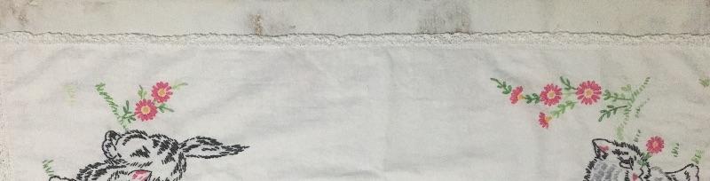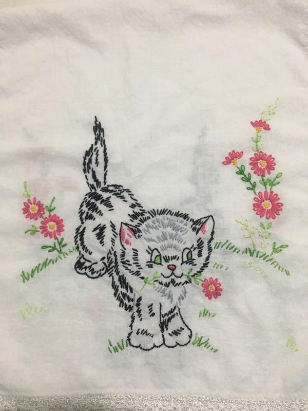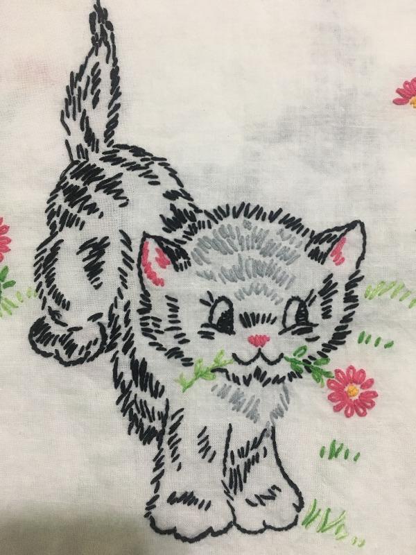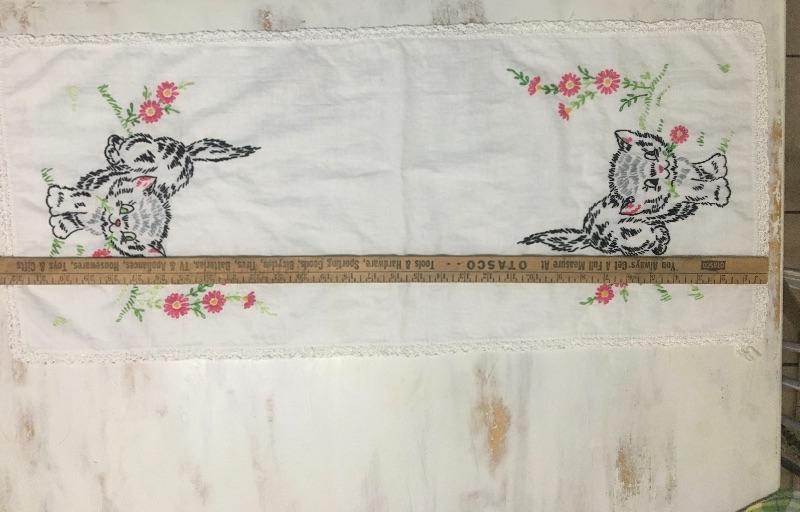 Beautiful hand work in this dresser topper. Cute little black kittens at play with pretty pink flowers. There is a little fraying in a little piece of the lace, could be an easy fix. Heirloom of times past.