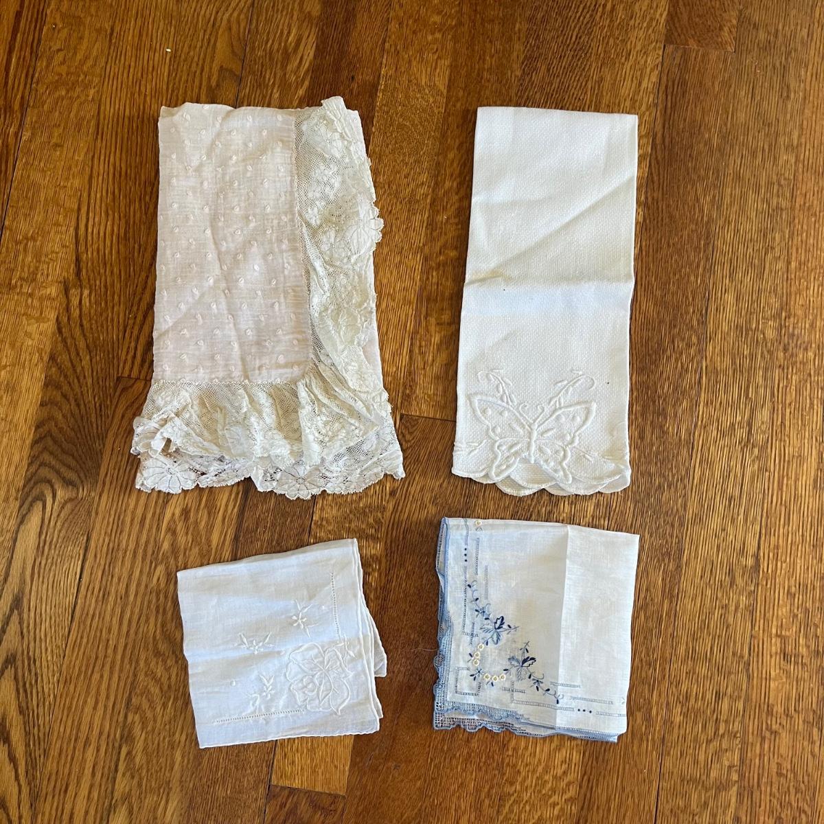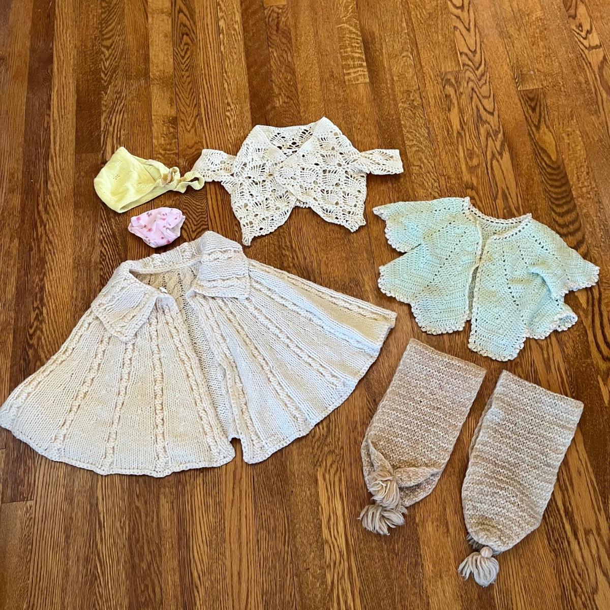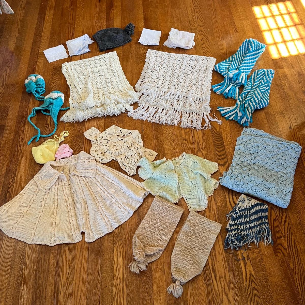 Large selections of handmade items including baby or doll clothes, a crocheted baby blanket, a few children’s size items and adult accessories. See pictures for more details. Many items appear to be in nice condition: others show much wear.
