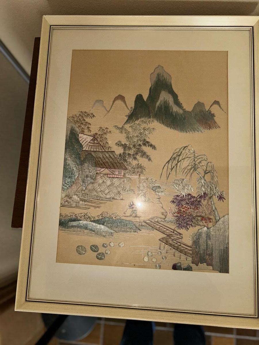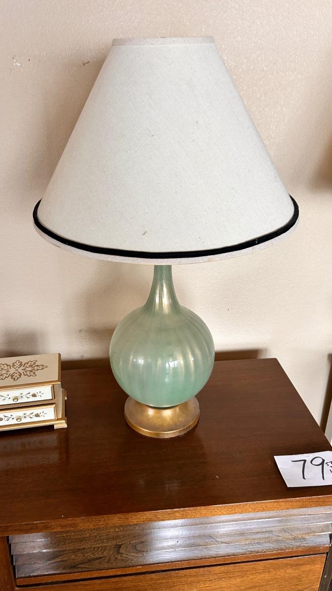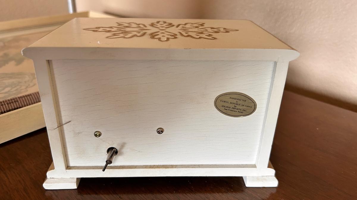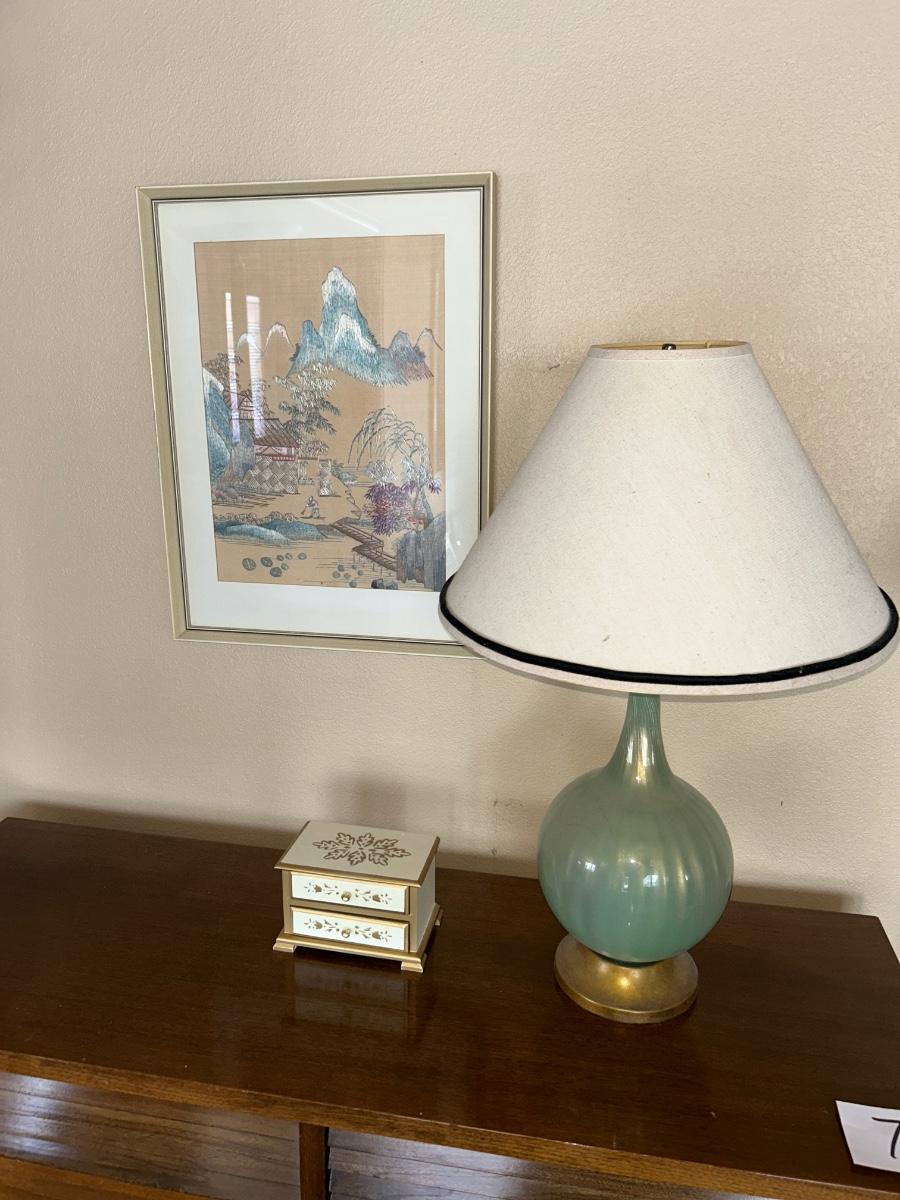 SILK STITCHED PICTURE, VINTAGE LAMP AND MUSICAL JEWELRY BOX