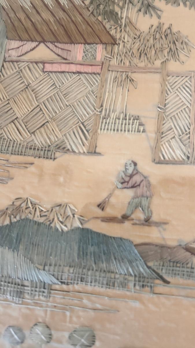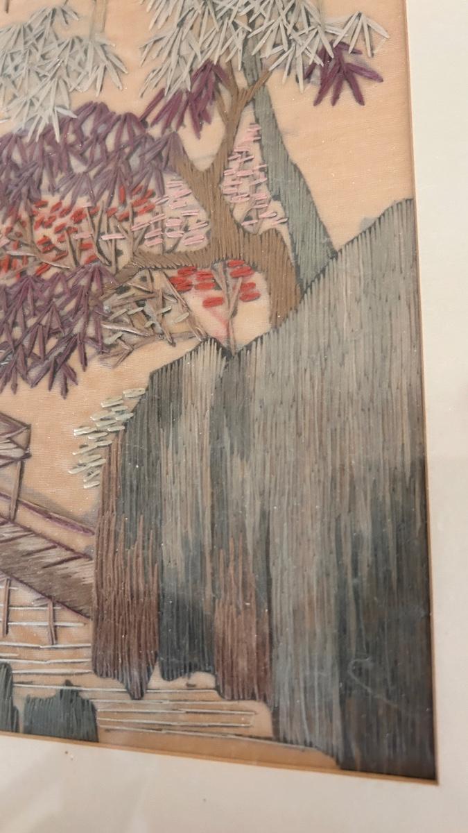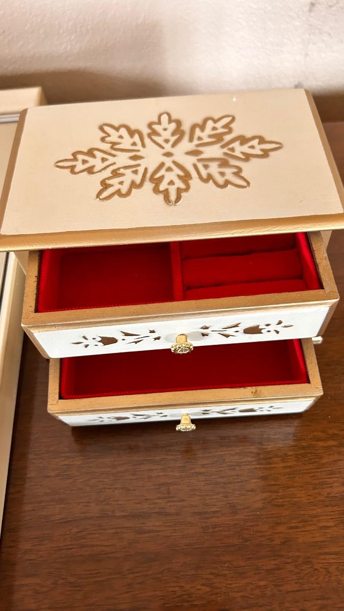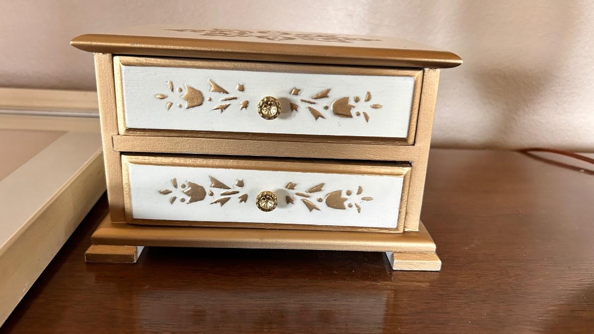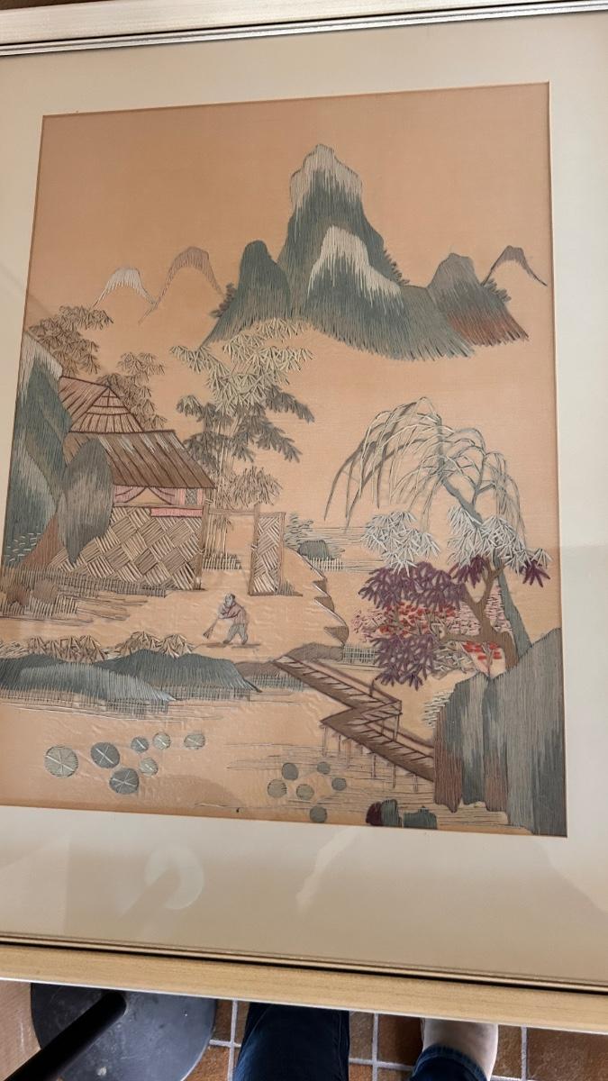 SILK STITCHED PICTURE, VINTAGE LAMP AND MUSICAL JEWELRY BOX