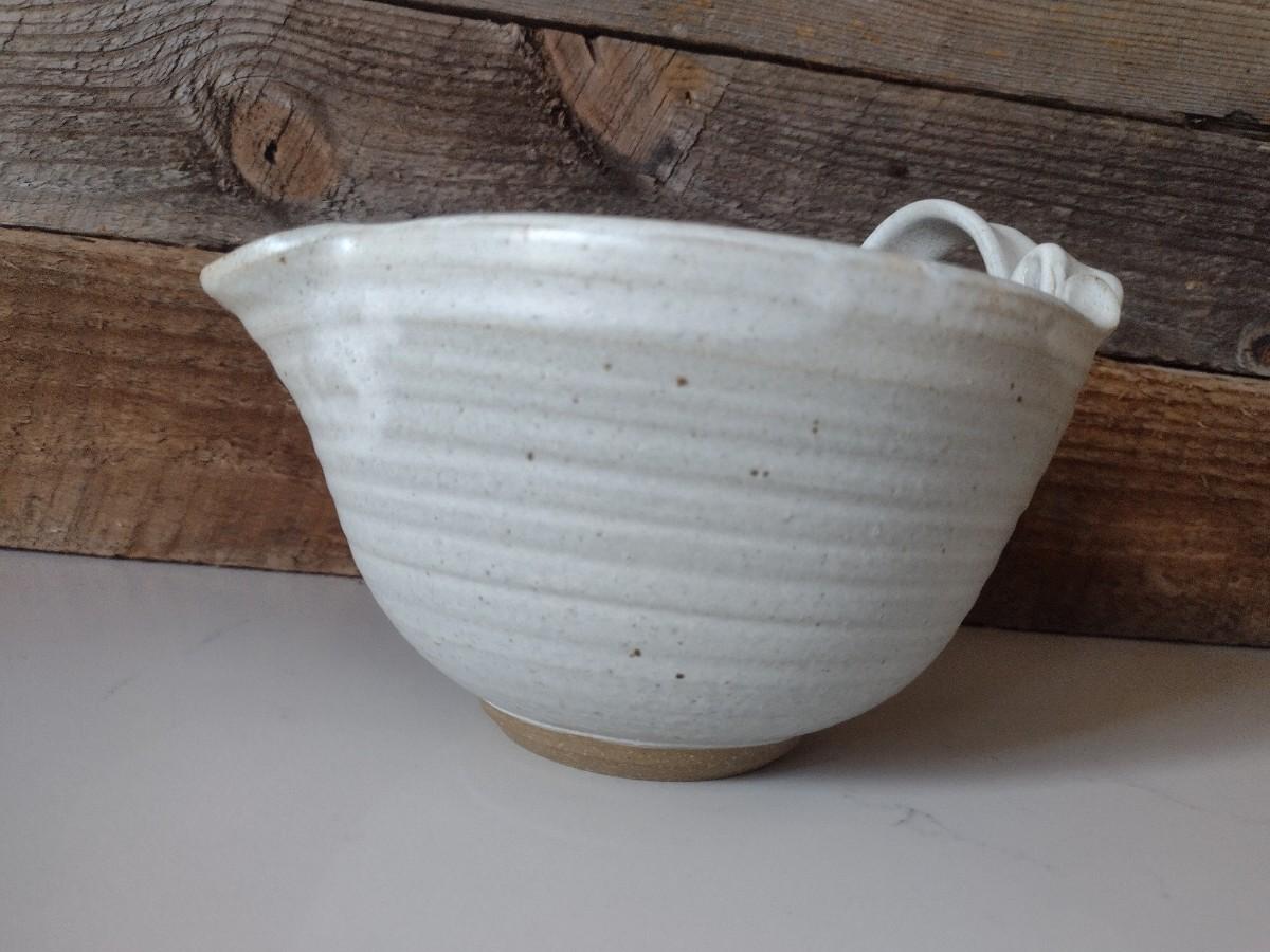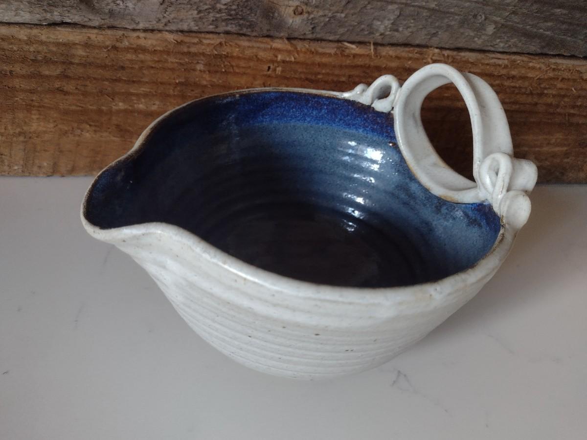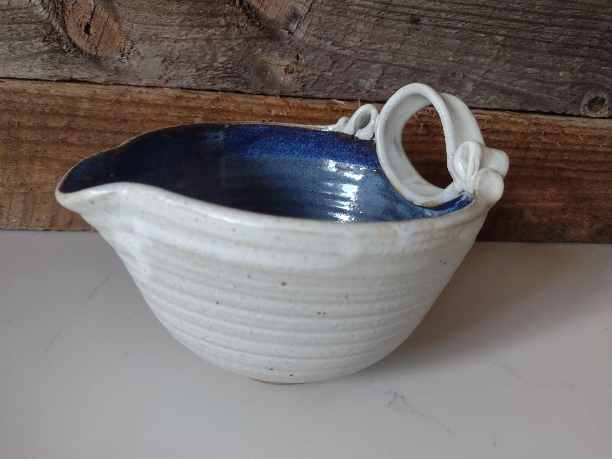 Hand Thrown Pottery White and Blue Bowl with Pour Spout and Applied Ribbon Design Handle by Fran Symes