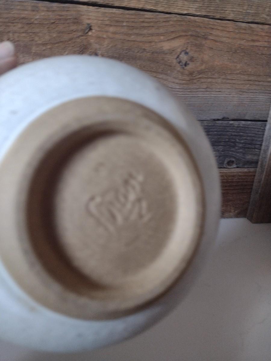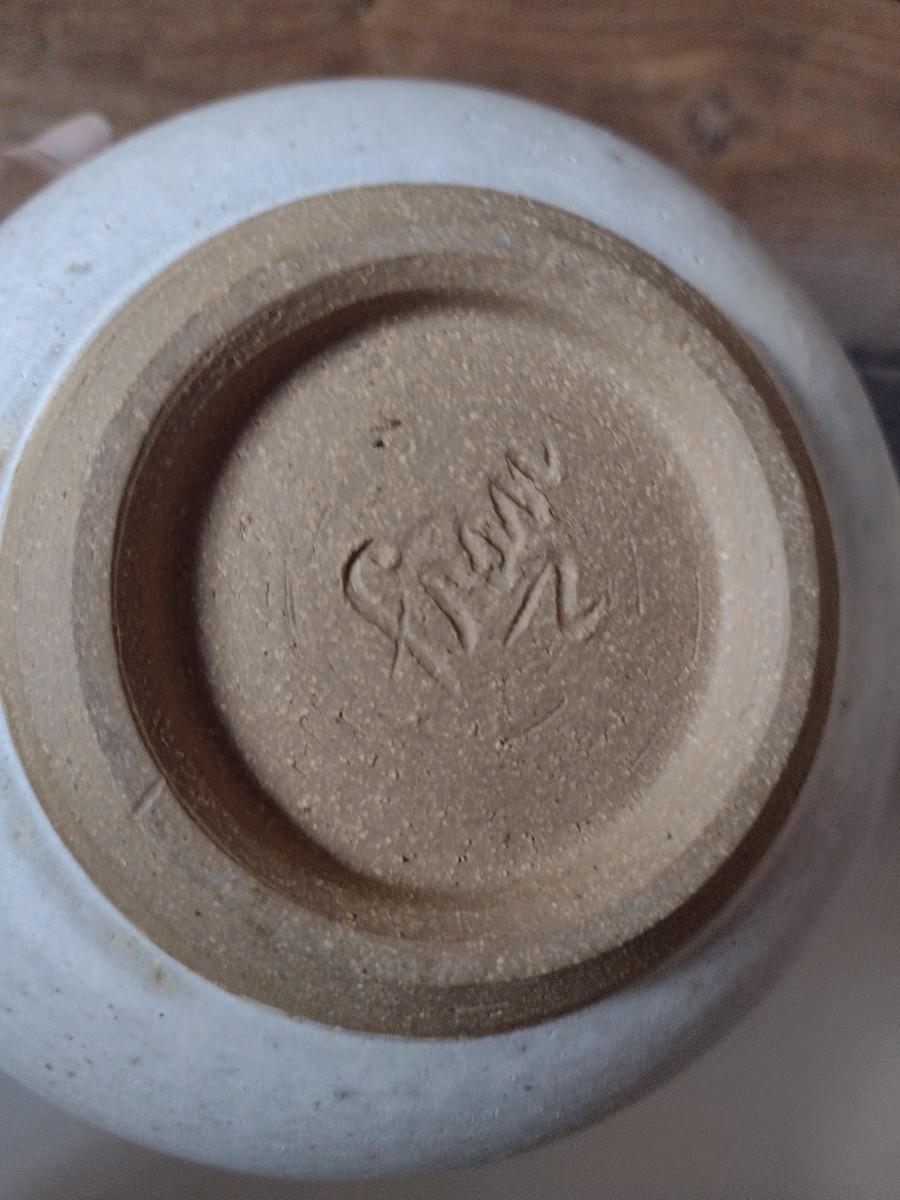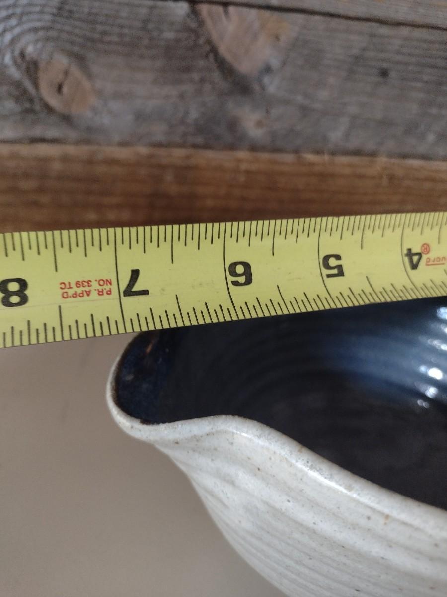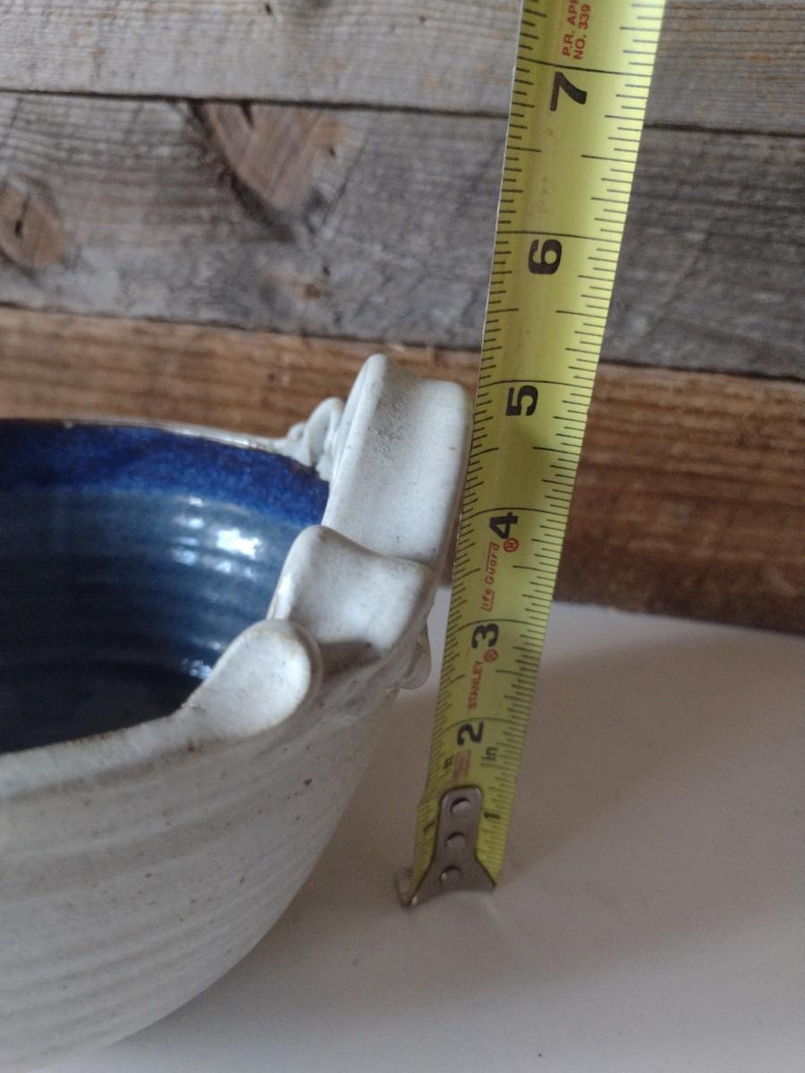 Hand Thrown Pottery White and Blue Bowl with Pour Spout and Applied Ribbon Design Handle by Fran Symes