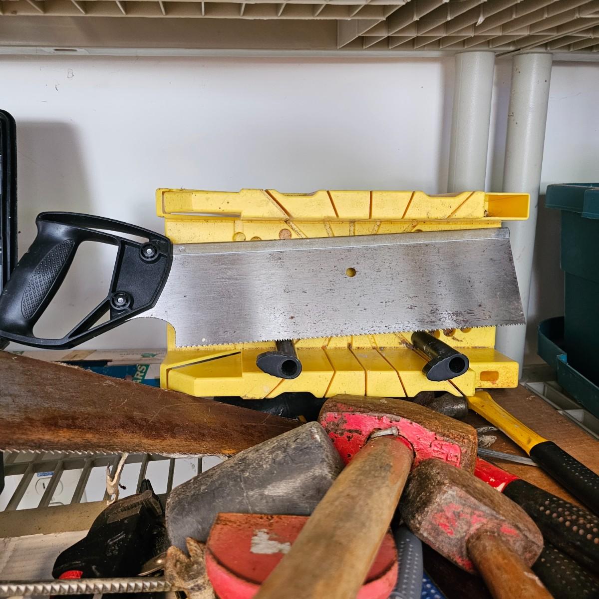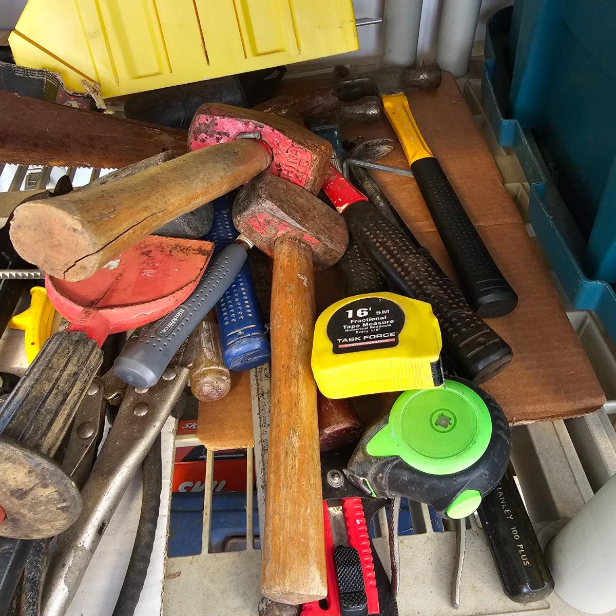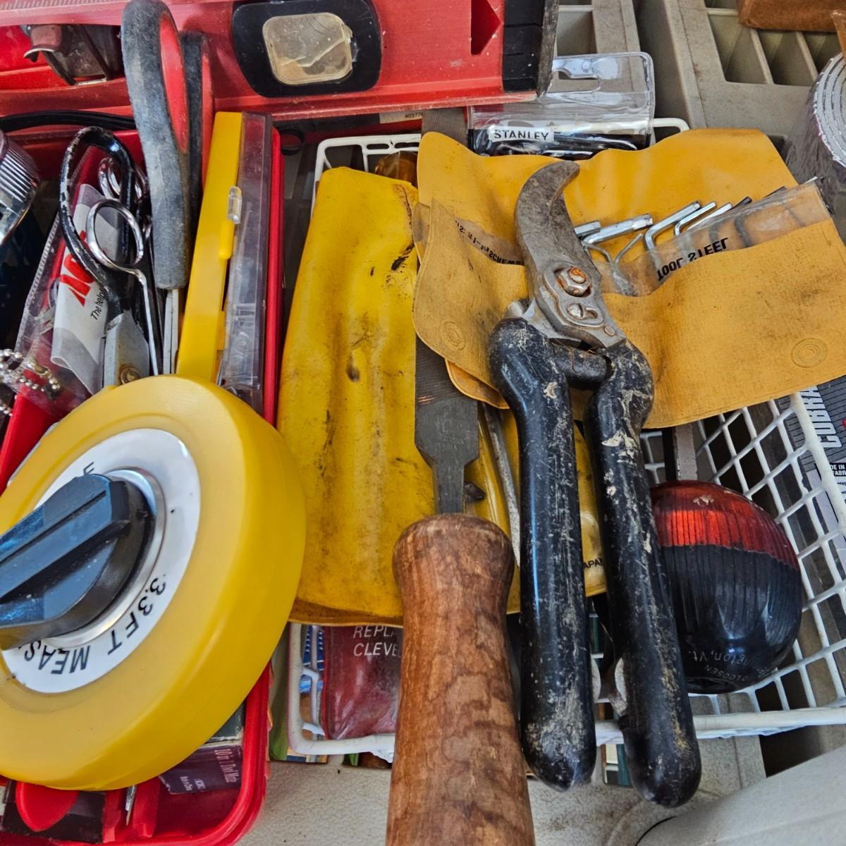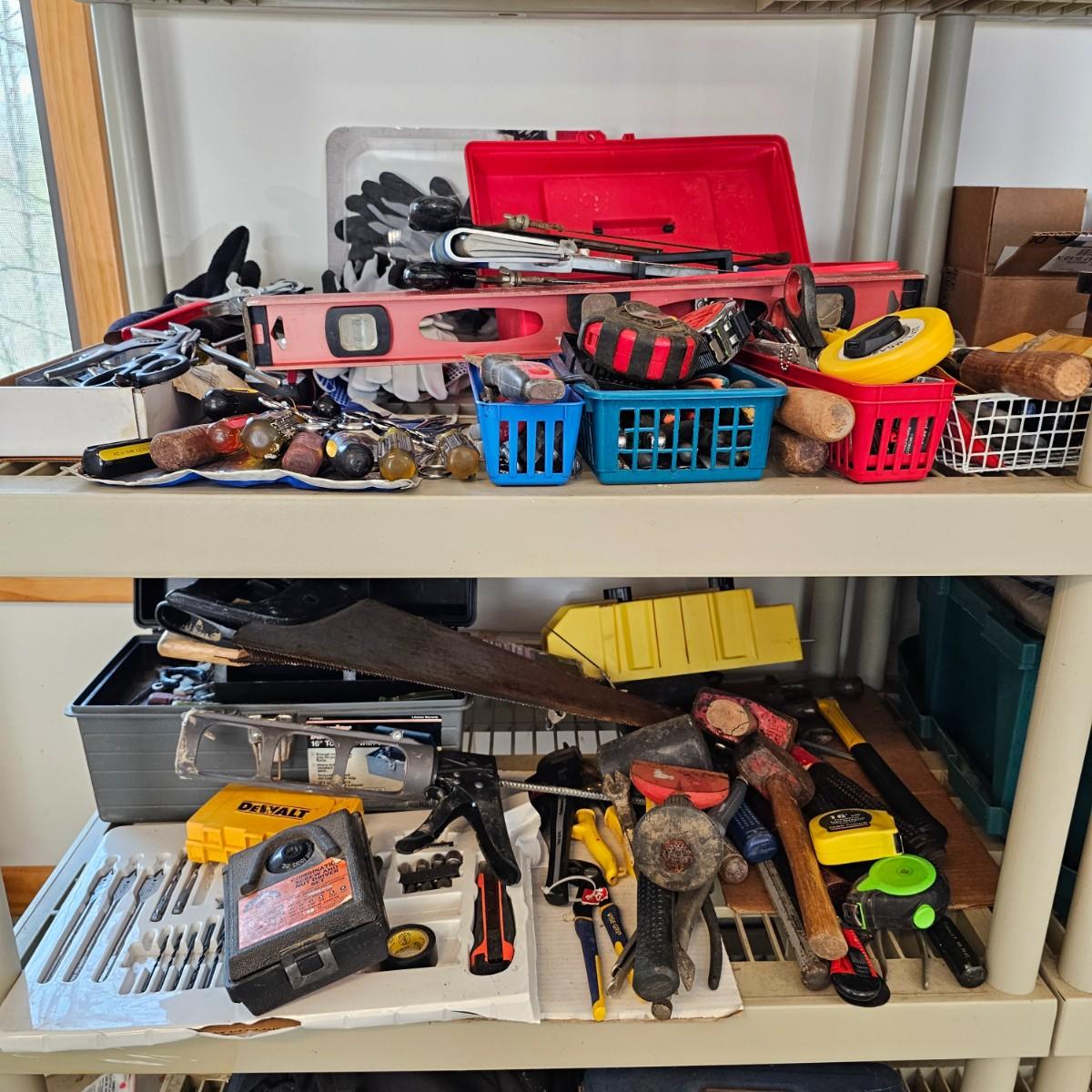 Many different types of hand tools and accessories. Hammers, screwdrivers, pliers, tape measure, etc. One miter box with saw plus three smaller hand saws. Several pair of gloves most size large. Includes two toolboxes and contents. See photos for details. Local pickup only.