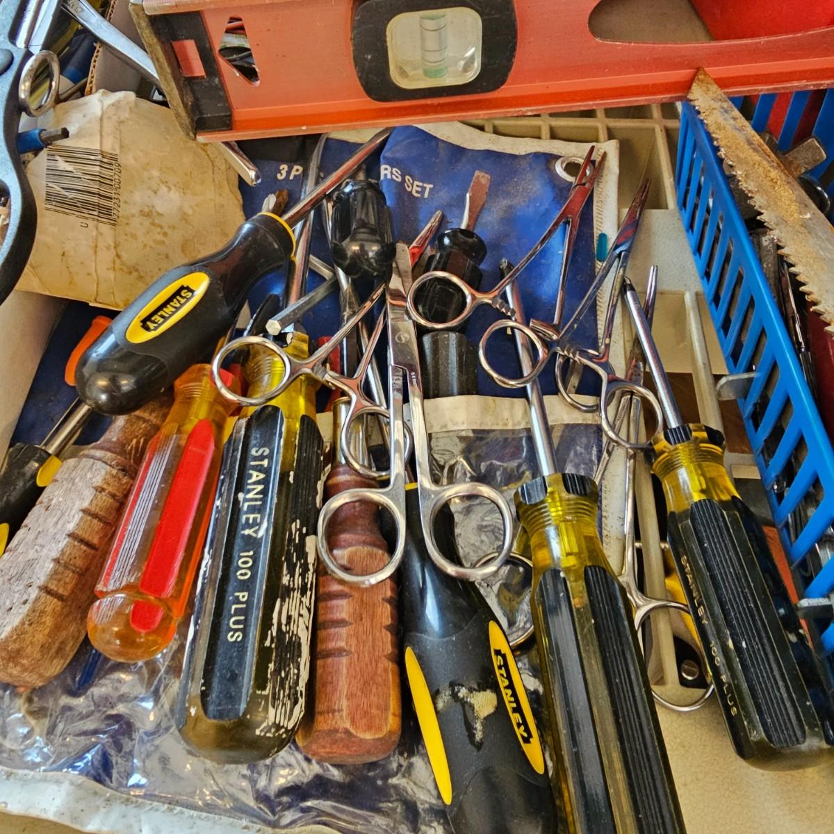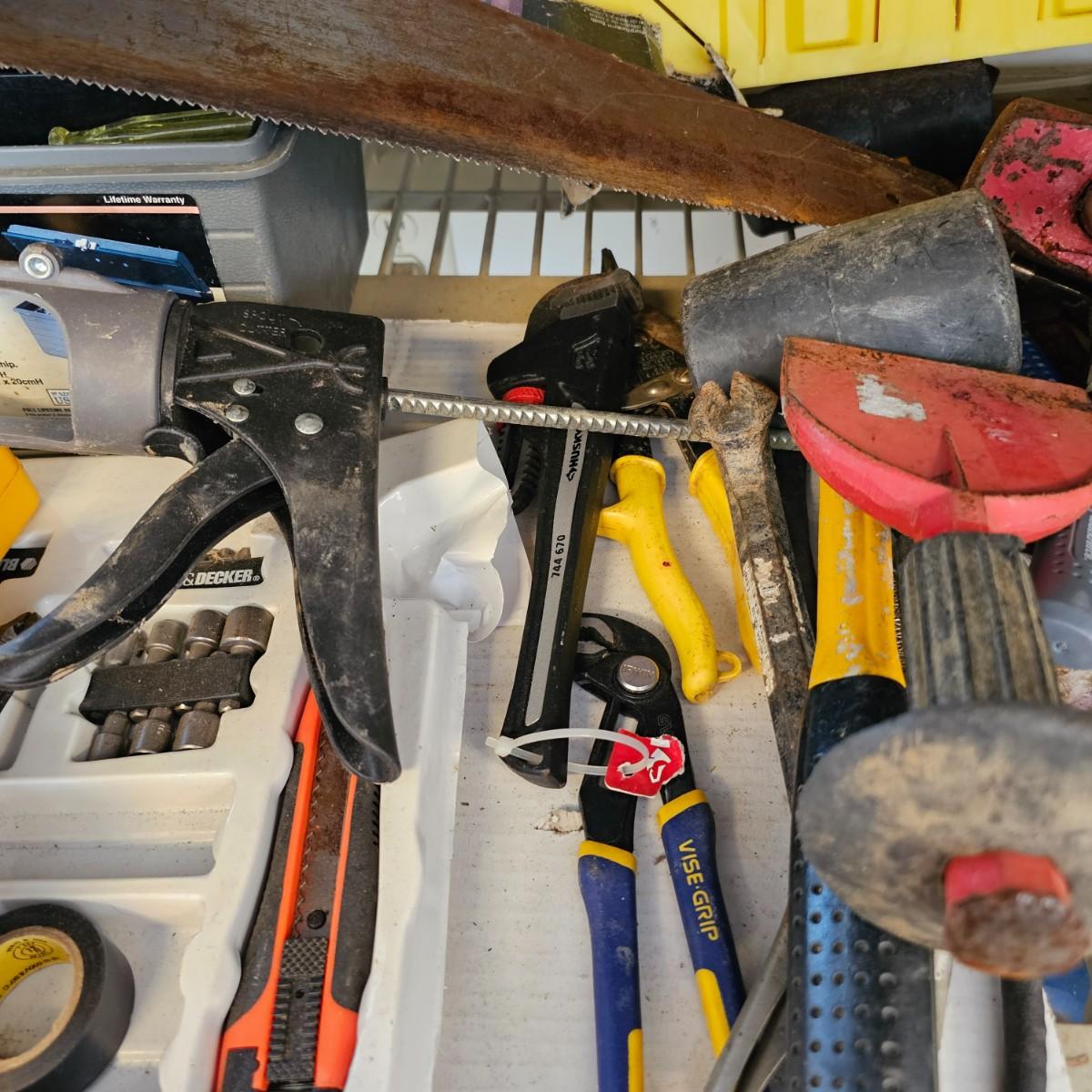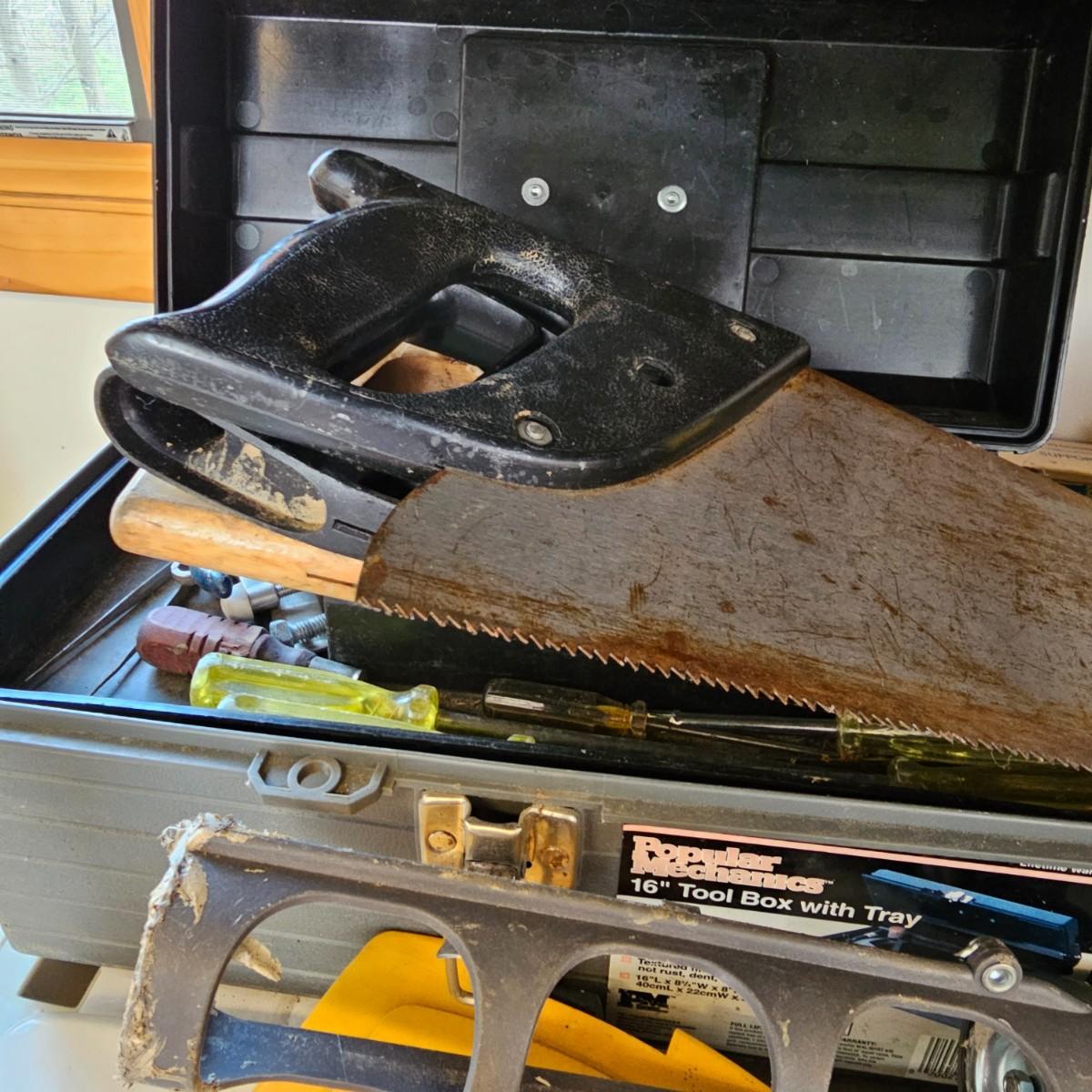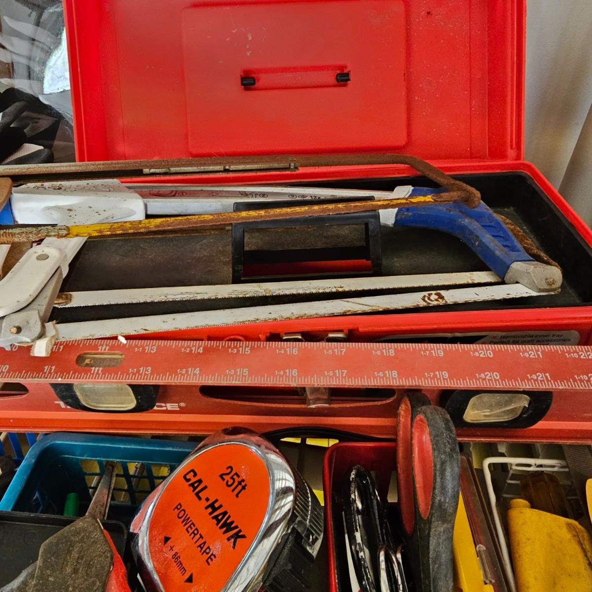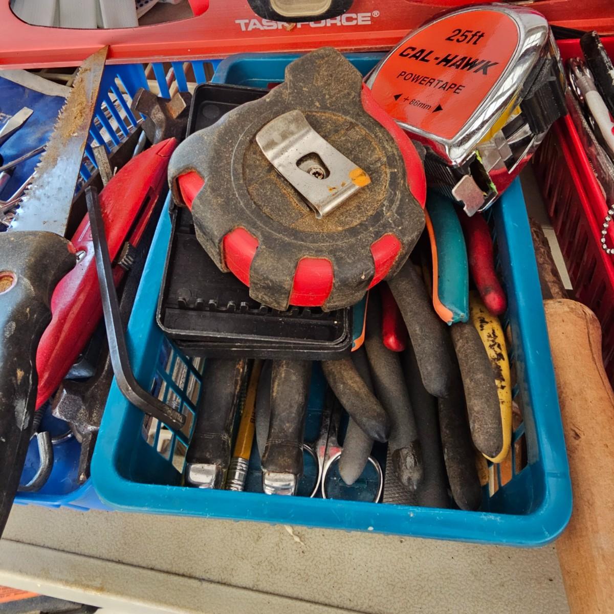 Many different types of hand tools and accessories. Hammers, screwdrivers, pliers, tape measure, etc. One miter box with saw plus three smaller hand saws. Several pair of gloves most size large. Includes two toolboxes and contents. See photos for details. Local pickup only.
