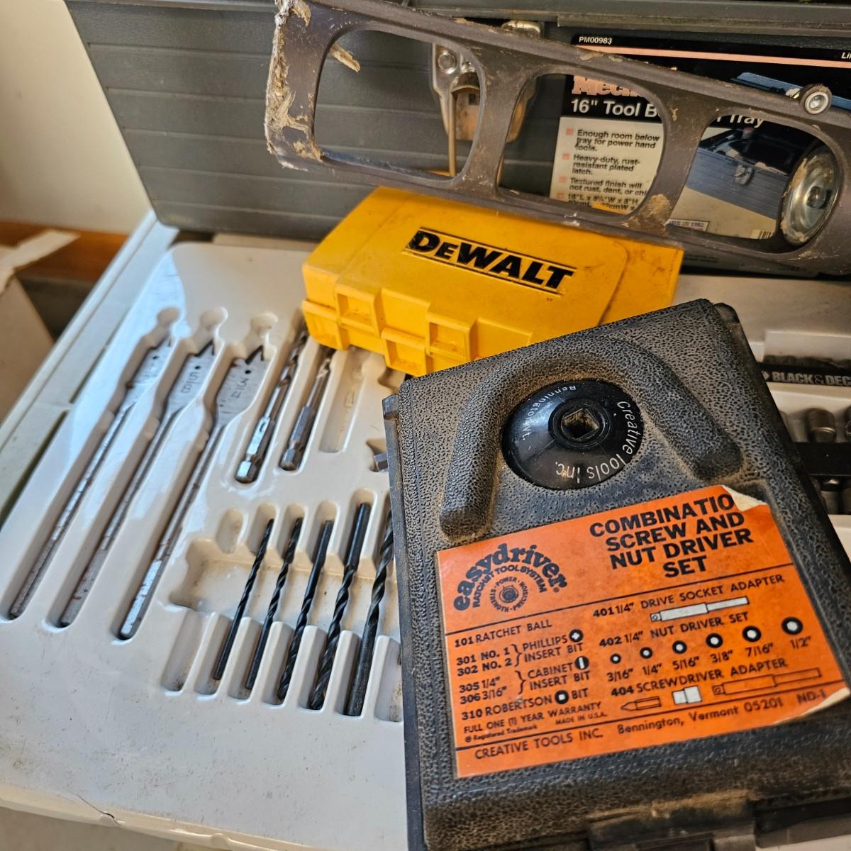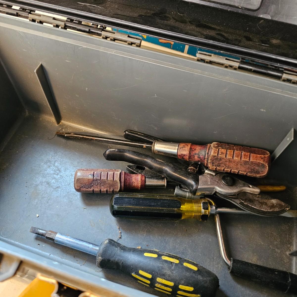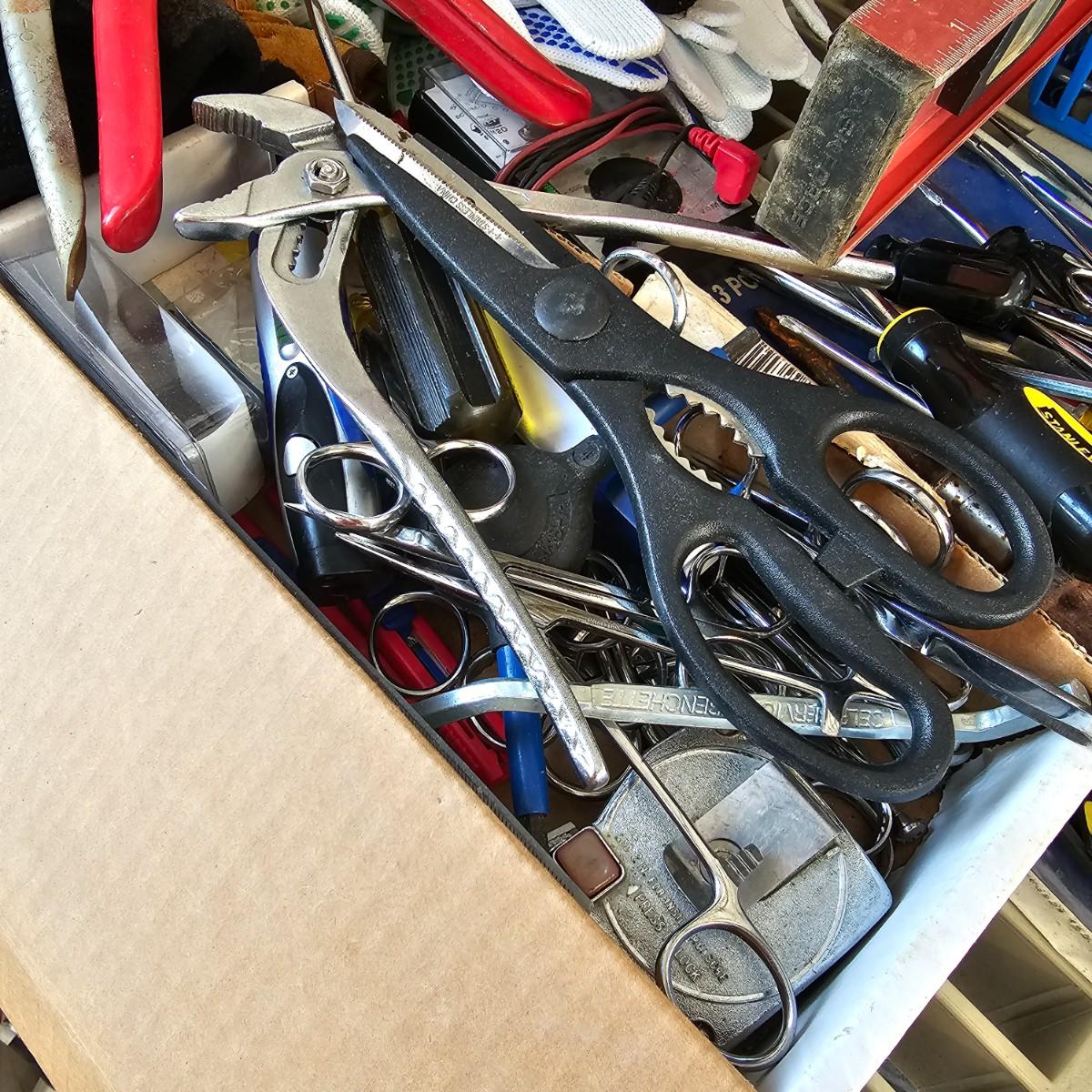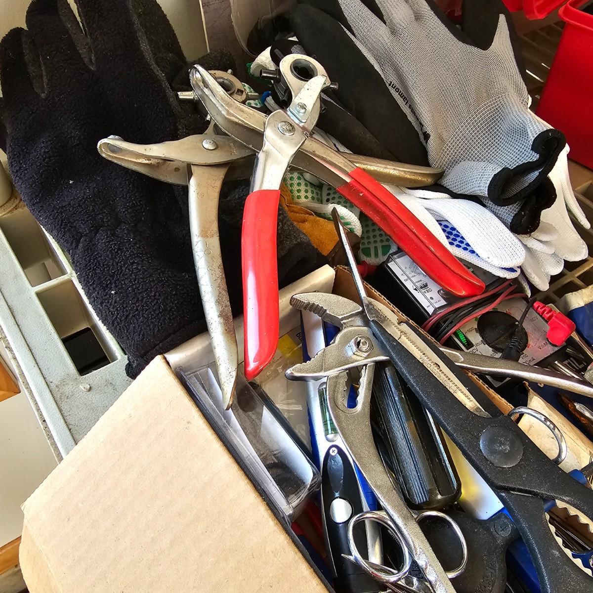 Many different types of hand tools and accessories. Hammers, screwdrivers, pliers, tape measure, etc. One miter box with saw plus three smaller hand saws. Several pair of gloves most size large. Includes two toolboxes and contents. See photos for details. Local pickup only.