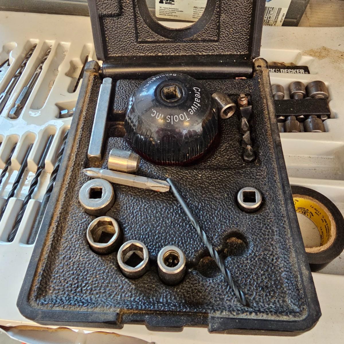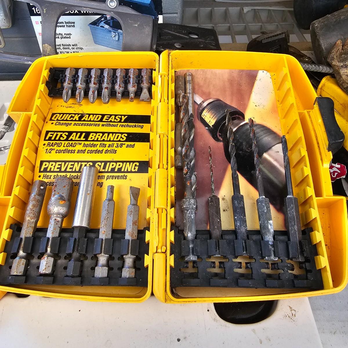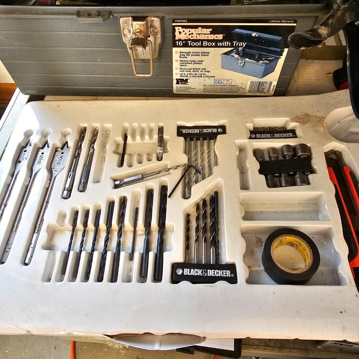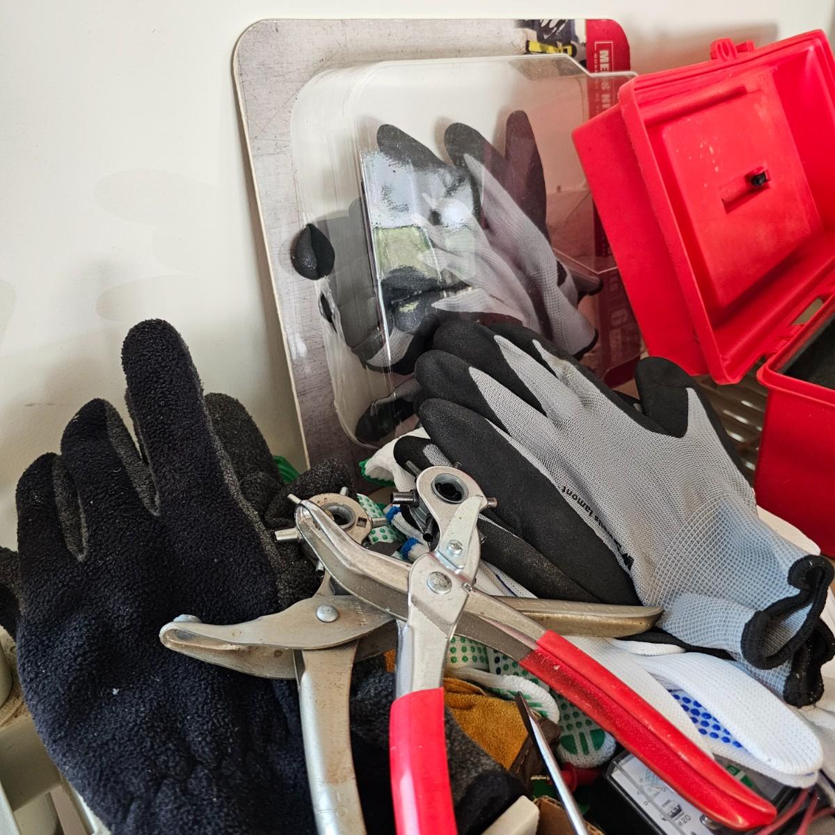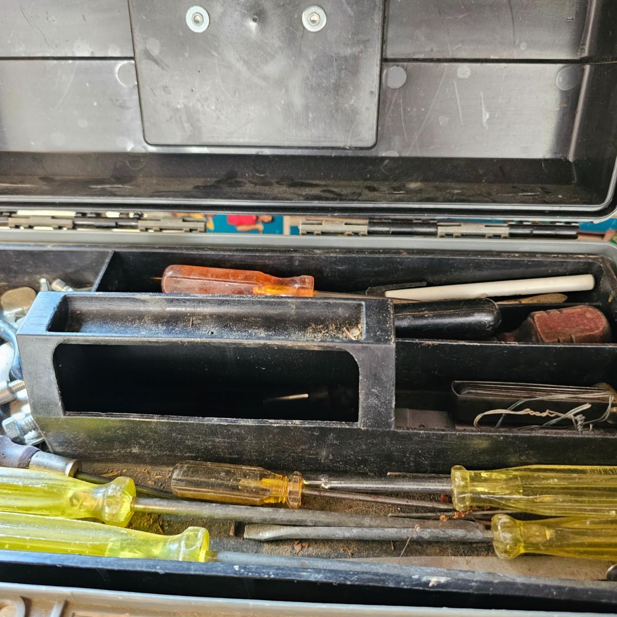 Many different types of hand tools and accessories. Hammers, screwdrivers, pliers, tape measure, etc. One miter box with saw plus three smaller hand saws. Several pair of gloves most size large. Includes two toolboxes and contents. See photos for details. Local pickup only.