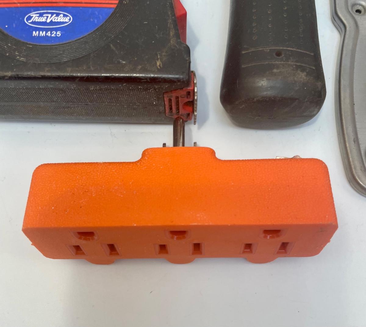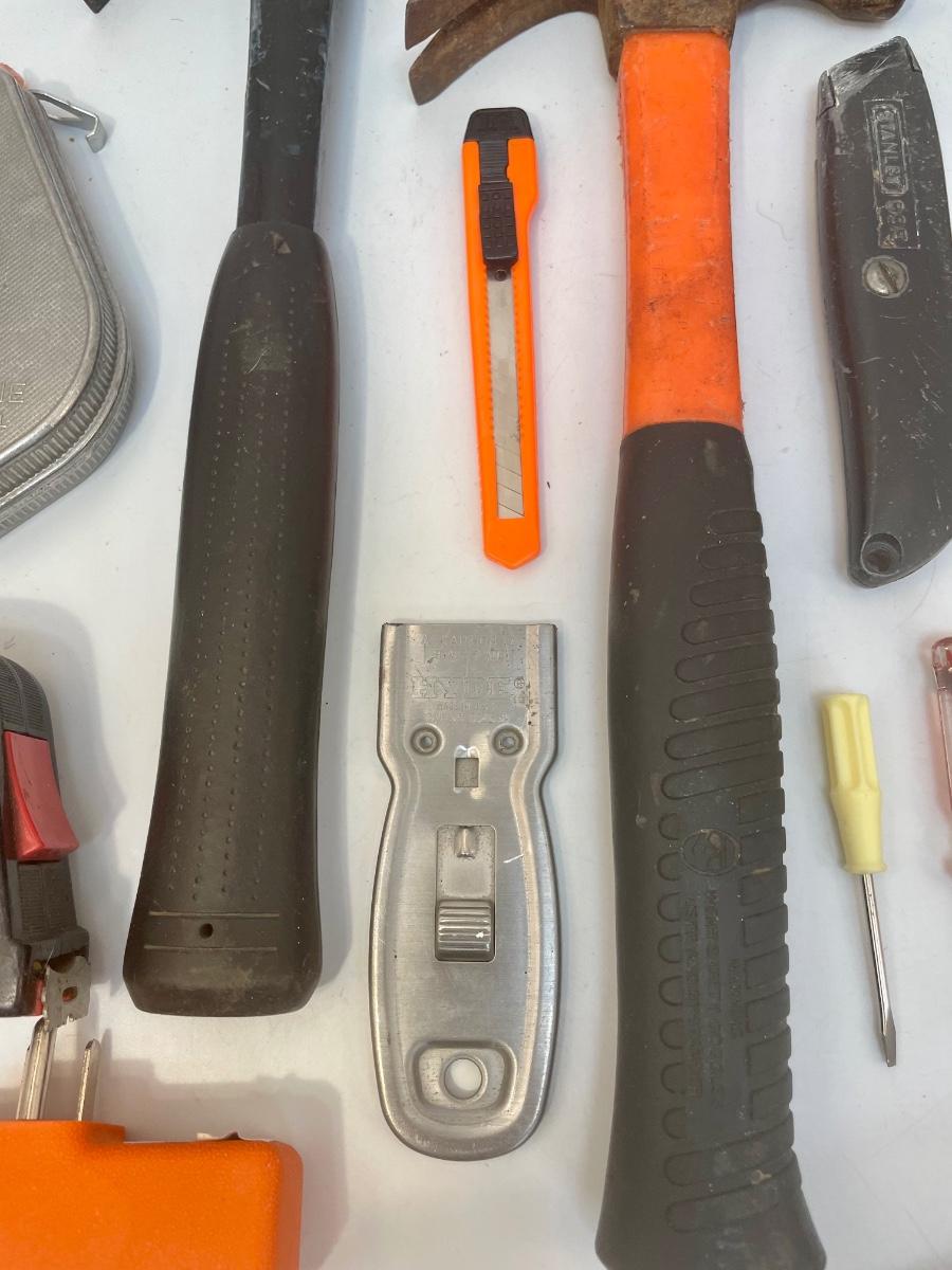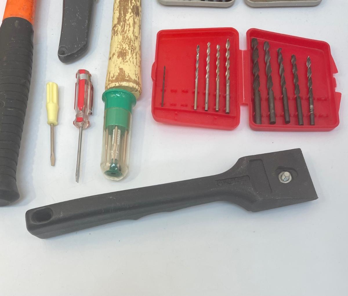Lot of tools: 2 regular hammers, 1 tack hammer, box knife, pocket-size box knife, razor scraper, 25’ tape measure, chalk line reel, 15-piece set of Allen wrenches, 10-piece drill bit set, 2 small screwdrivers, set of micro screwdrivers, orange outlet 1 to 3 splitter, paint scraper.