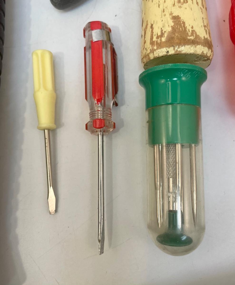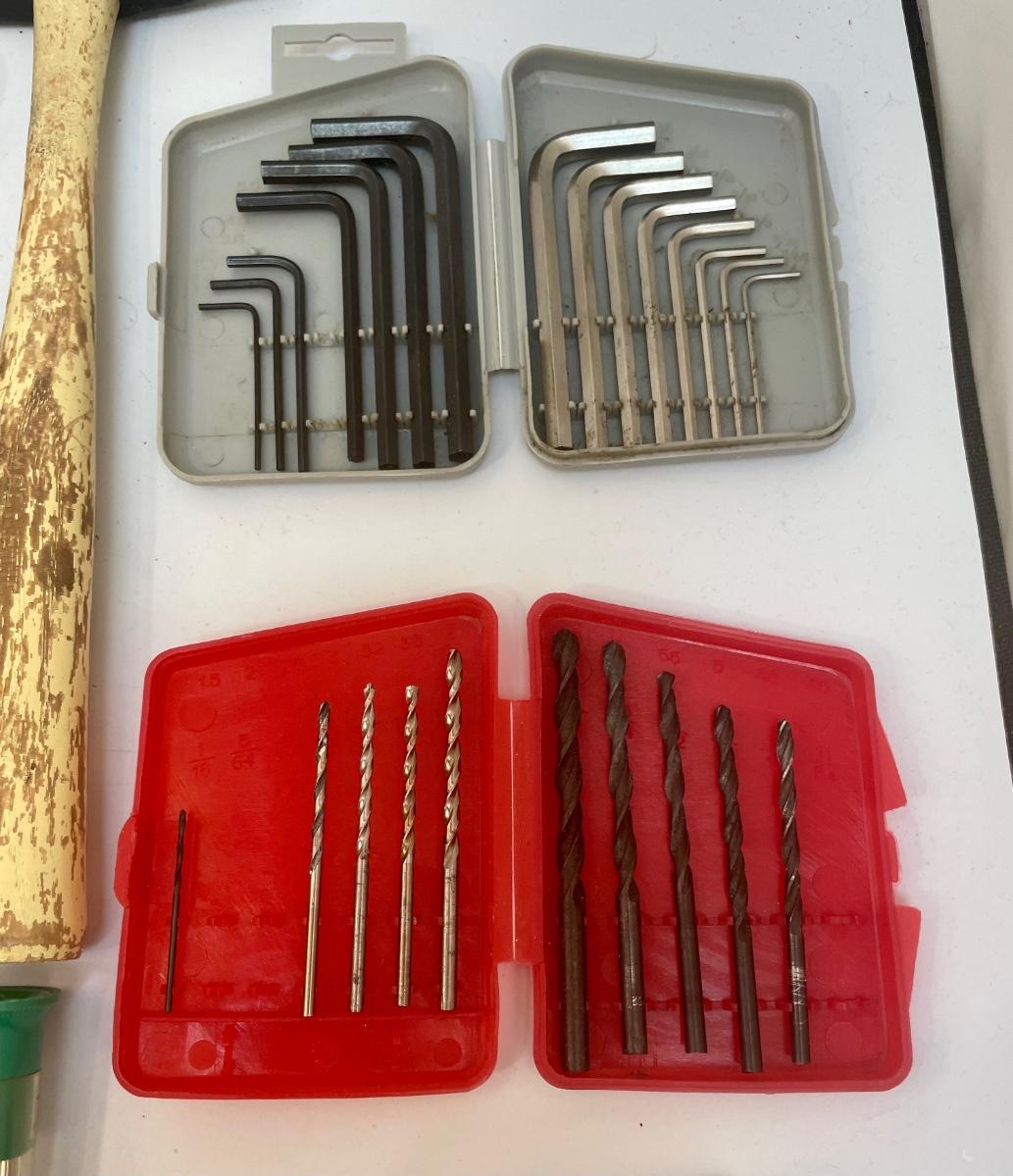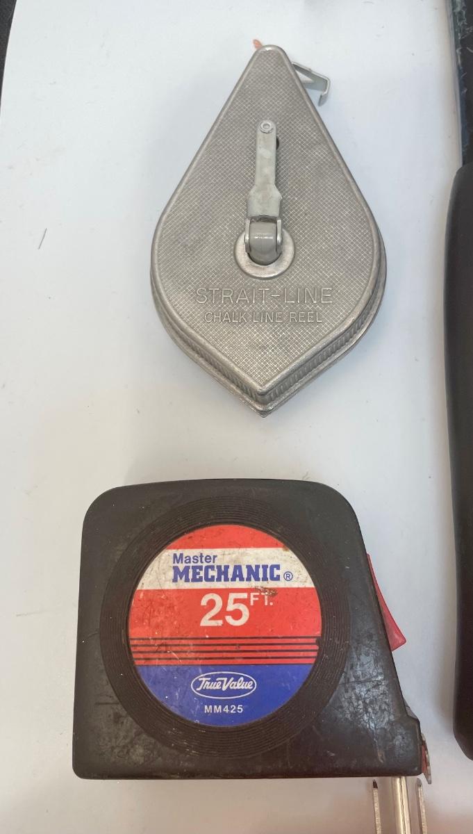 Lot of tools: 2 regular hammers, 1 tack hammer, box knife, pocket-size box knife, razor scraper, 25’ tape measure, chalk line reel, 15-piece set of Allen wrenches, 10-piece drill bit set, 2 small screwdrivers, set of micro screwdrivers, orange outlet 1 to 3 splitter, paint scraper.