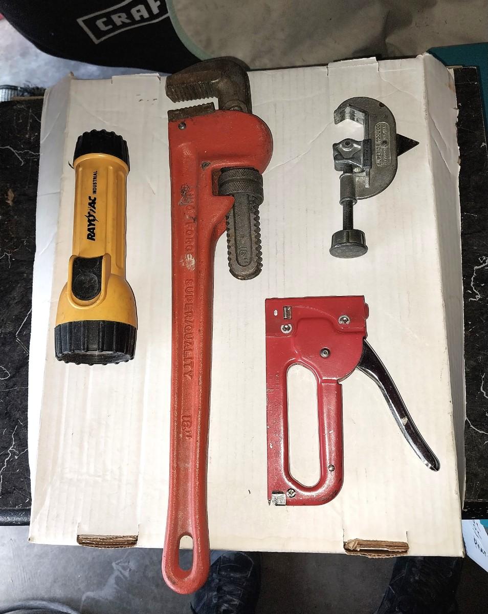 HAND TOOLS PIPE WRENCH-PIPE CUTTER-STAPLER AND FLASHLIGHT