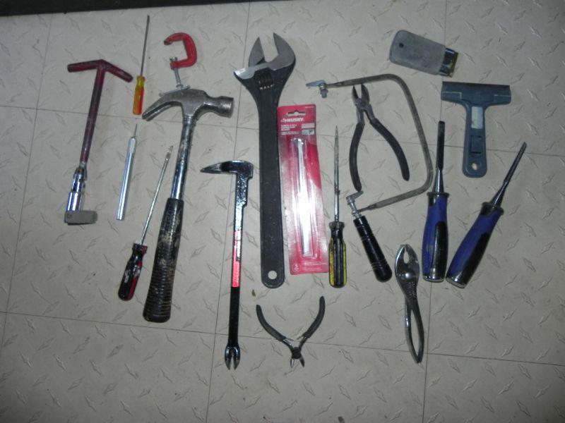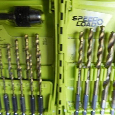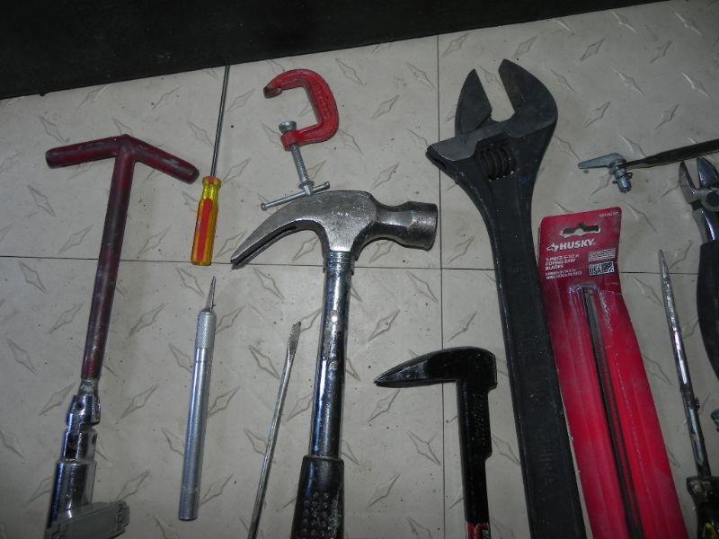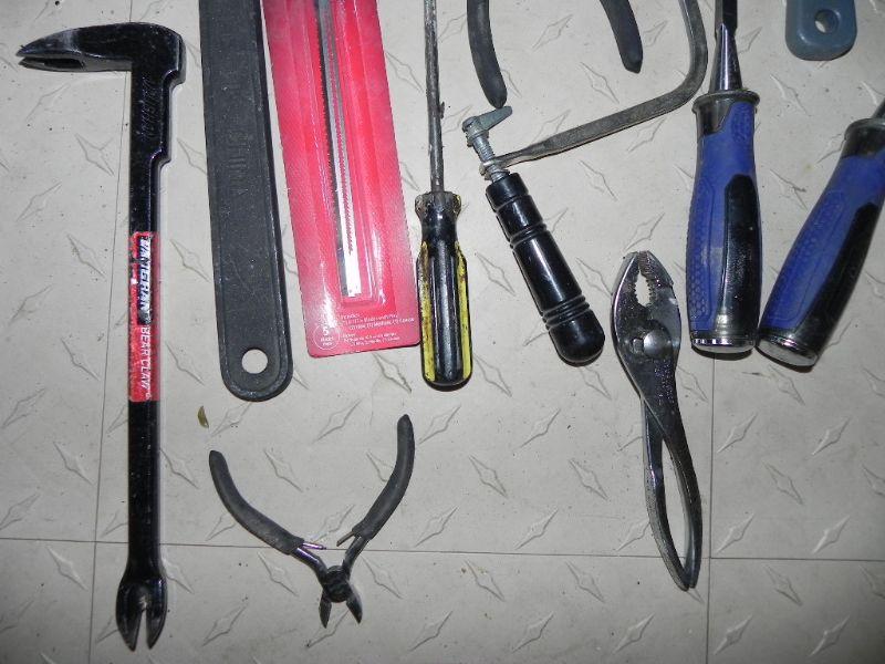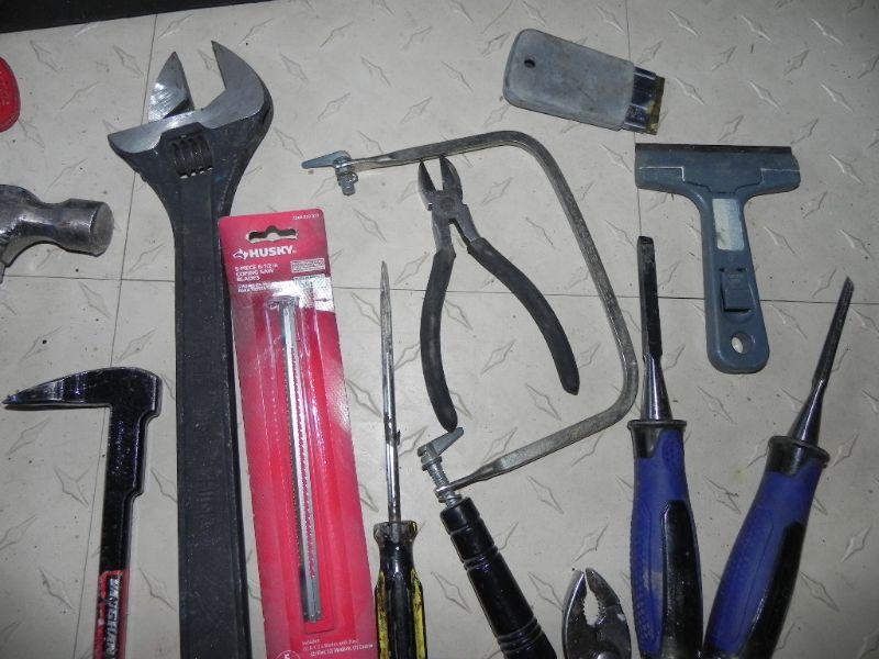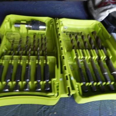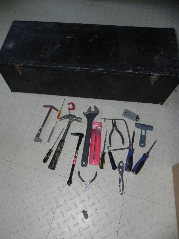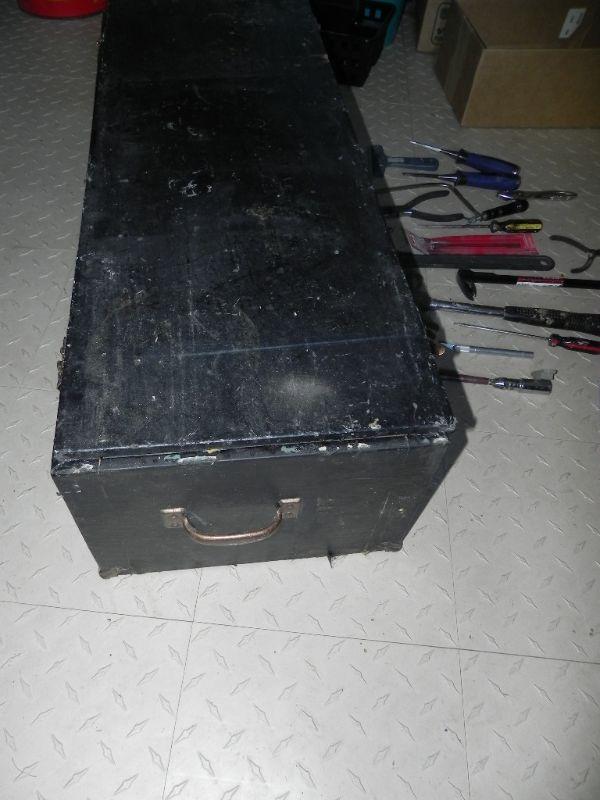 WOODEN BOX LINED WITH CARPET (38" X 14" X 10") HAND TOOLS & QUICK LOAD DRILL BITS