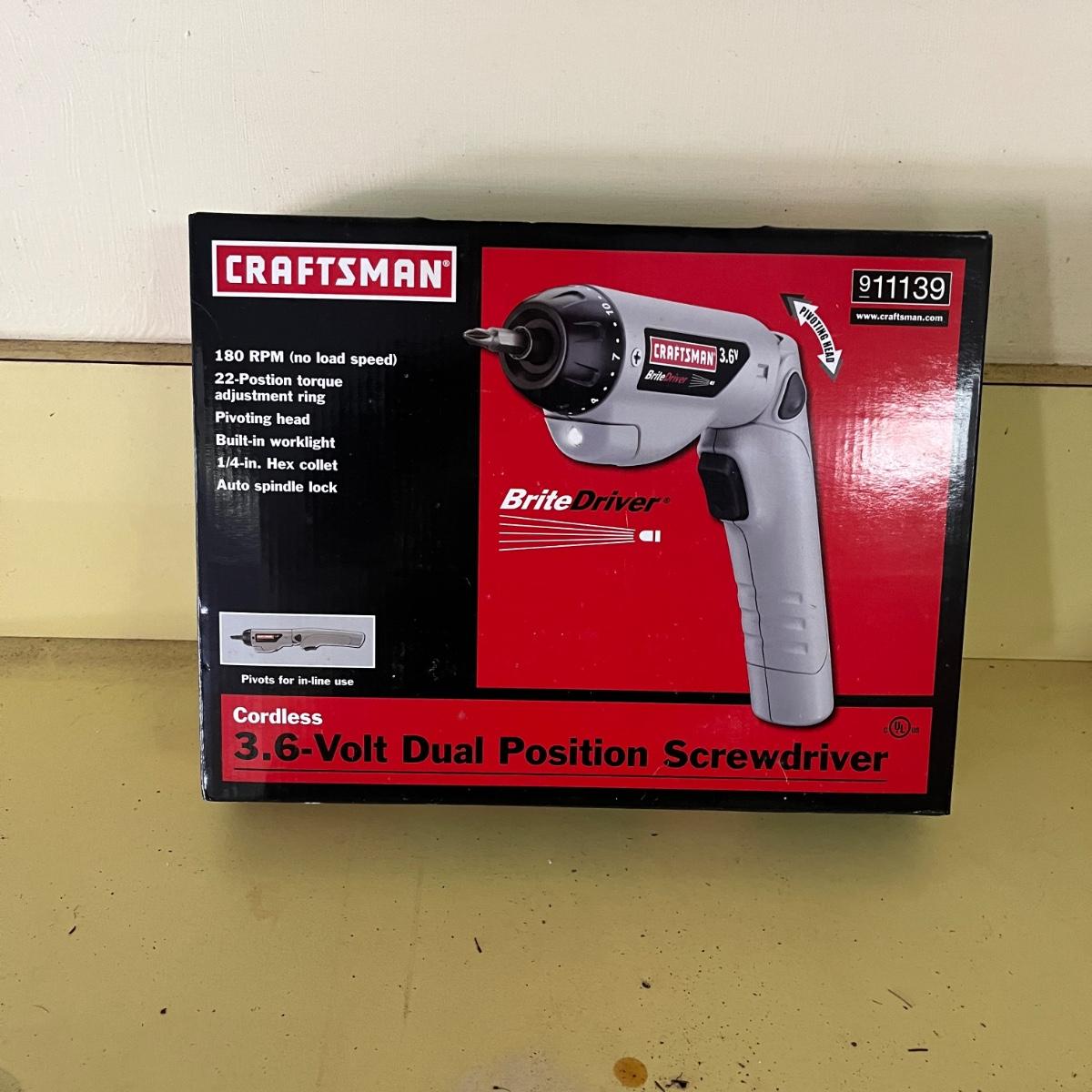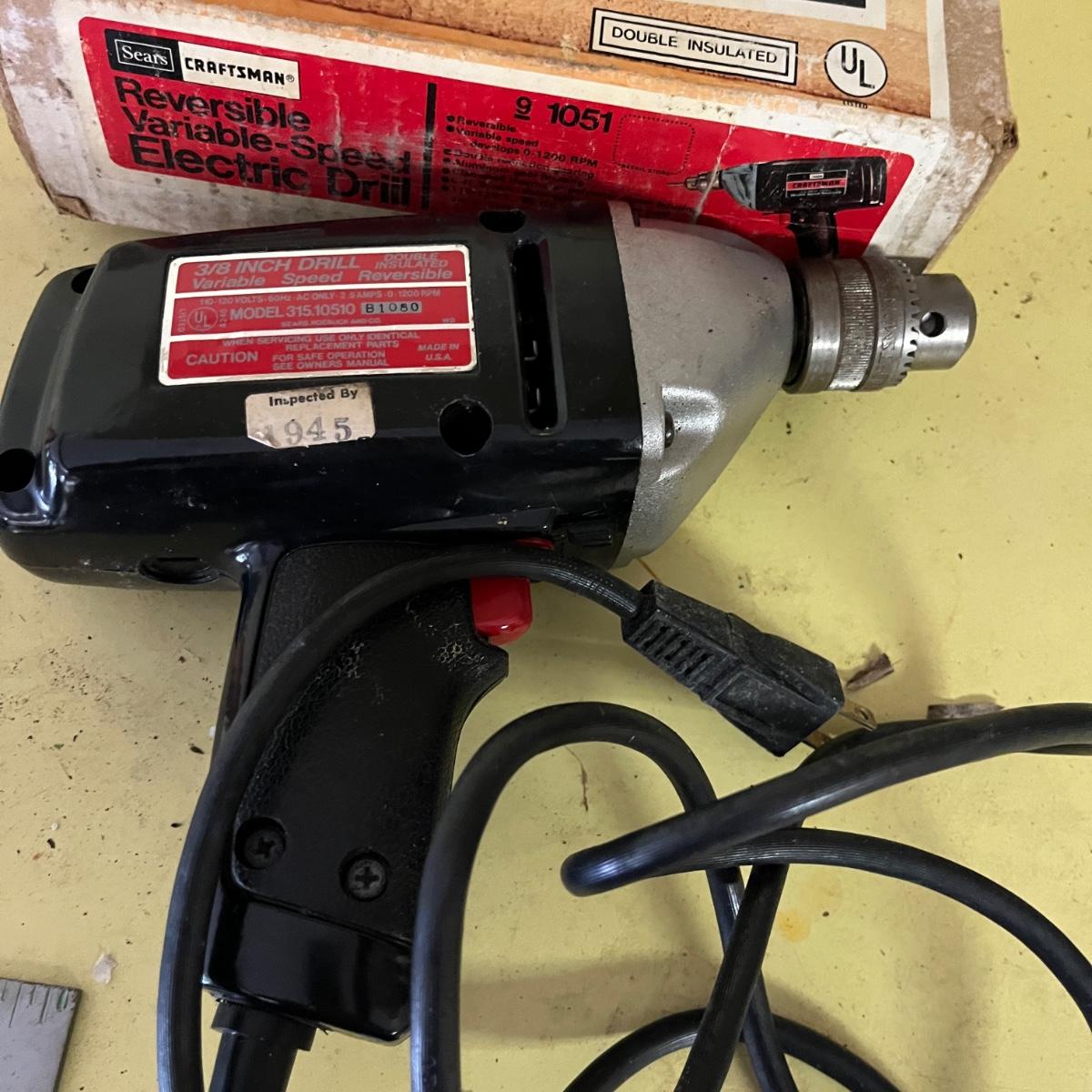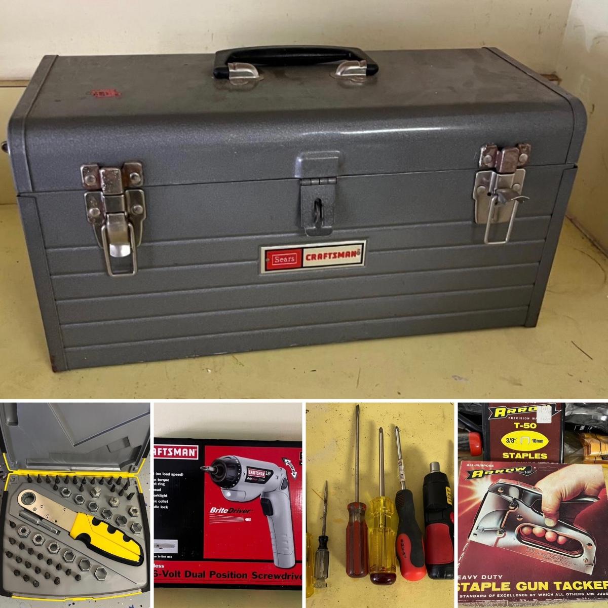Lot includes Craftsman metal toolbox, Craftsman drill, wrenches, screwdrivers, powered screwdriver, stapler, hand drill, screws and more hardware. Toolbox measures 8”x 18” x 10”H. Please see photos for inventory.
