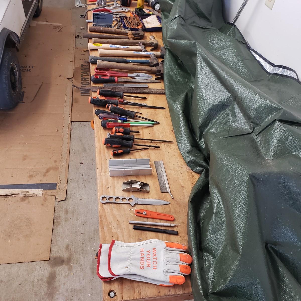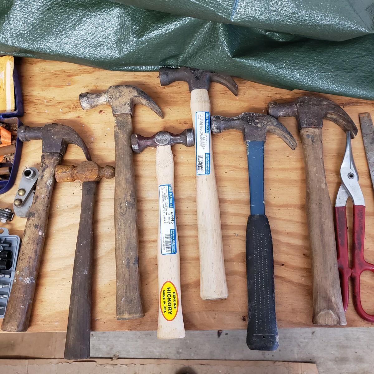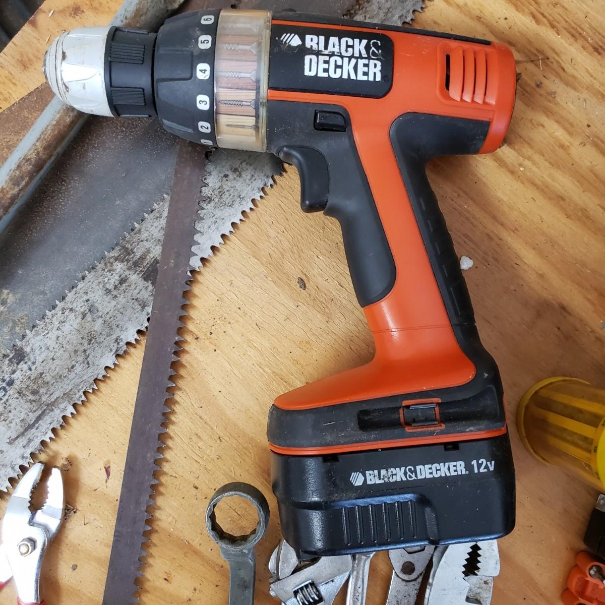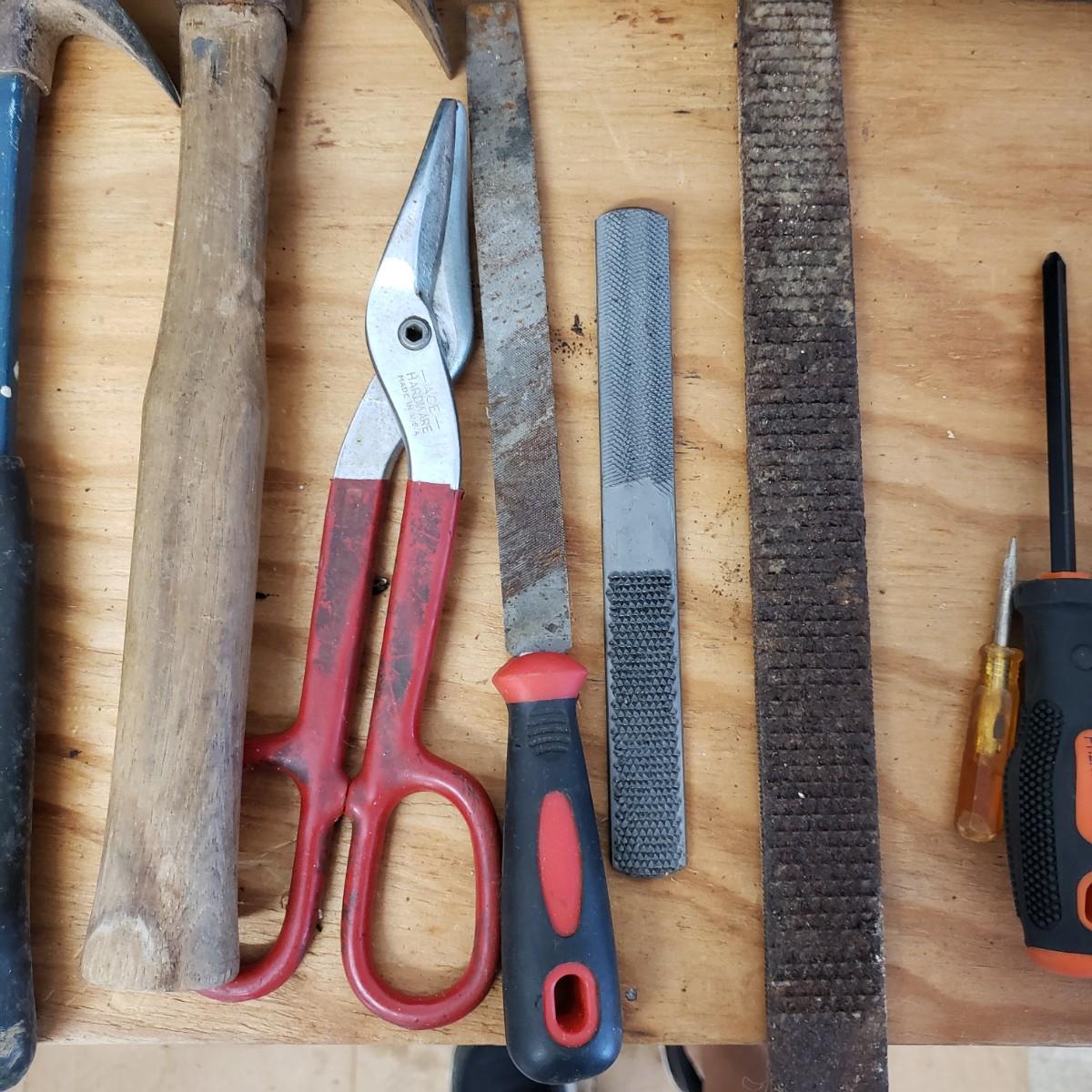 Lot includes several hand tools including gloves, to exacto knives, screwdrivers, hammers, drill bits and wrenches. There are also three saws. The Black and Decker battery operated drill comes with a battery, but no charger. The drill did work when battery is in it.