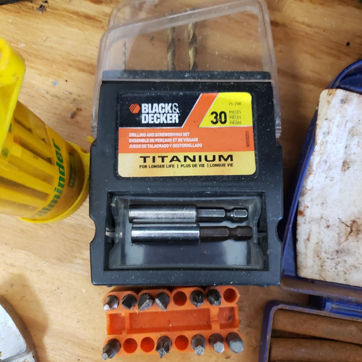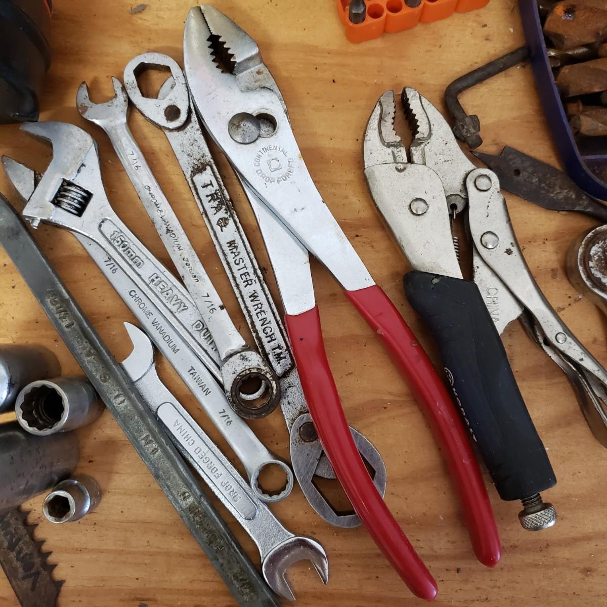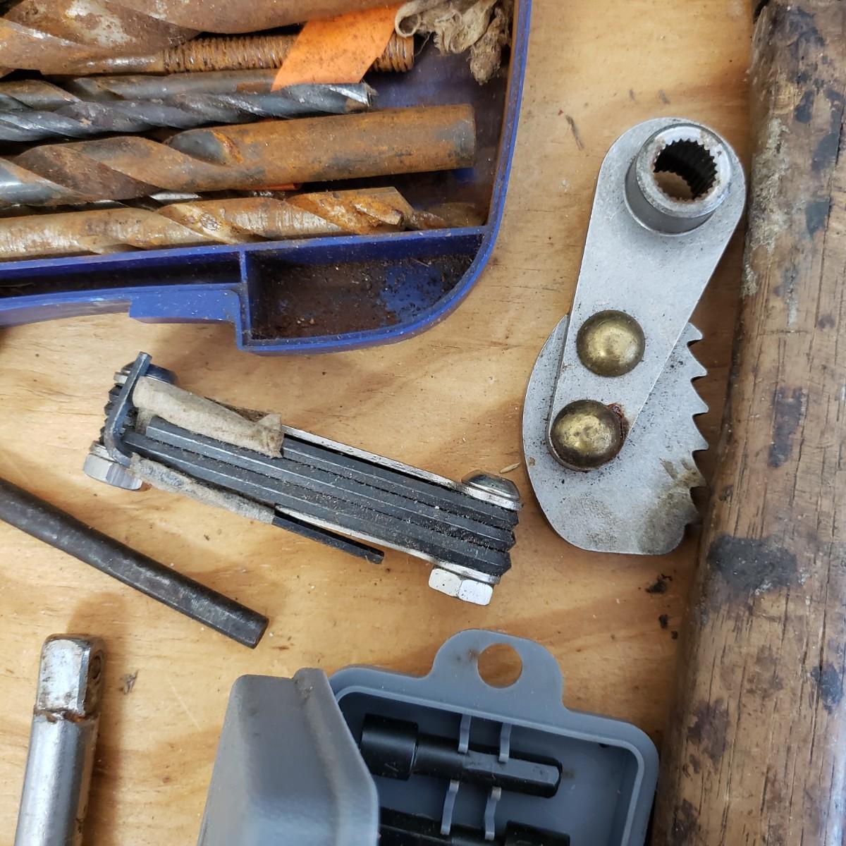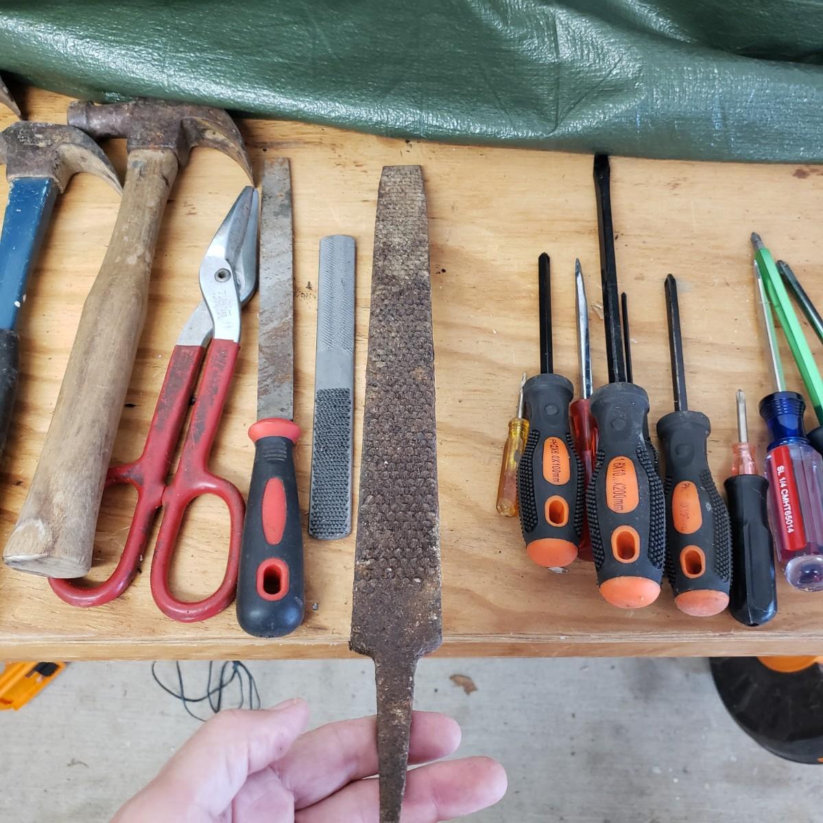 Lot includes several hand tools including gloves, to exacto knives, screwdrivers, hammers, drill bits and wrenches. There are also three saws. The Black and Decker battery operated drill comes with a battery, but no charger. The drill did work when battery is in it.
