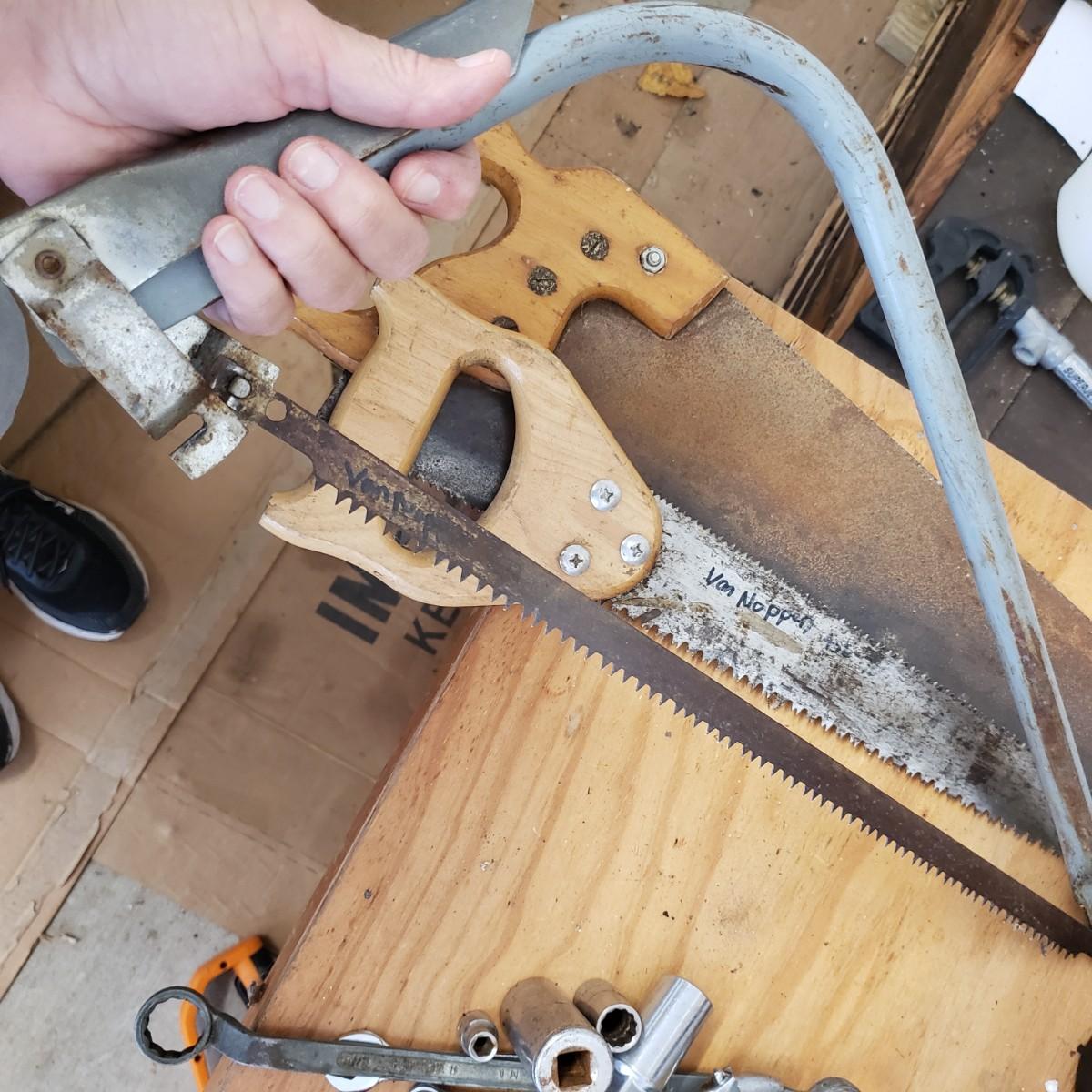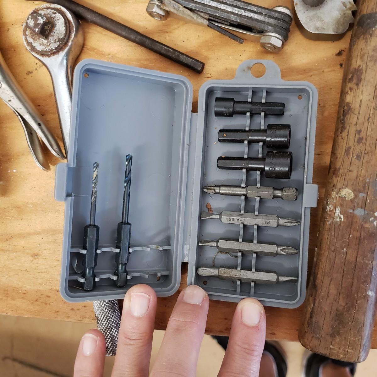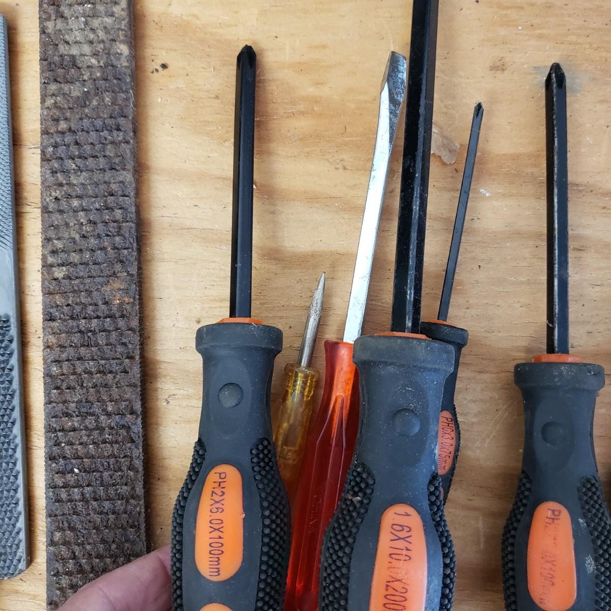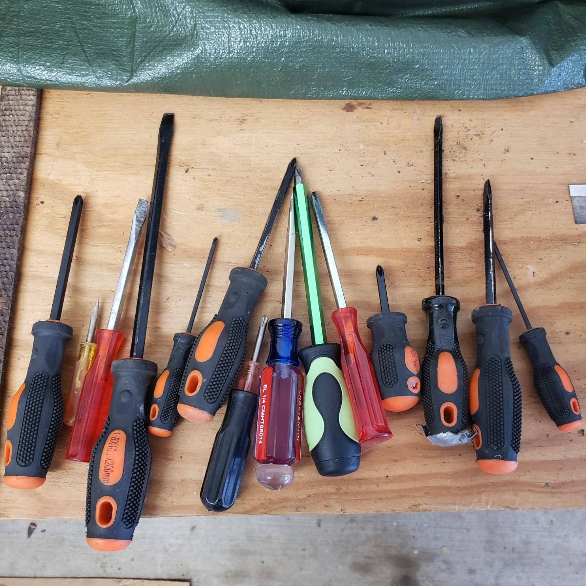 Lot includes several hand tools including gloves, to exacto knives, screwdrivers, hammers, drill bits and wrenches. There are also three saws. The Black and Decker battery operated drill comes with a battery, but no charger. The drill did work when battery is in it.