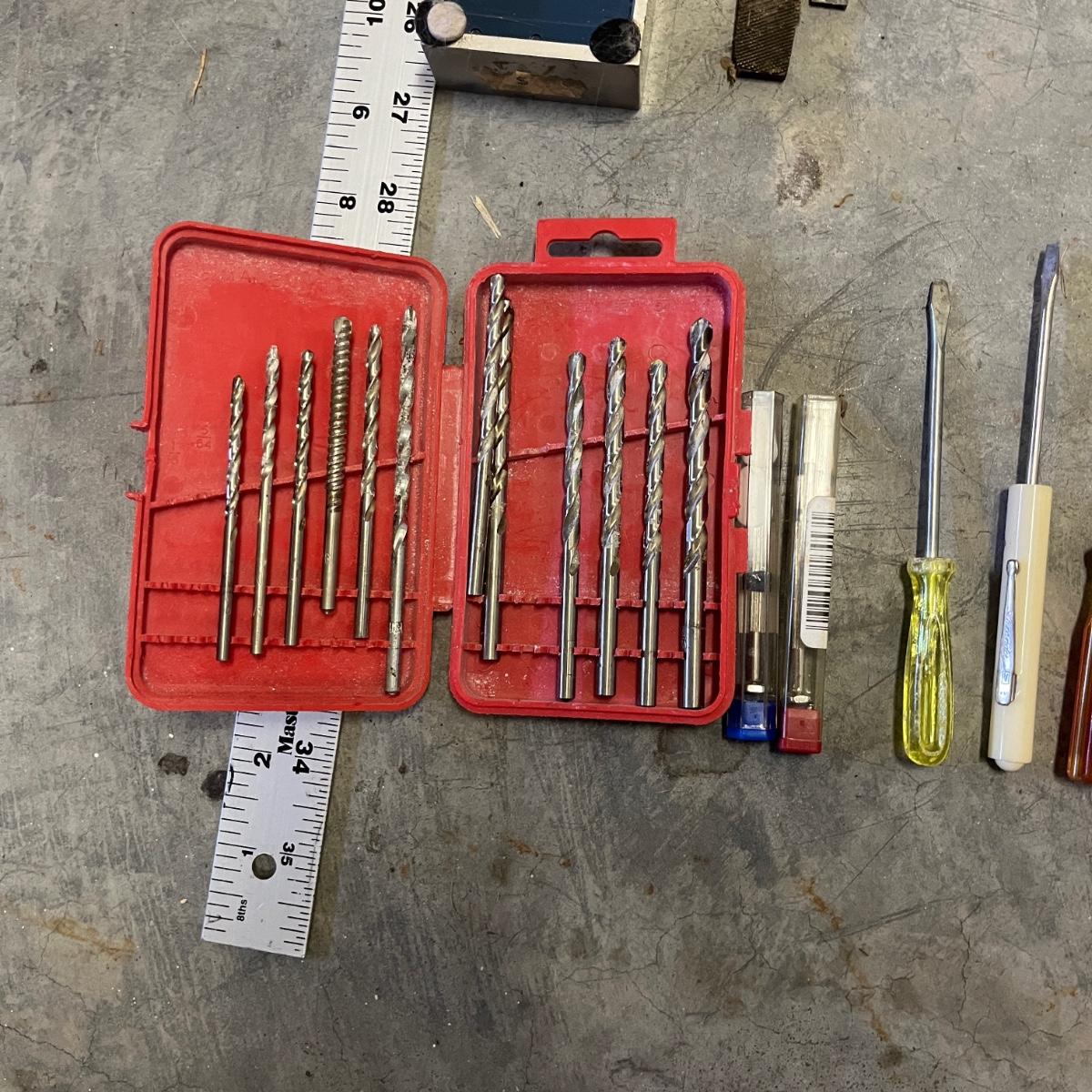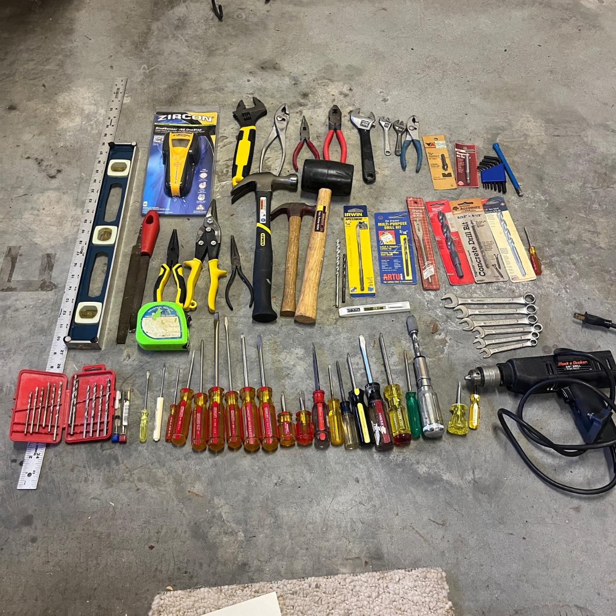 Lot contains a selection of hand tools that includes screws Phillips and flathead screwdrivers, drill bits, adjustable wrenches, pliers, level, drill bits, Black & Decker 3/8” drill and more. Please see photos for inventory.