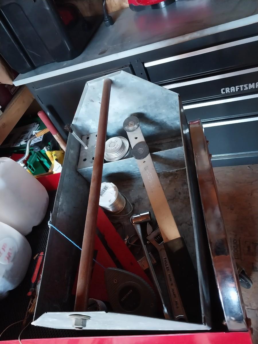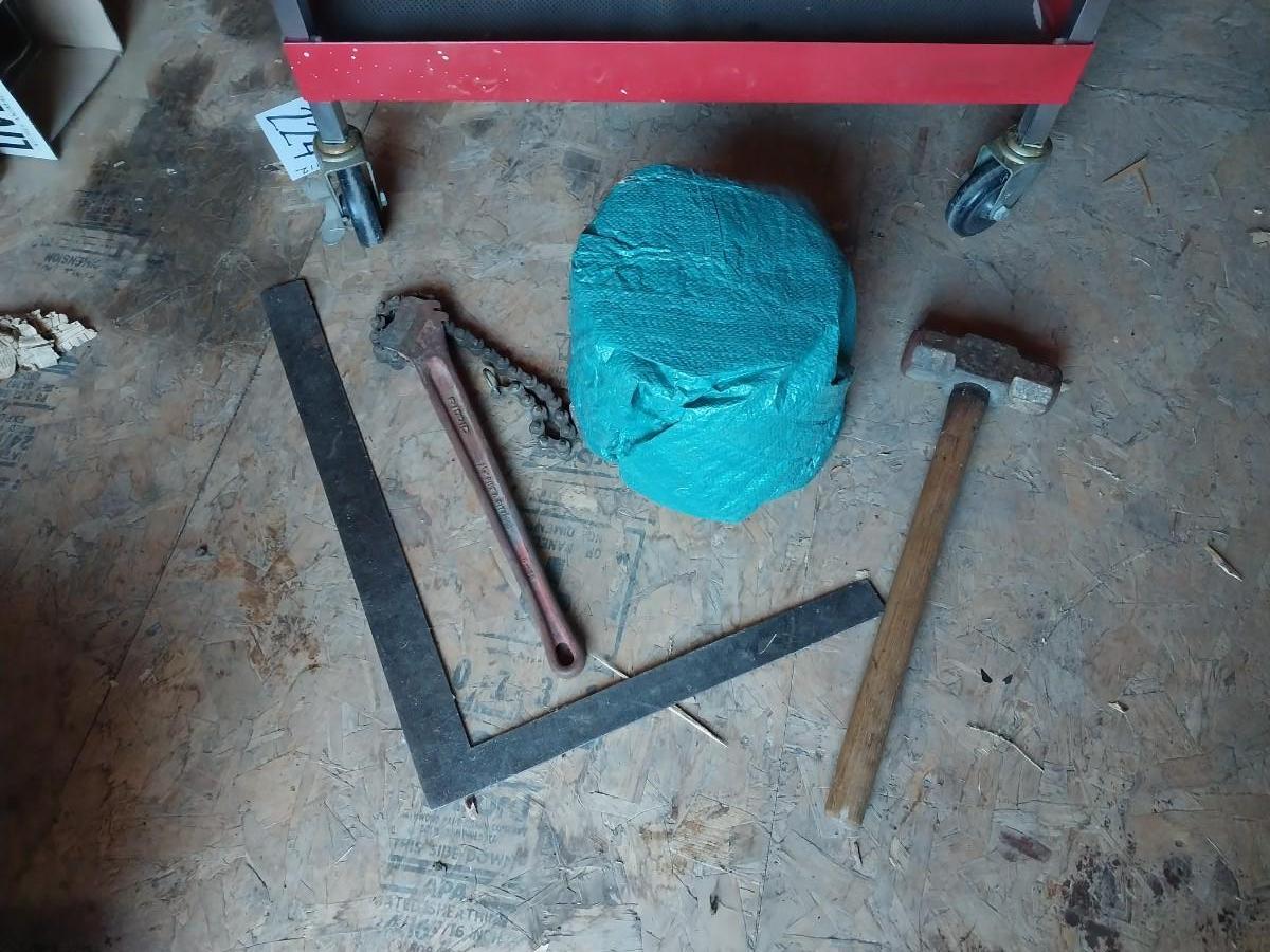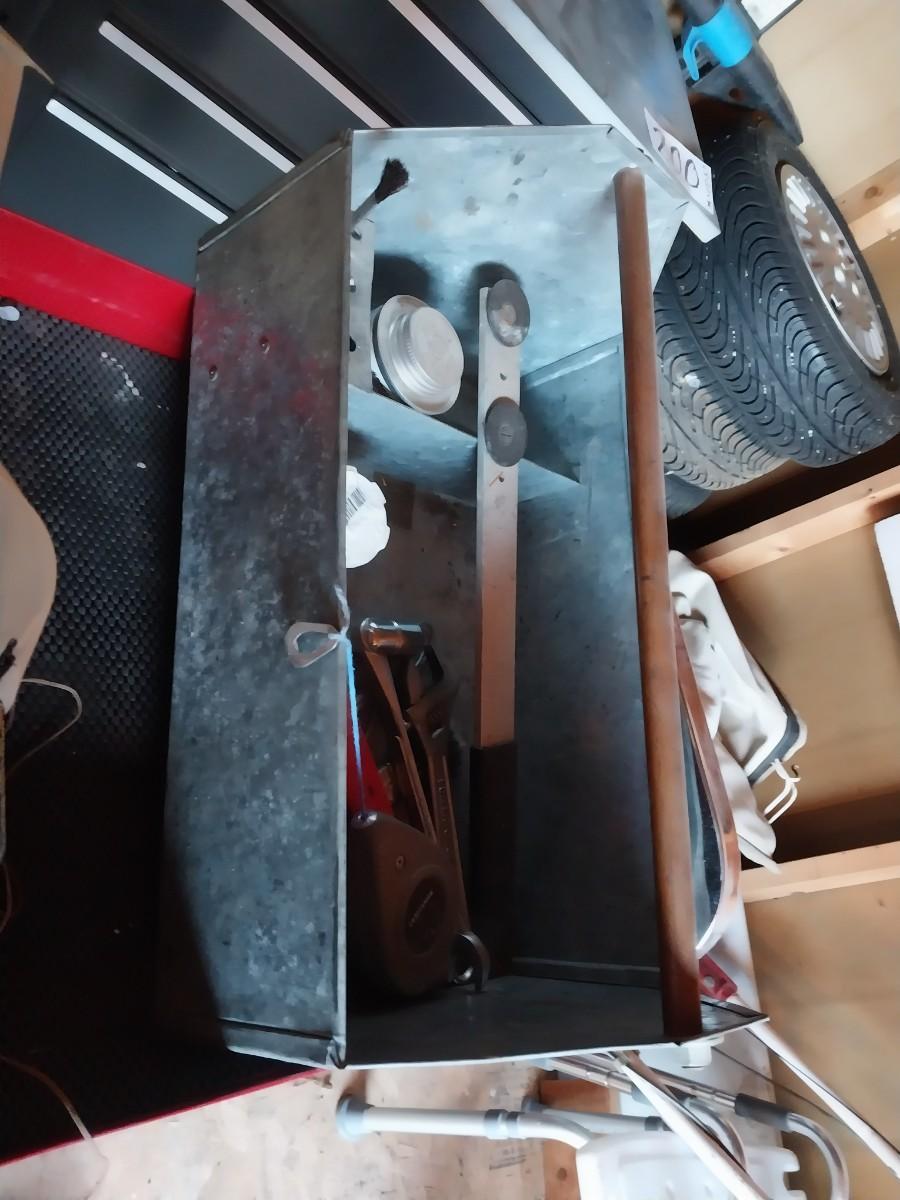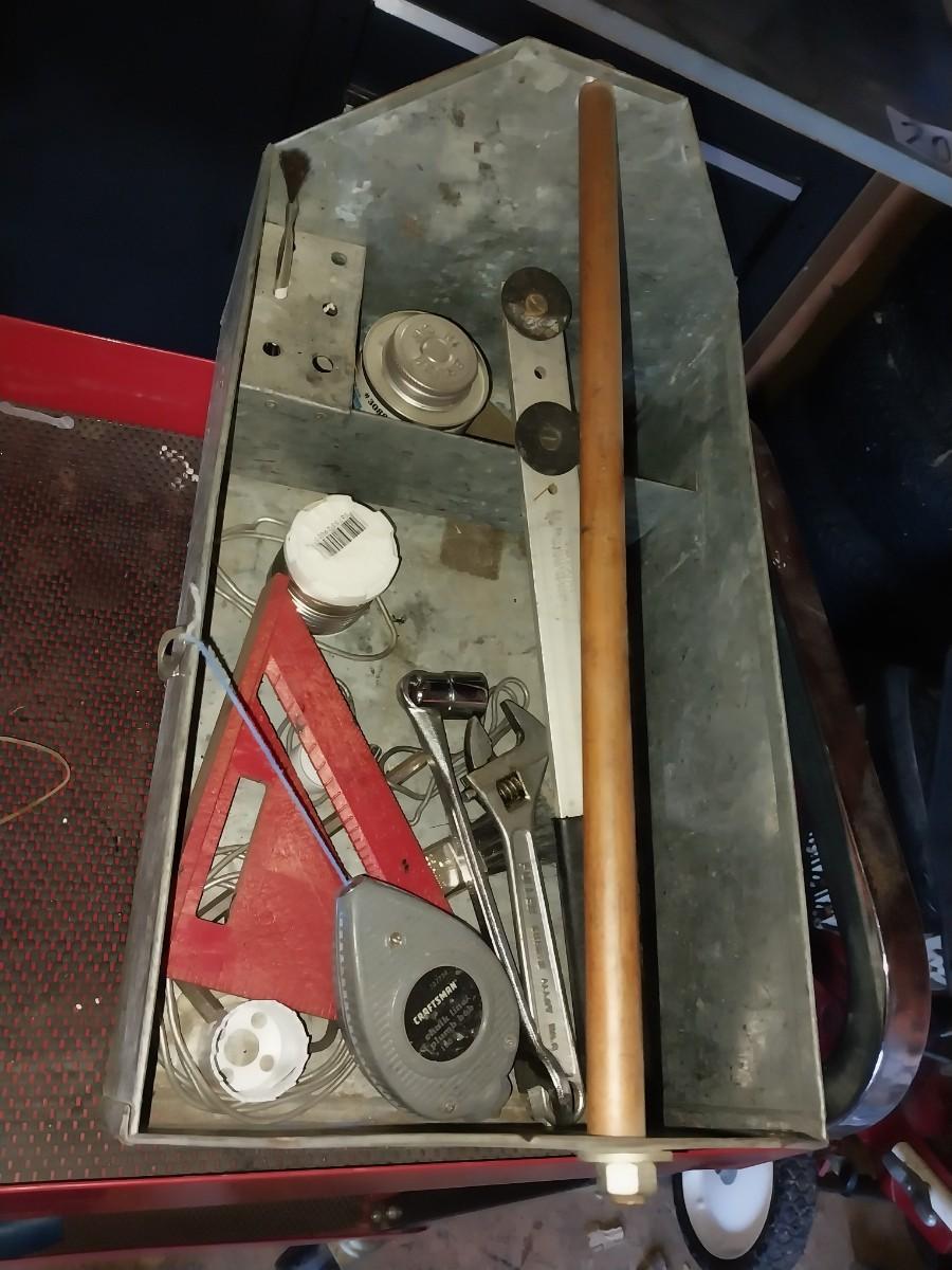 HAND TOOLS, GREEN TARP AND METAL TOOL BOX