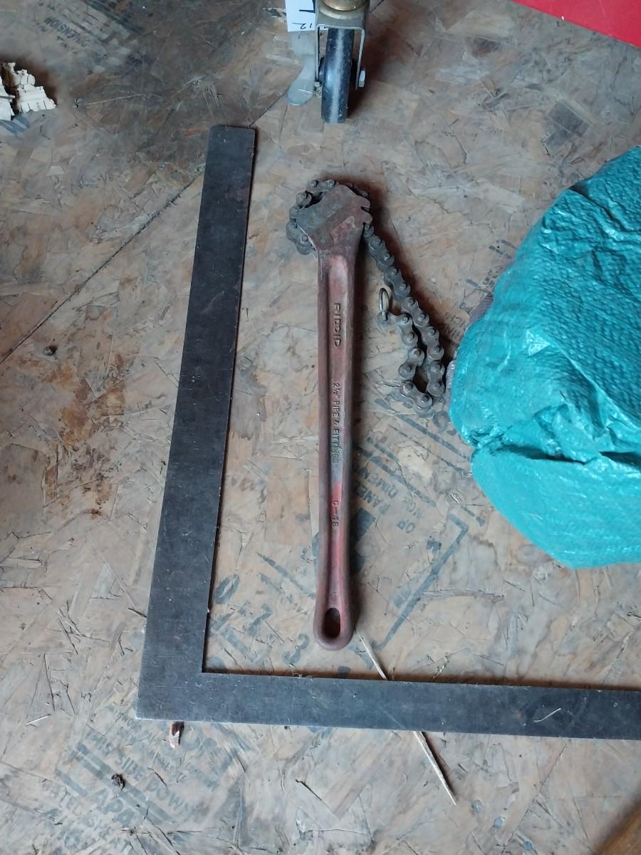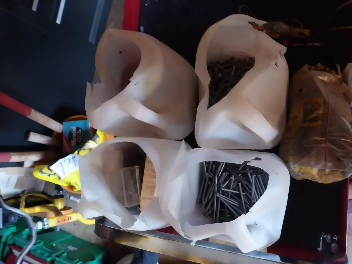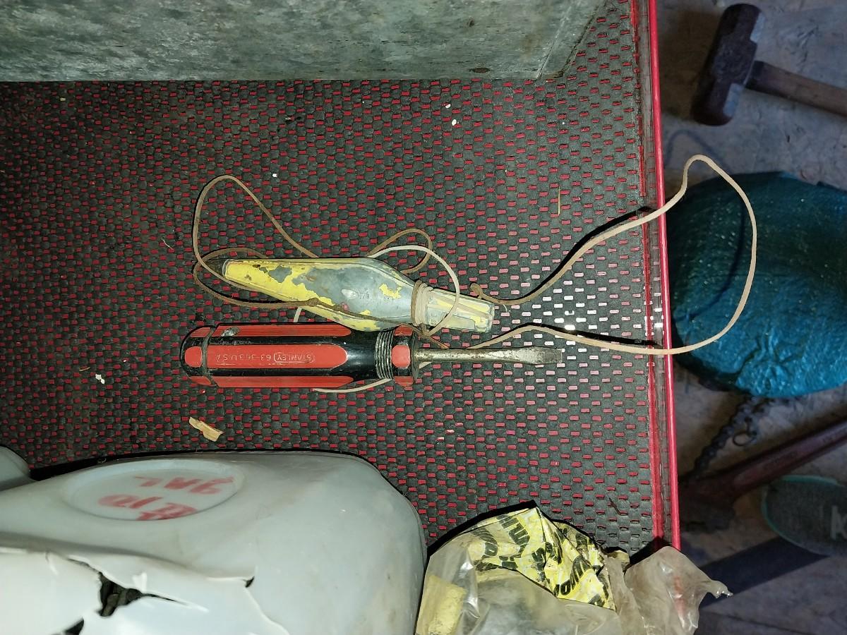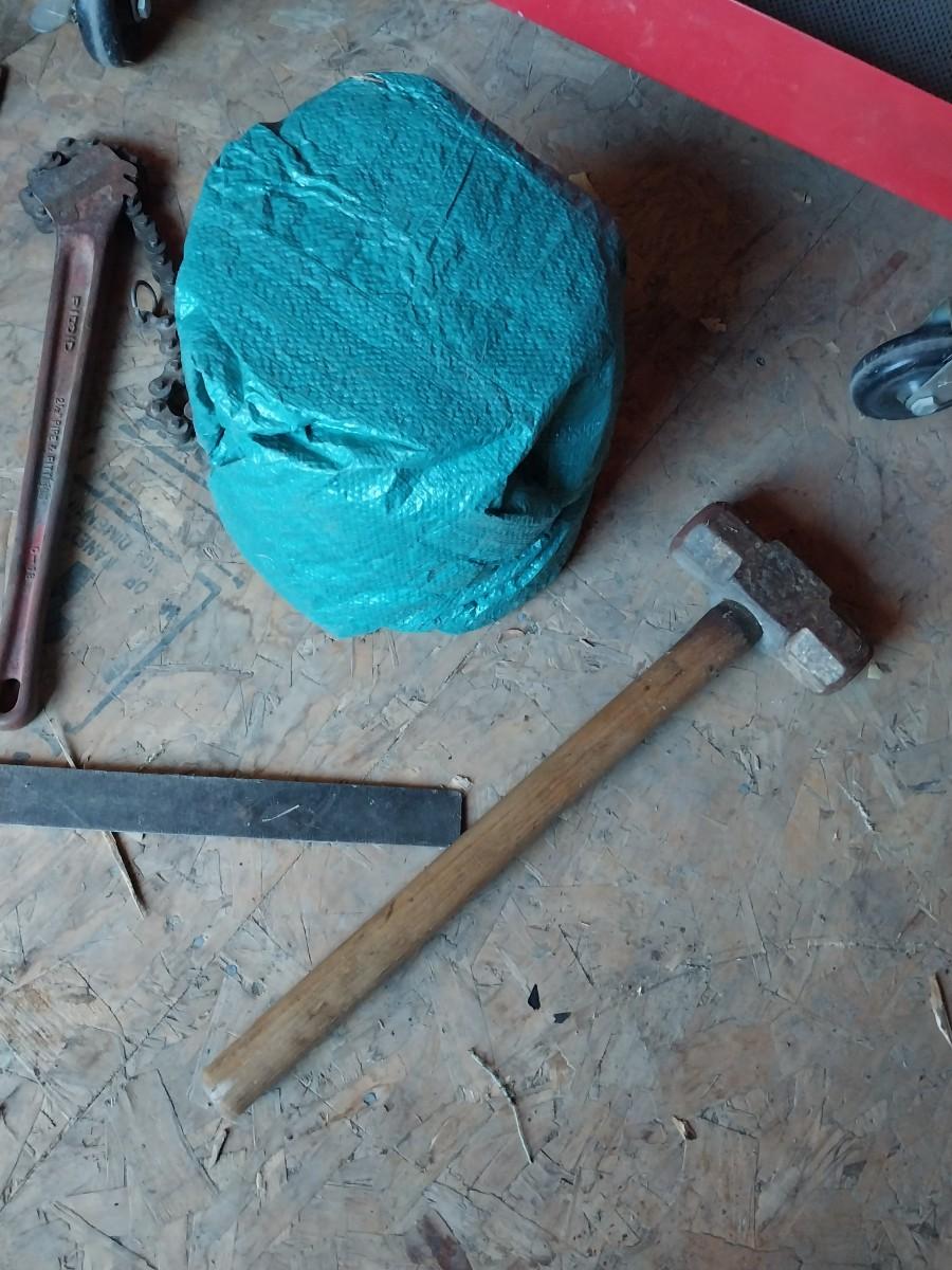 HAND TOOLS, GREEN TARP AND METAL TOOL BOX