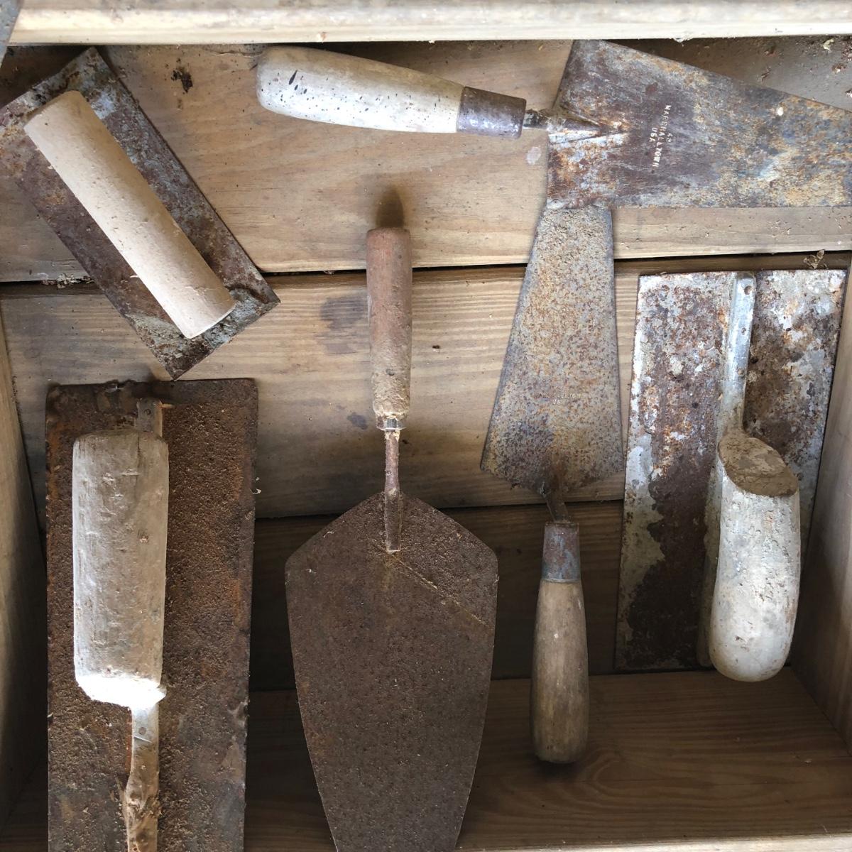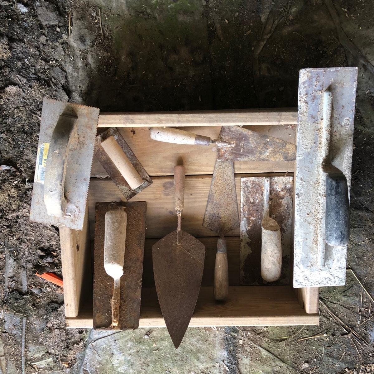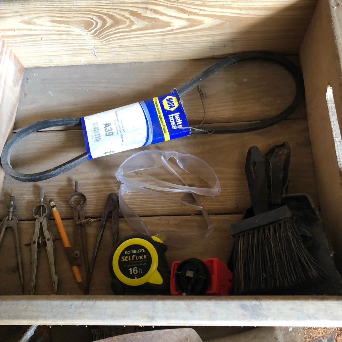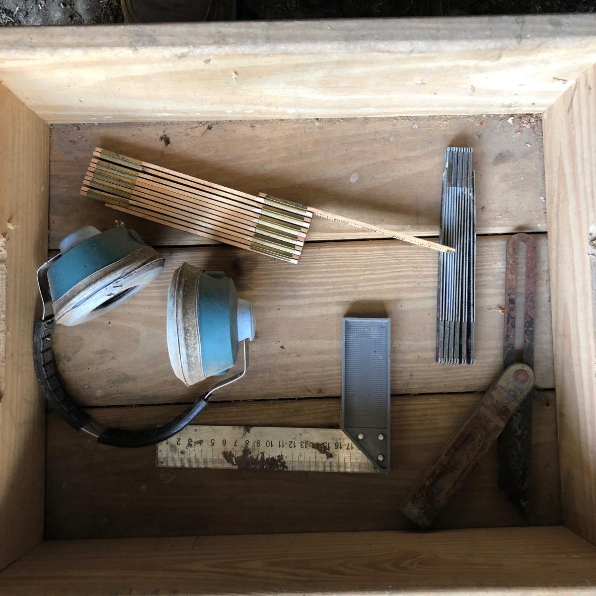 These tools come in a heavy wooden crate measuring 19.5” x 16.5” x 7”. Tools include two wooden and folding measures, two pair of safety googles, hearing protection, protractors, a Black and Decker laser level, nine masonry tools, a hammer, two clamps and more! Local pick up only.