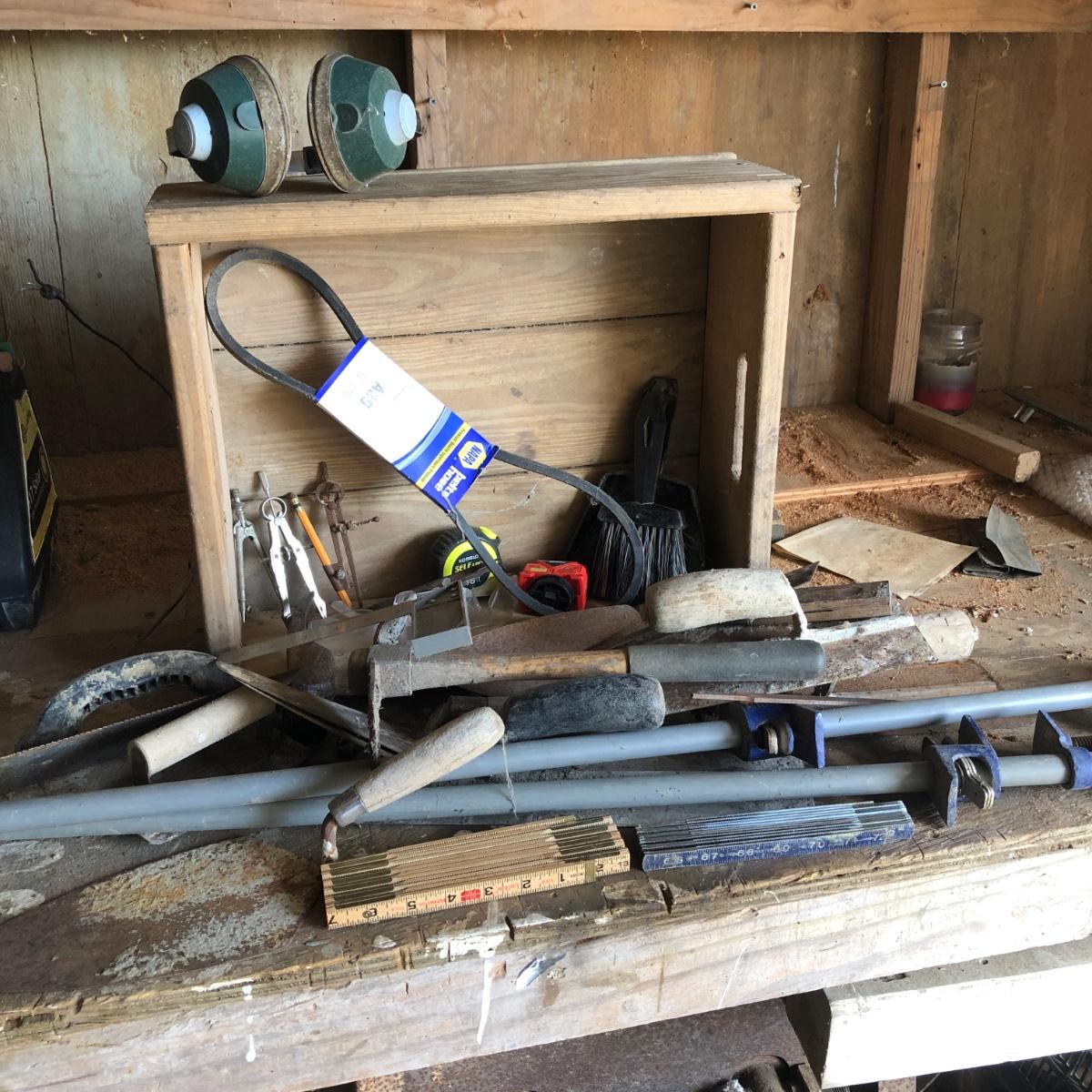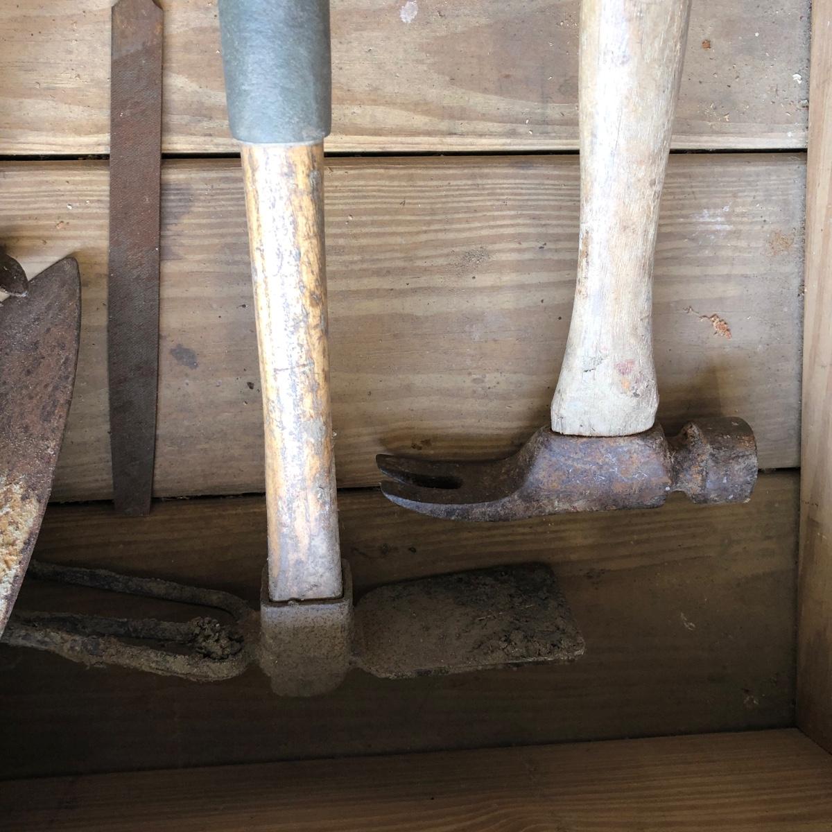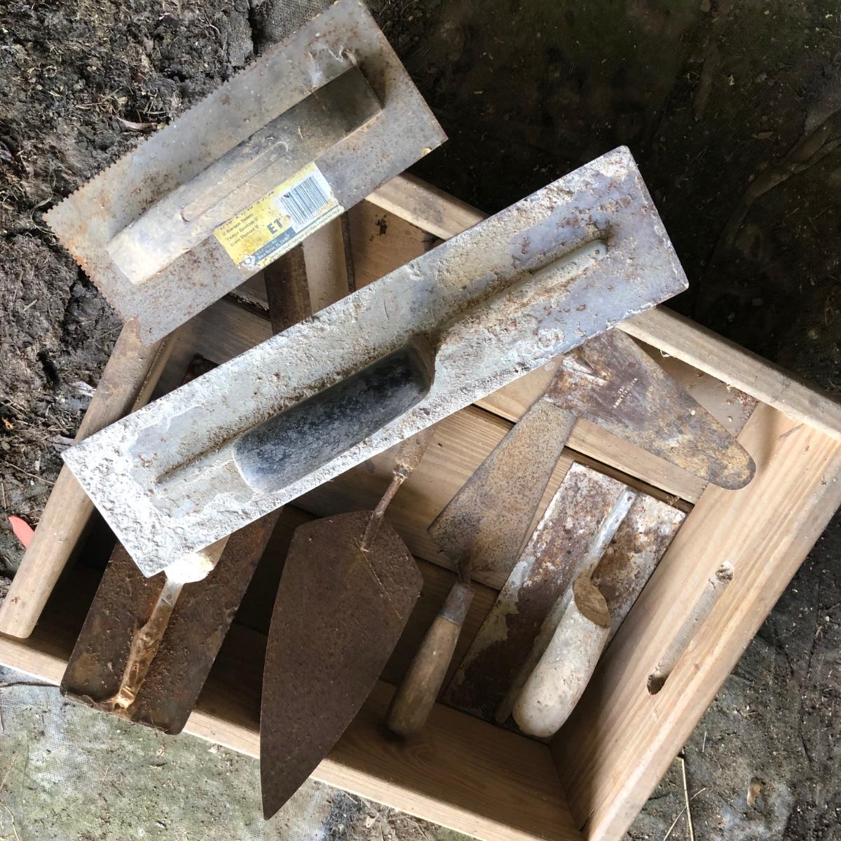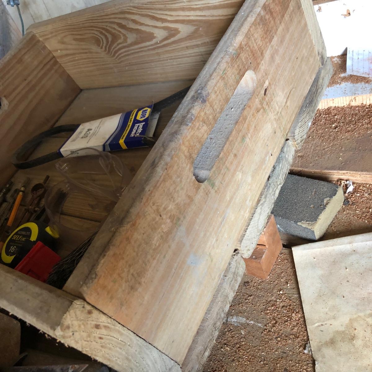 These tools come in a heavy wooden crate measuring 19.5” x 16.5” x 7”. Tools include two wooden and folding measures, two pair of safety googles, hearing protection, protractors, a Black and Decker laser level, nine masonry tools, a hammer, two clamps and more! Local pick up only.