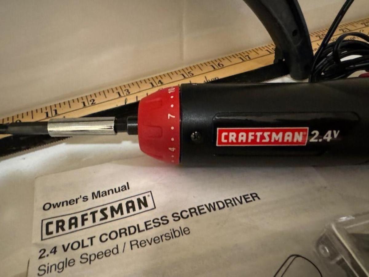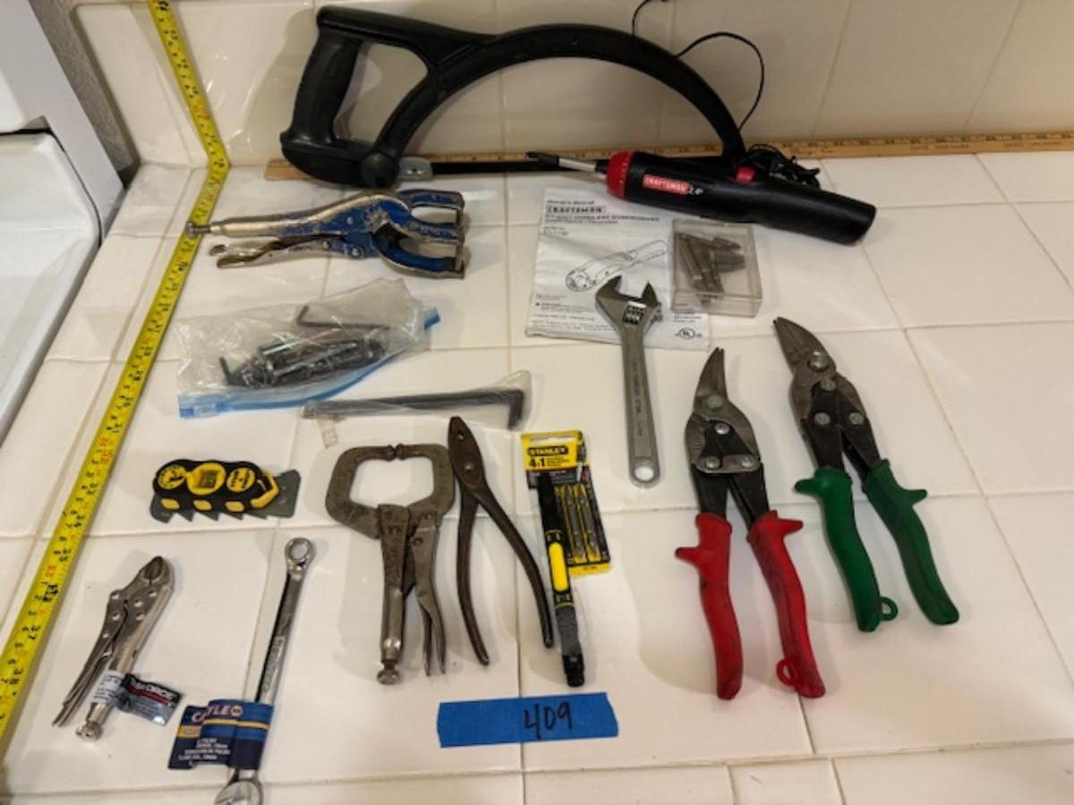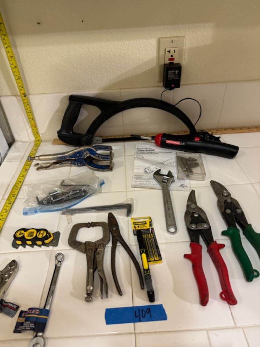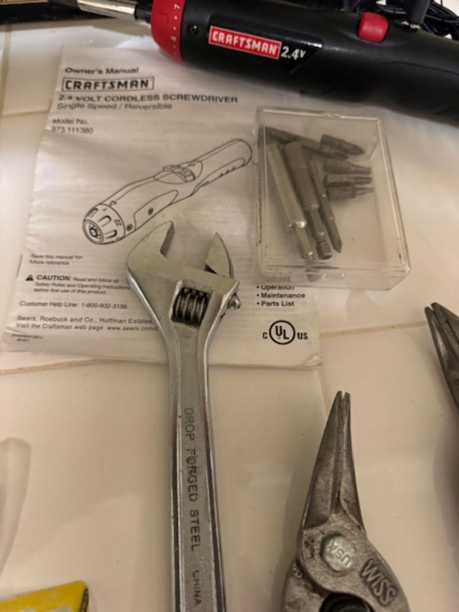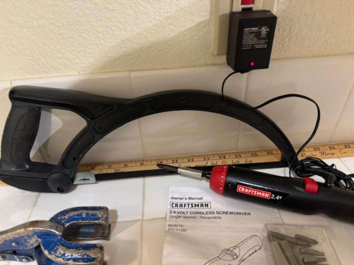2.4 volt cordless screw driver Craftsman, saw, Wiss clippers, new Stanley 4 in 1 screwdriver, new Carlyle 10 mm Combo wrench, 4" curved jaw locking pliers, alan wrenches, Stud 4 Sure, and more.
