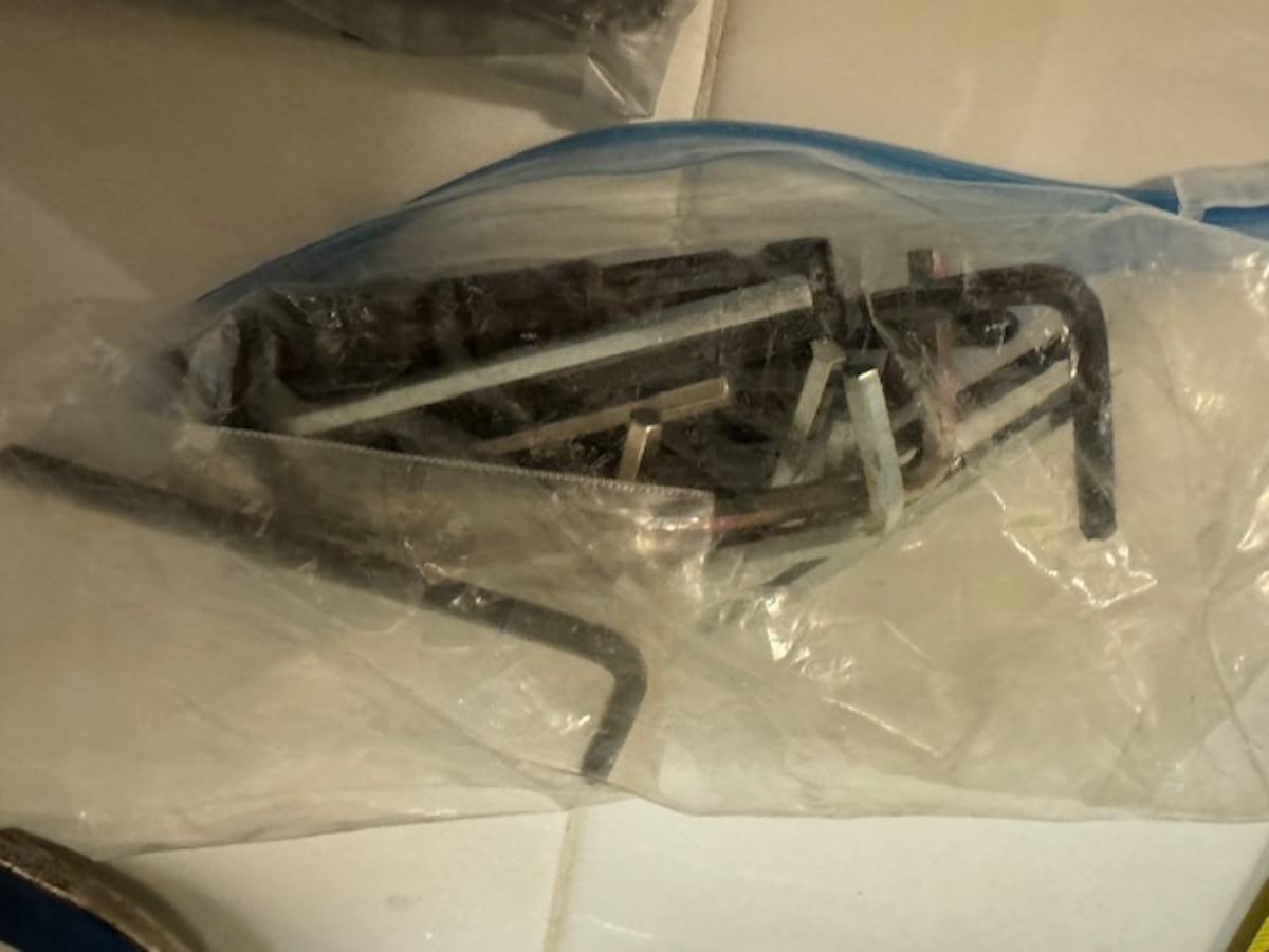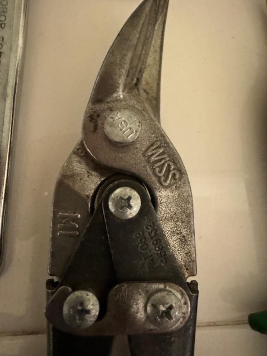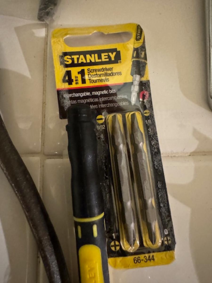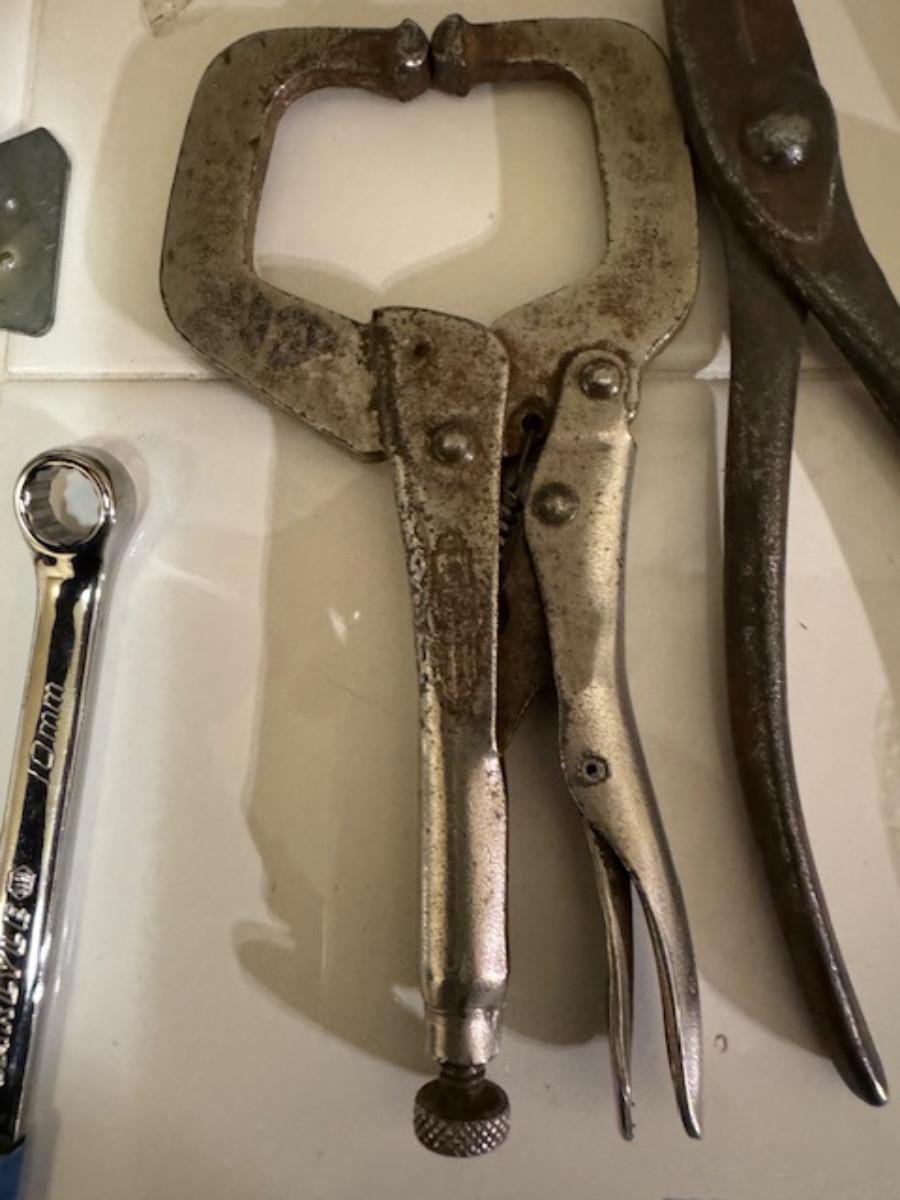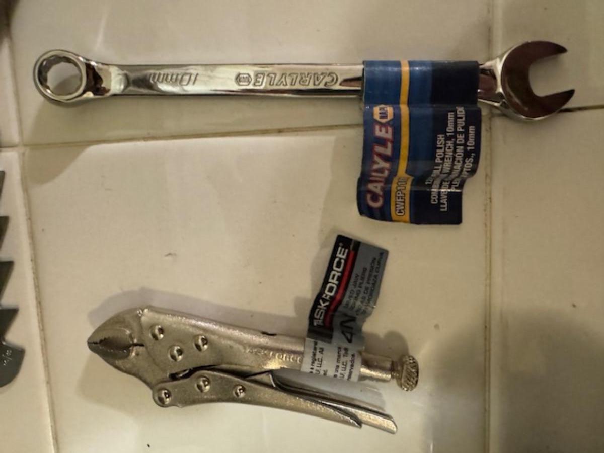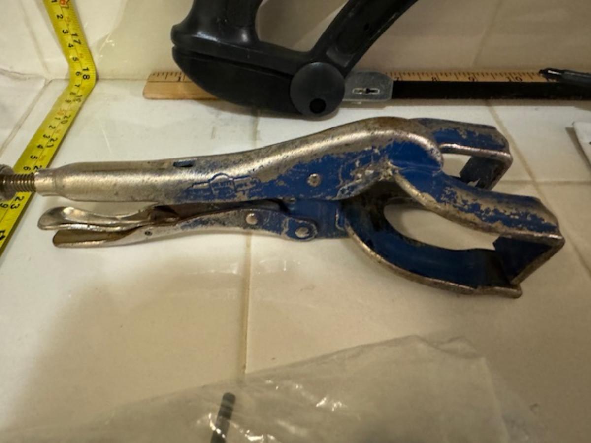 2.4 volt cordless screw driver Craftsman, saw, Wiss clippers, new Stanley 4 in 1 screwdriver, new Carlyle 10 mm Combo wrench, 4" curved jaw locking pliers, alan wrenches, Stud 4 Sure, and more.