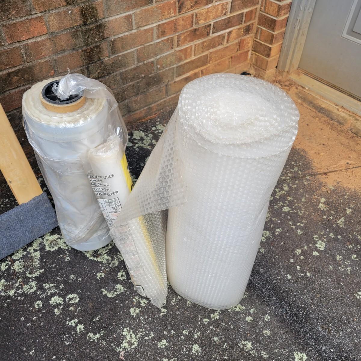 An assortment of moving supplies that includes two packs of folding storage boxes, bubble wrap and plastic. Also includes a multi position hand truck and movers assistant with four casters. Local pickup only