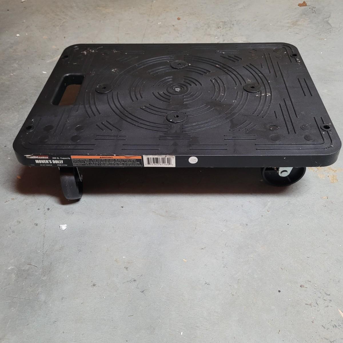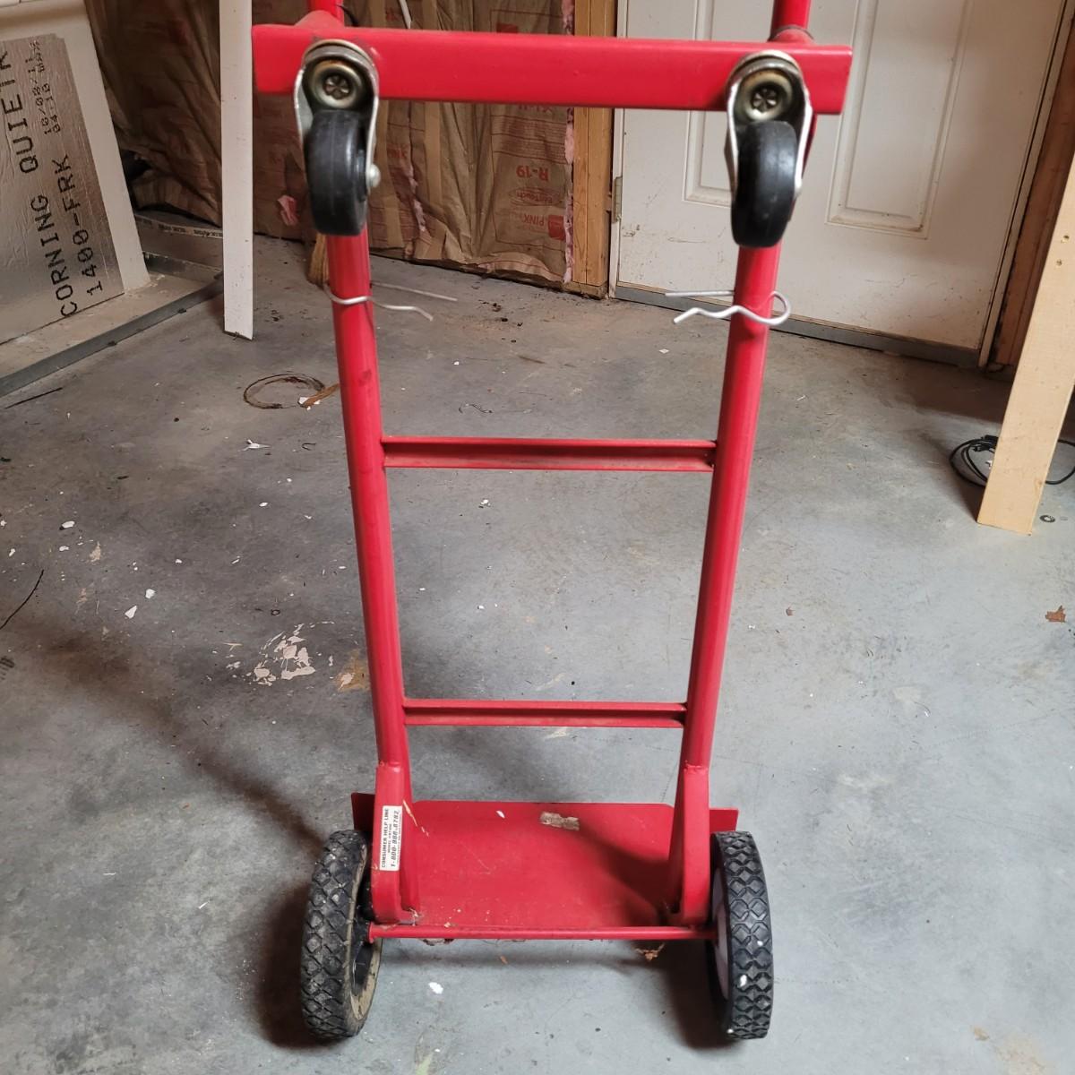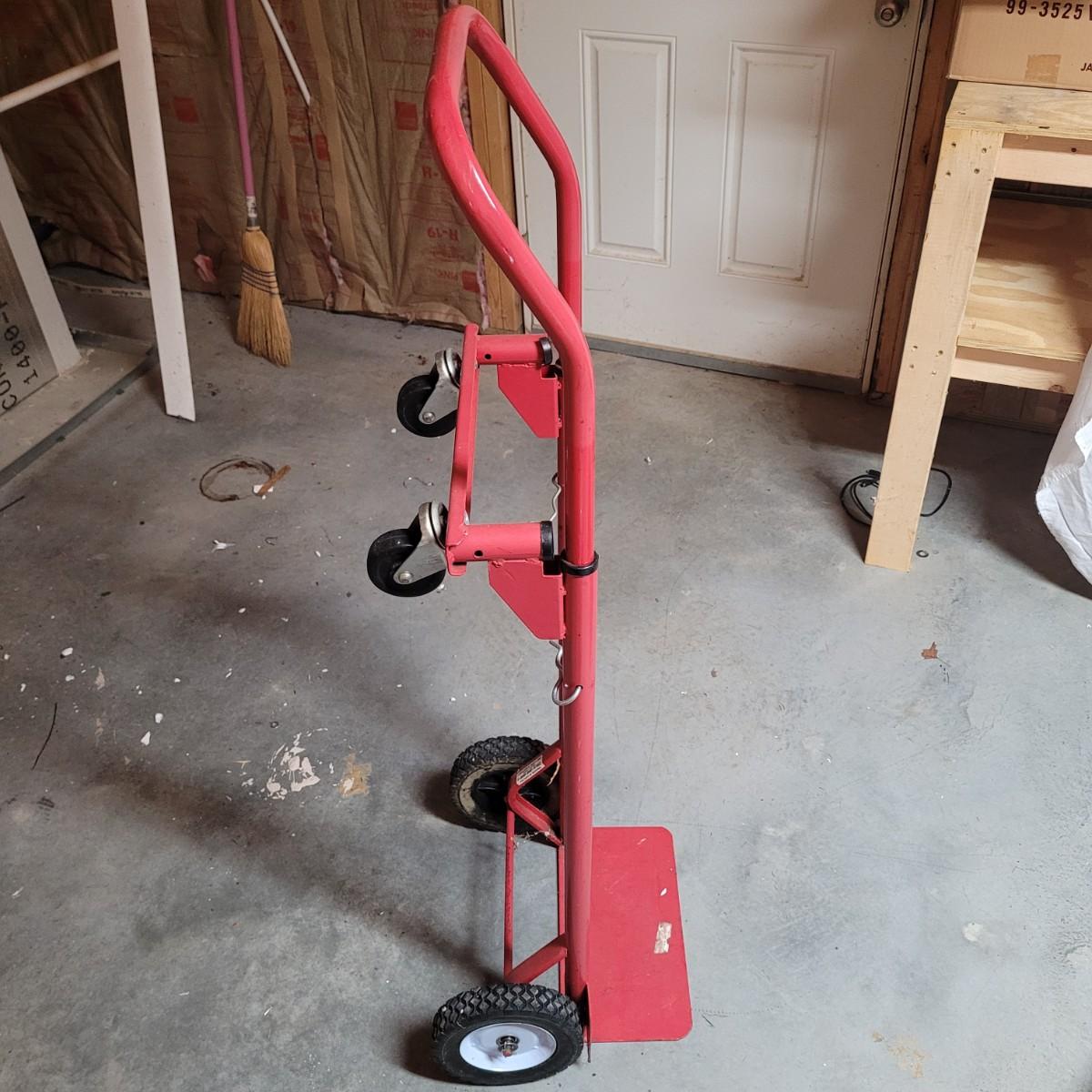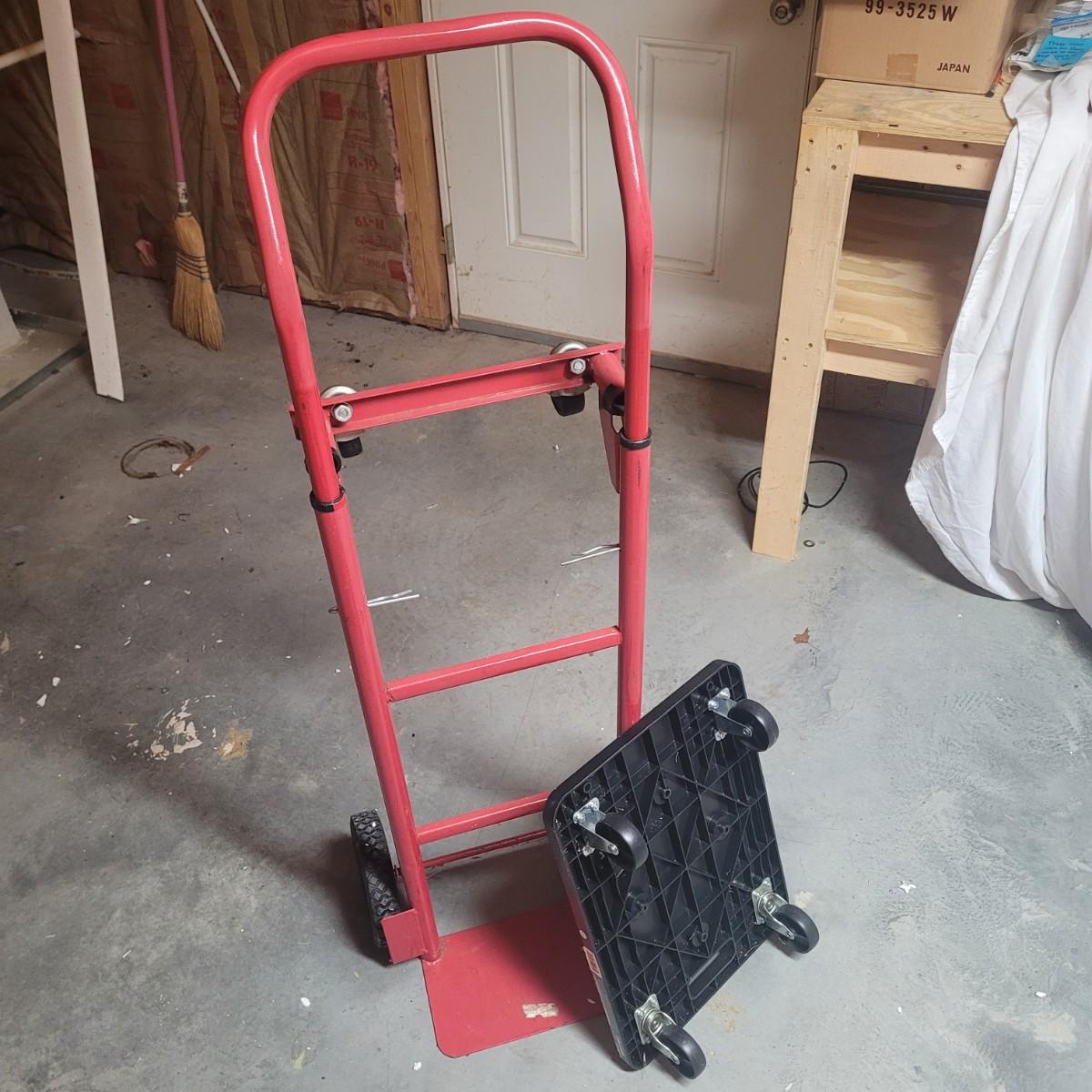 This lot includes a solid metal hand truck and a heavy duty plastic furniture roller. The hand truck is made from painted red metal and features two solid rubber wheels. It also includes swivel rollers near the top for the ability to roll while flat. The hand truck measures 18" x 14" x 52"H. The roller is made from sturdy black plastic and features two fixed, and two swiveling wheels. It is designed to have large items placed on top for easy transport. It measures 14.5" x 20" x 5"H.