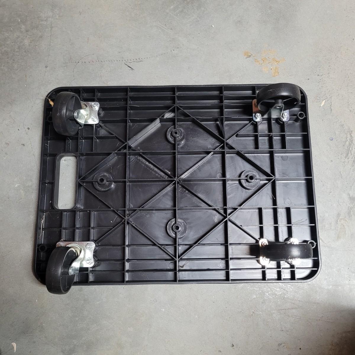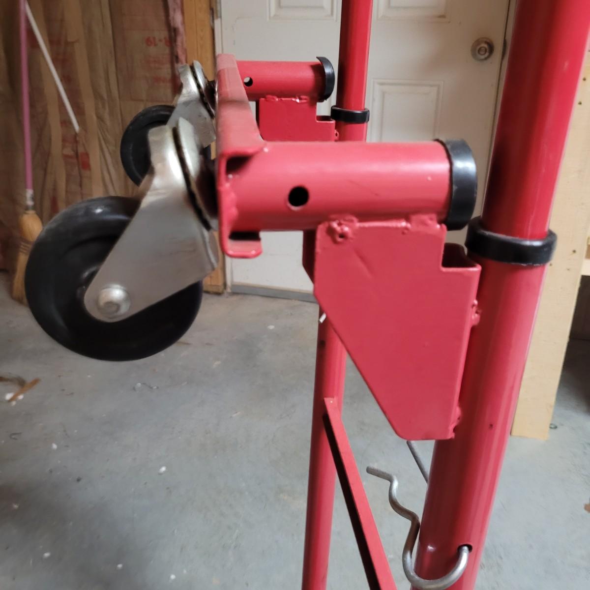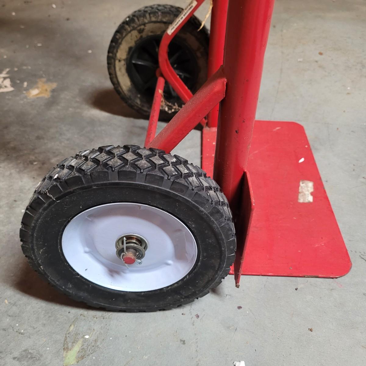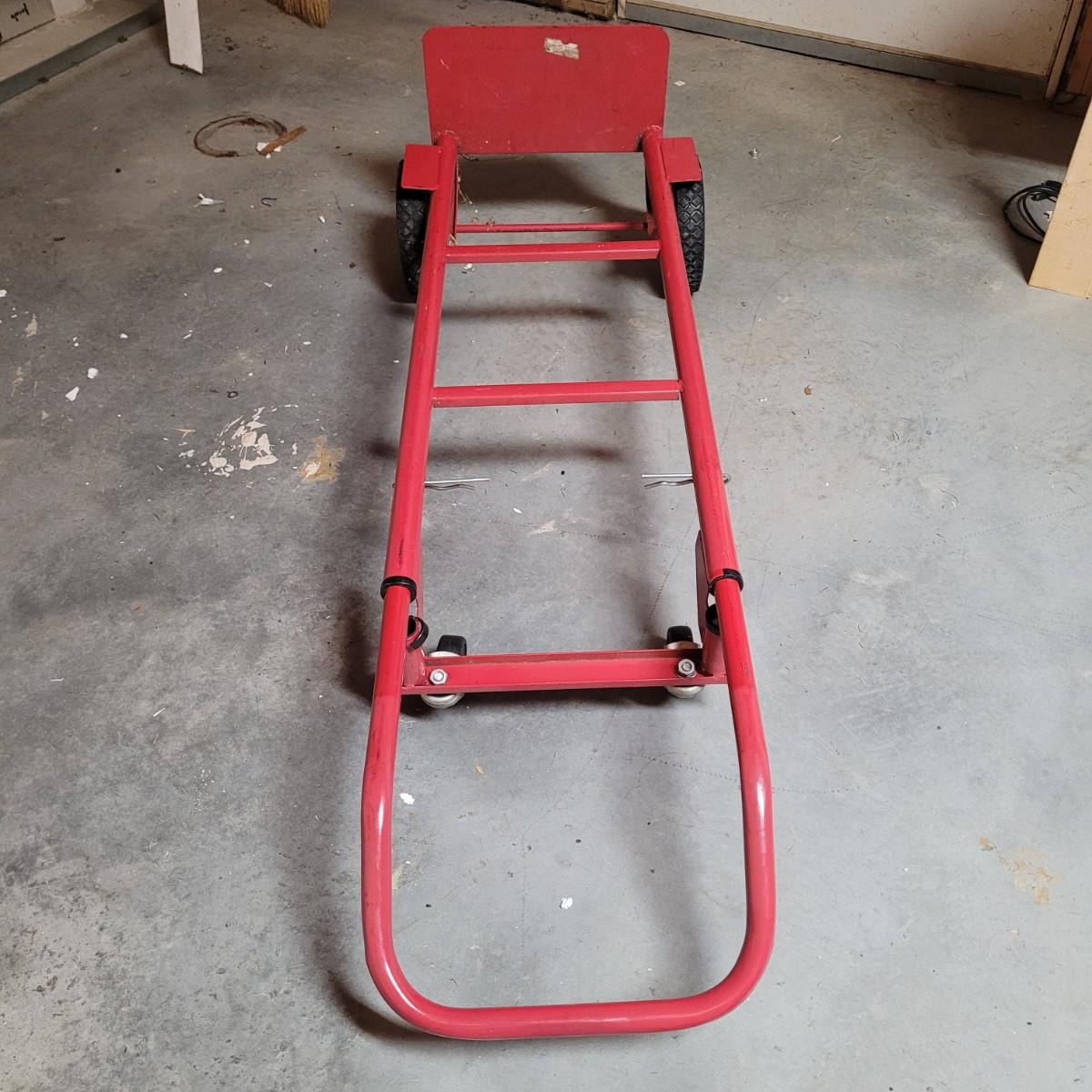 This lot includes a solid metal hand truck and a heavy duty plastic furniture roller. The hand truck is made from painted red metal and features two solid rubber wheels. It also includes swivel rollers near the top for the ability to roll while flat. The hand truck measures 18" x 14" x 52"H. The roller is made from sturdy black plastic and features two fixed, and two swiveling wheels. It is designed to have large items placed on top for easy transport. It measures 14.5" x 20" x 5"H.
