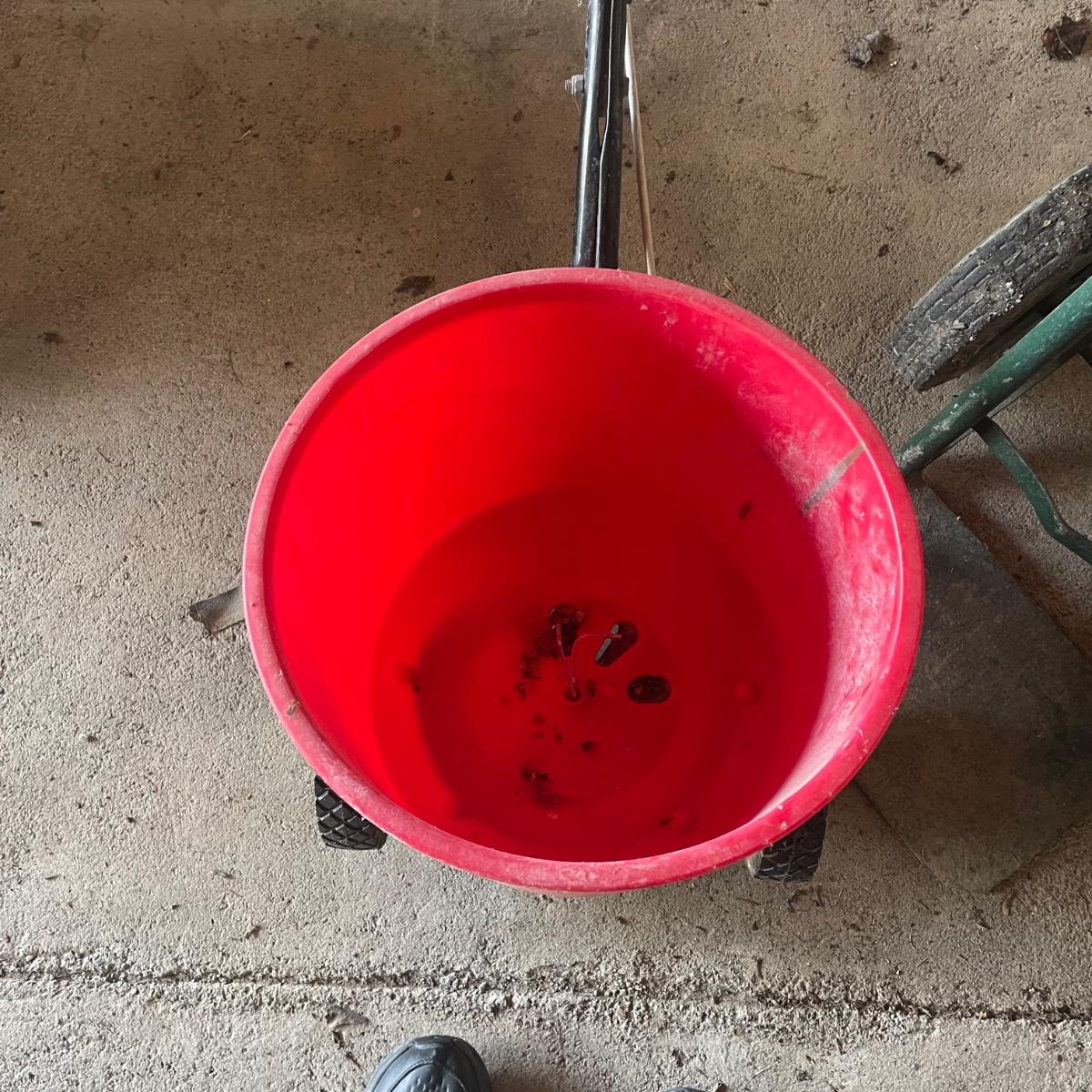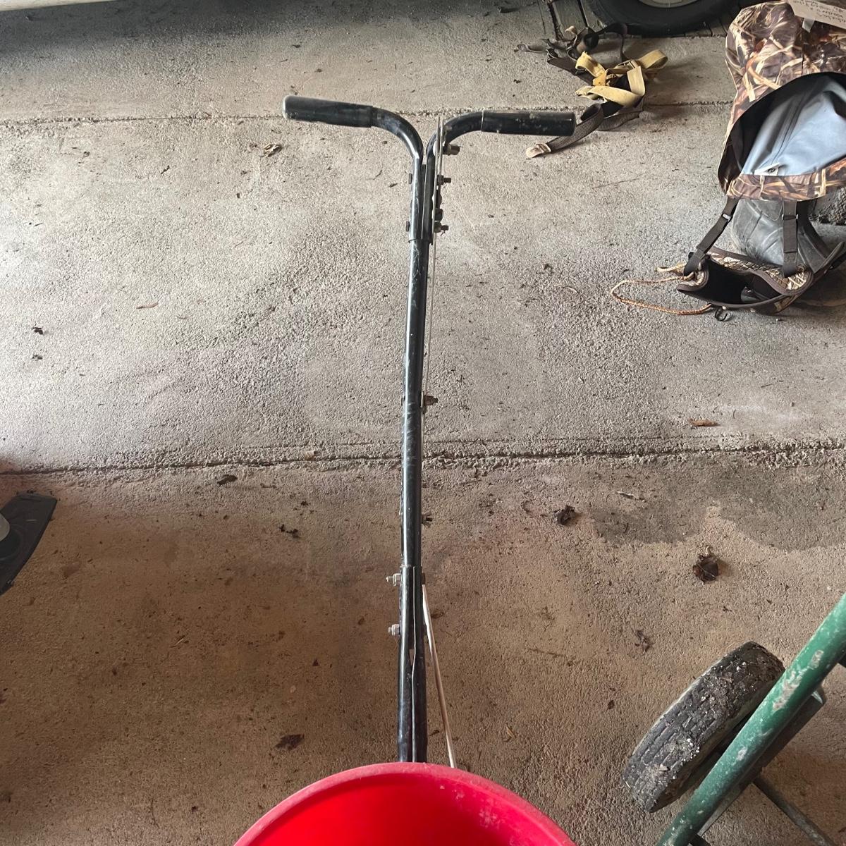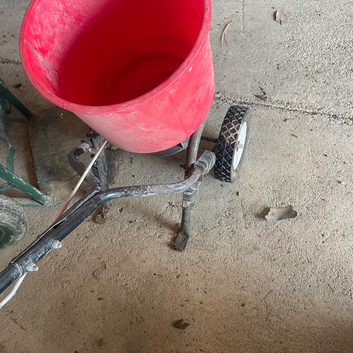 A green metal hand truck has been paired with a Earthway seed spreader.