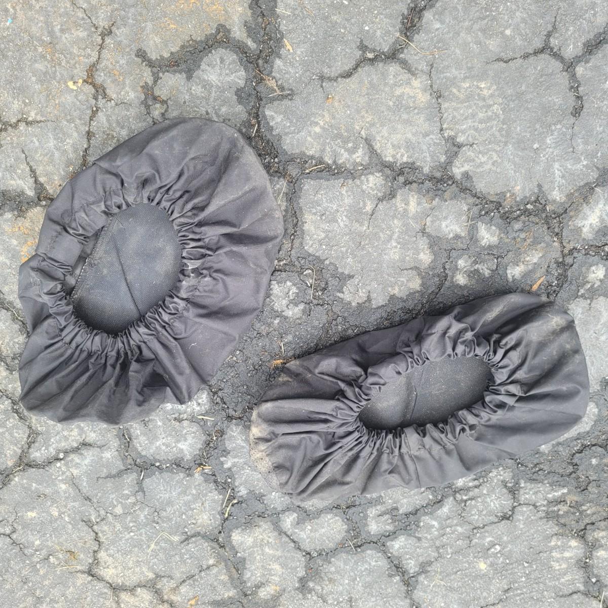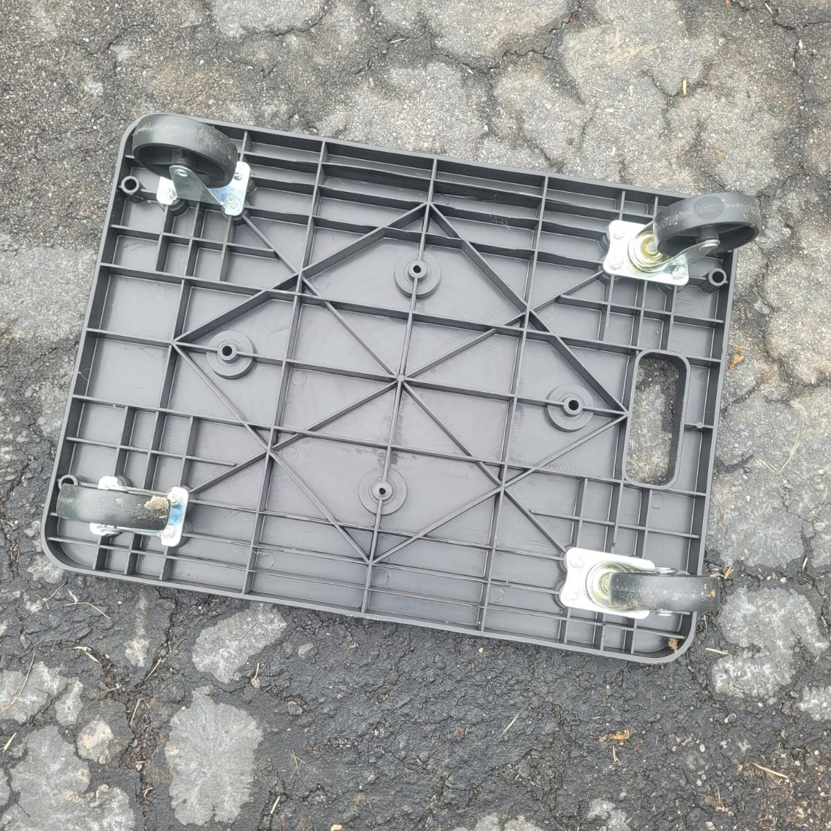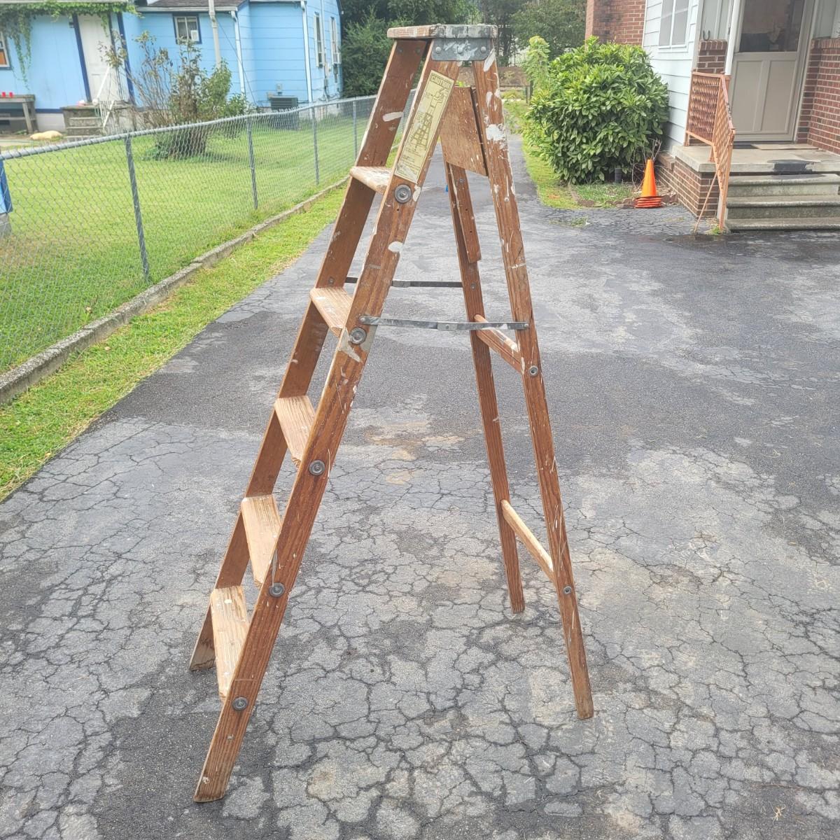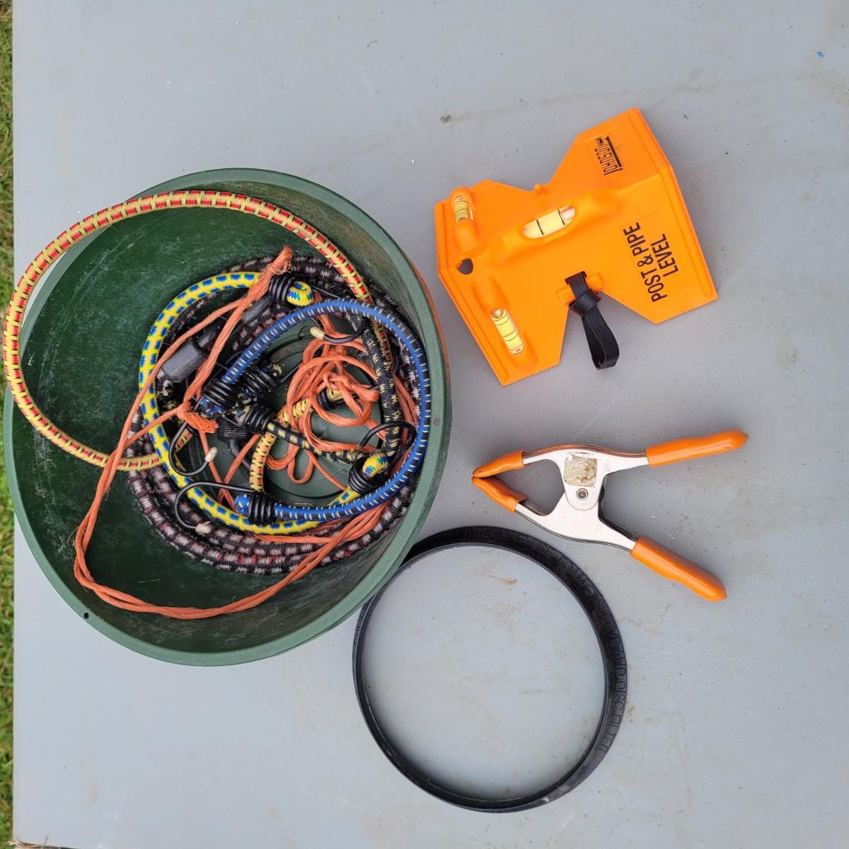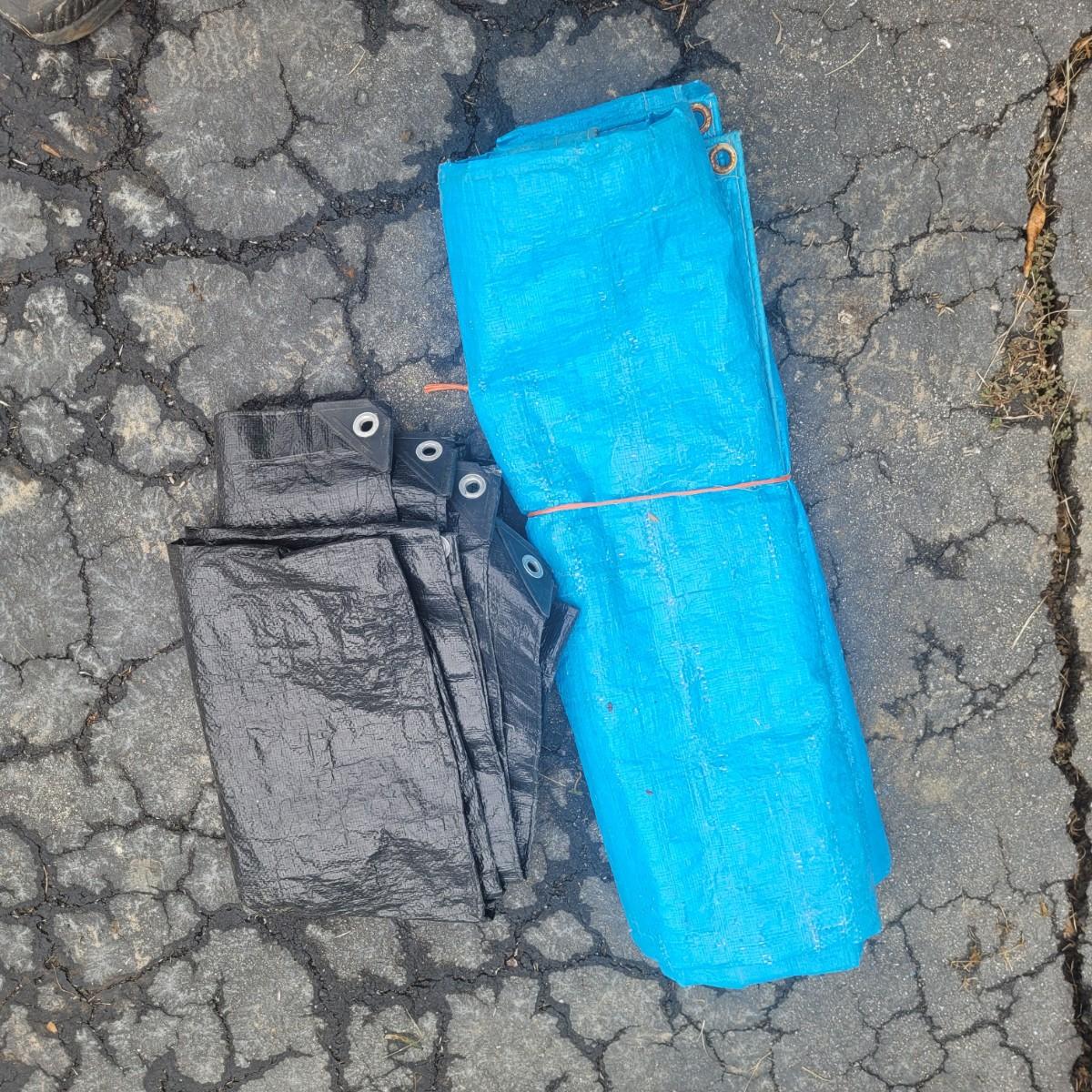 This lot includes a hand truck, a furniture roller, wooden ladder, tarps, shoe covers, bungee, and more. The hand truck is a 4-in-One Move-All and can be used upright or flat. The roller is made from sturdy plastic and measures 19.5" x 16.5" x 4.5"H. The ladder is made from wood and stands 6' tall. It is splashed with paint but otherwise, in good condition. There are two tarps of different sizes. The shoe covers are slip on style to protect floors during moving or working. Also included is a bowl of miscellaneous clamps and bungees. See photos.