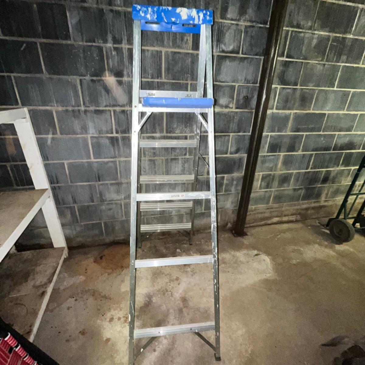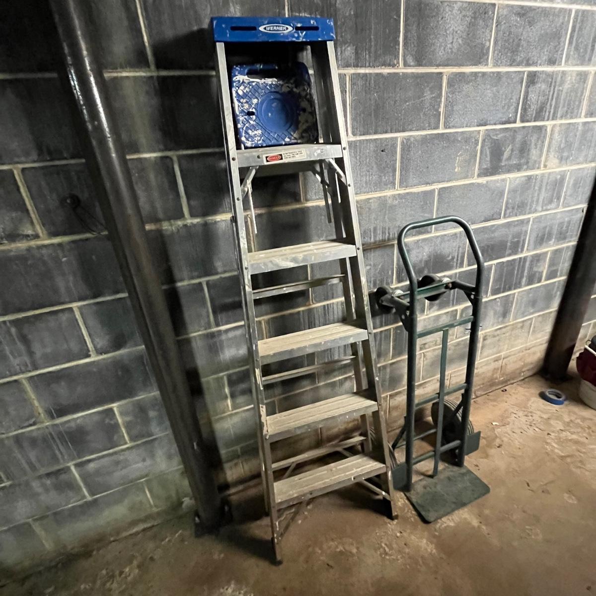 Lot includes a Werner six foot aluminum step ladder and a metal hand truck with pneumatic main tires. Tires are currently flat.