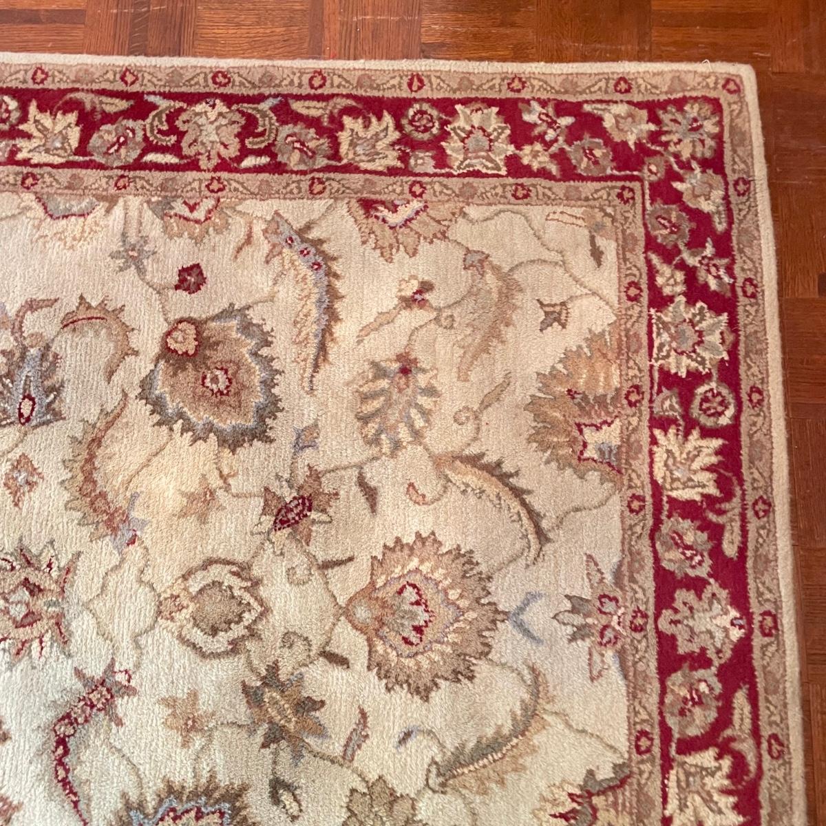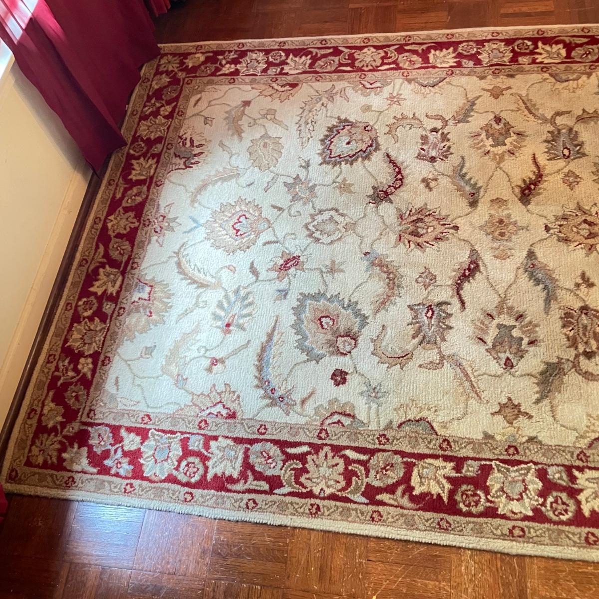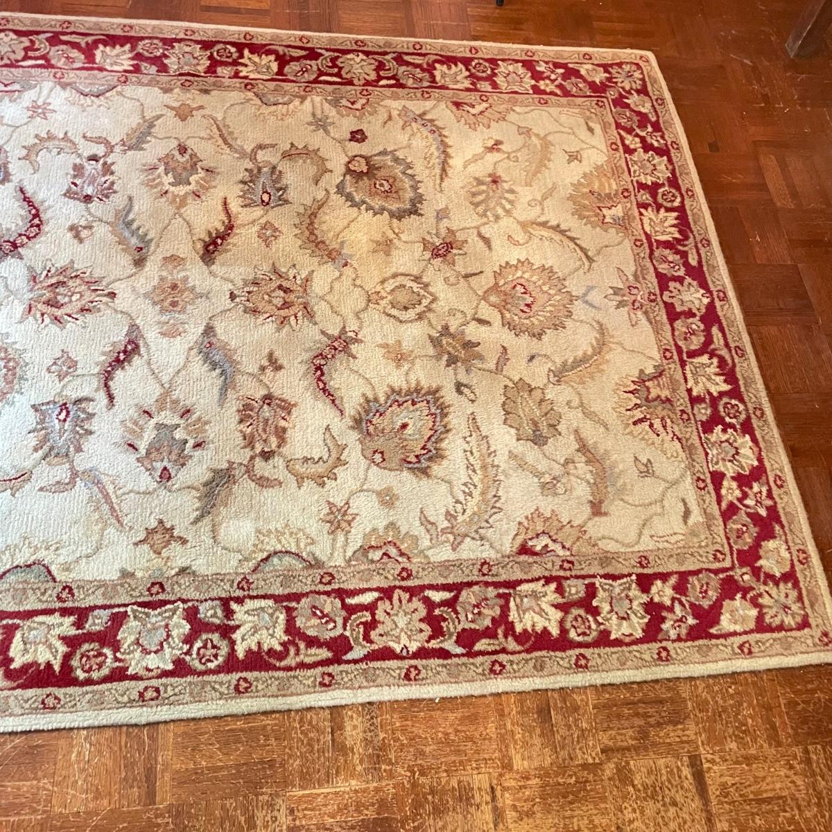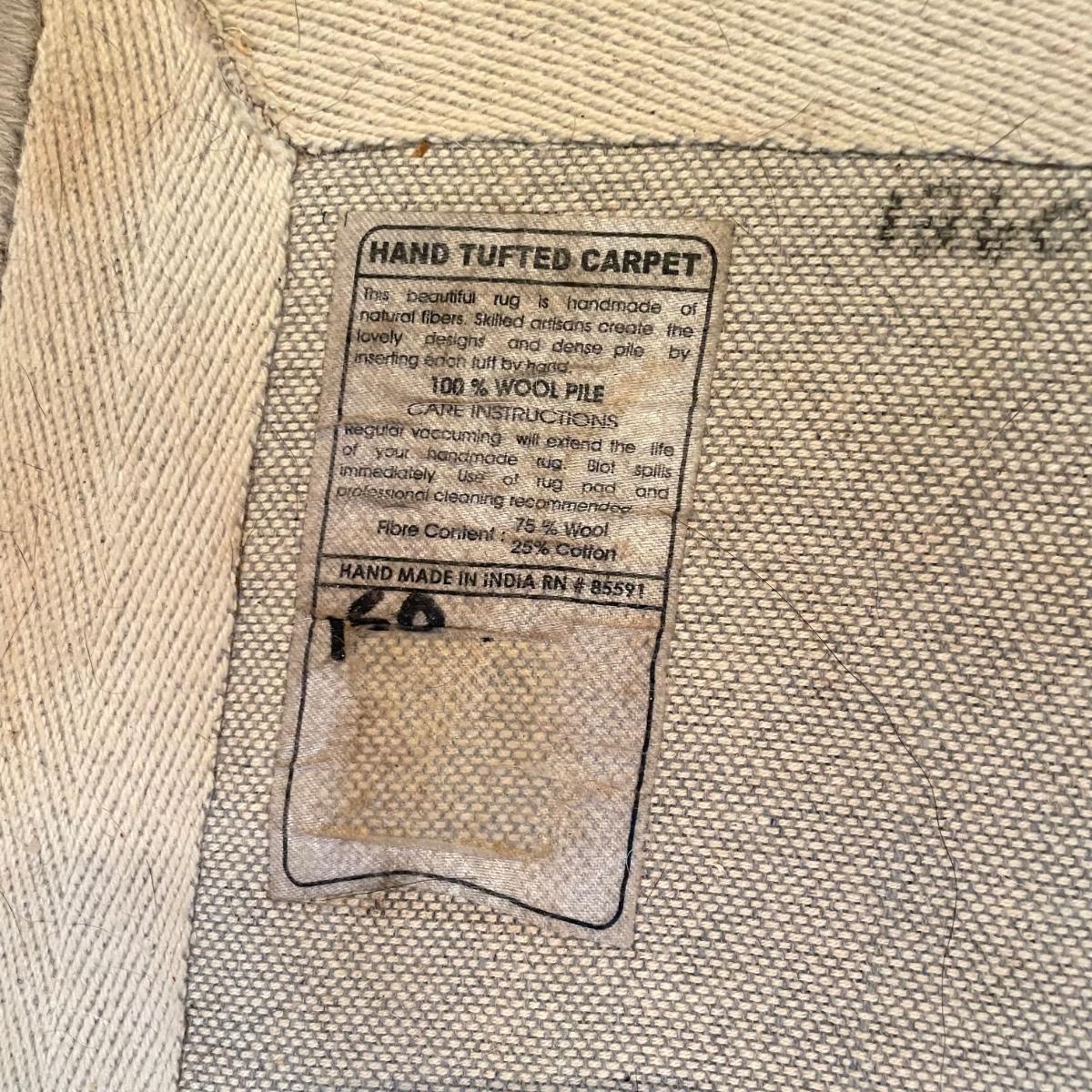 Nicely sized 7’5” x 5’ rug has a tag stating 100% wool and hand tufted in India. Rug has shades of cream and maroon with hints of blue. Rug has some backing beginning to separate, but it is not noticeable from the top. Rug needs cleaning, there is pet hair present. There is also some crinkling inside when we rolled it up, it is not apparent why from the outside. See images. Local pick up only.