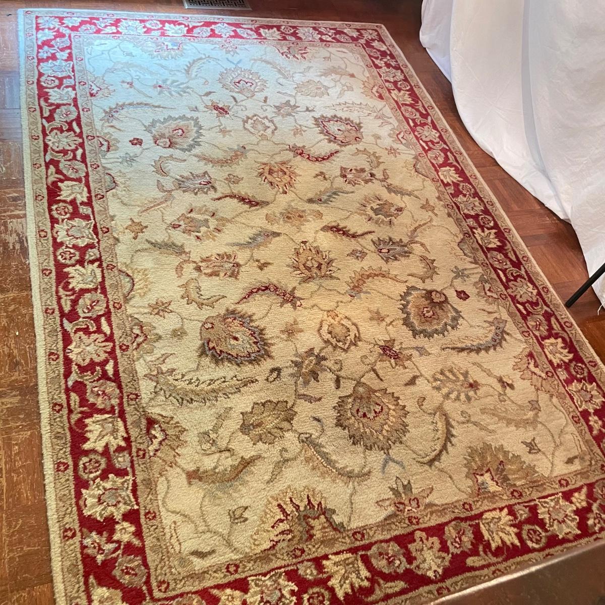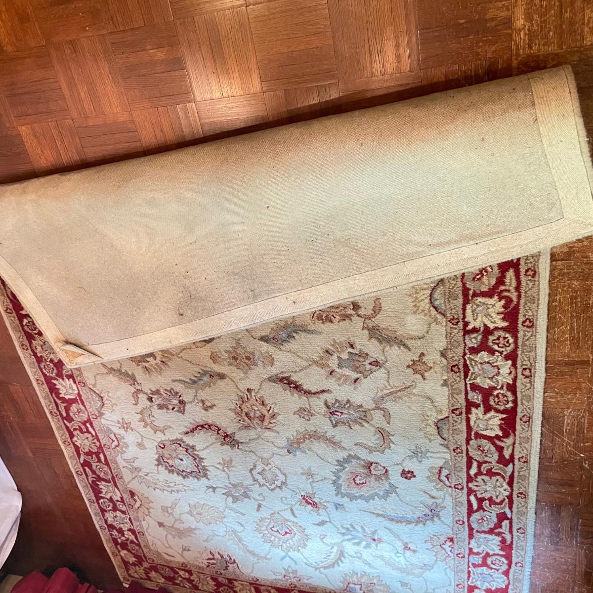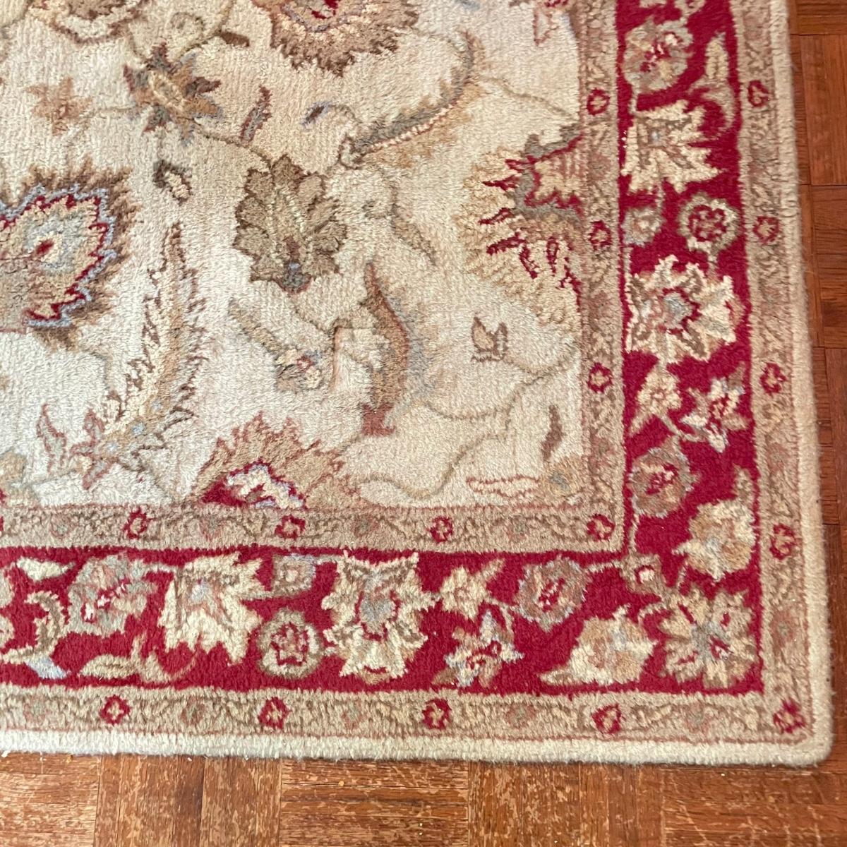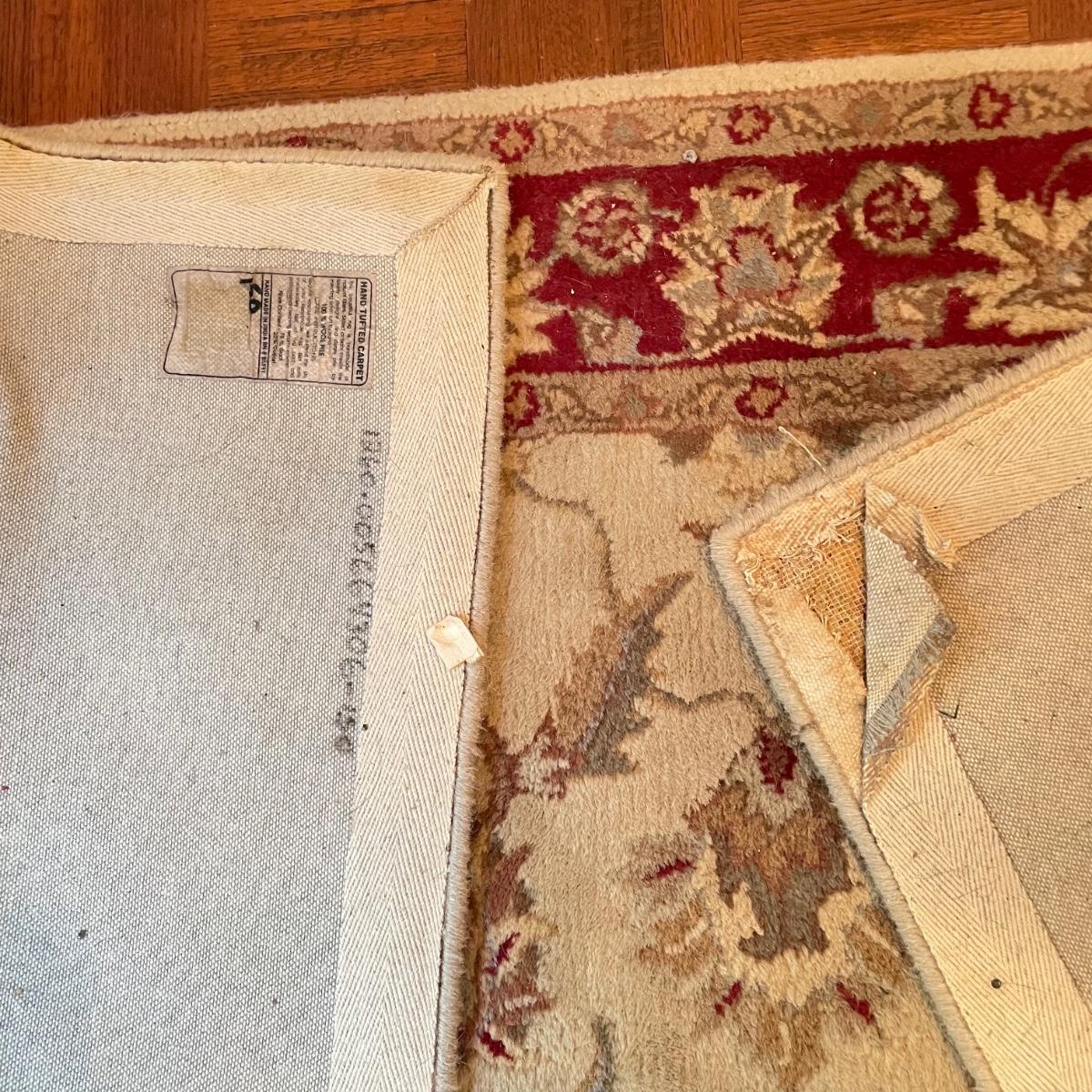 Nicely sized 7’5” x 5’ rug has a tag stating 100% wool and hand tufted in India. Rug has shades of cream and maroon with hints of blue. Rug has some backing beginning to separate, but it is not noticeable from the top. Rug needs cleaning, there is pet hair present. There is also some crinkling inside when we rolled it up, it is not apparent why from the outside. See images. Local pick up only.
