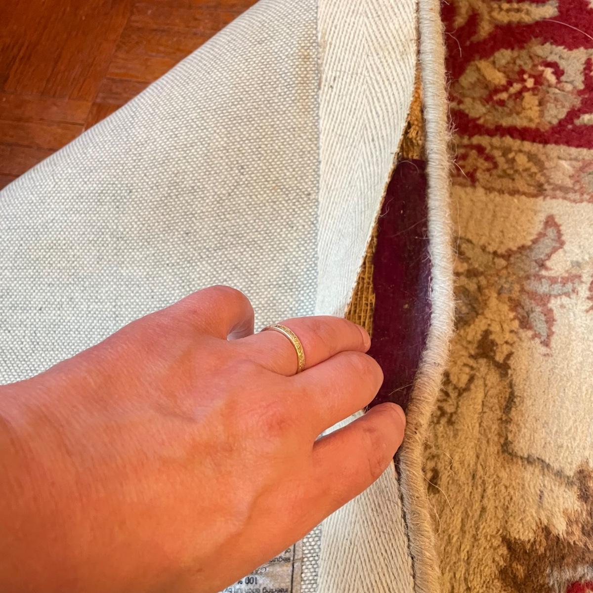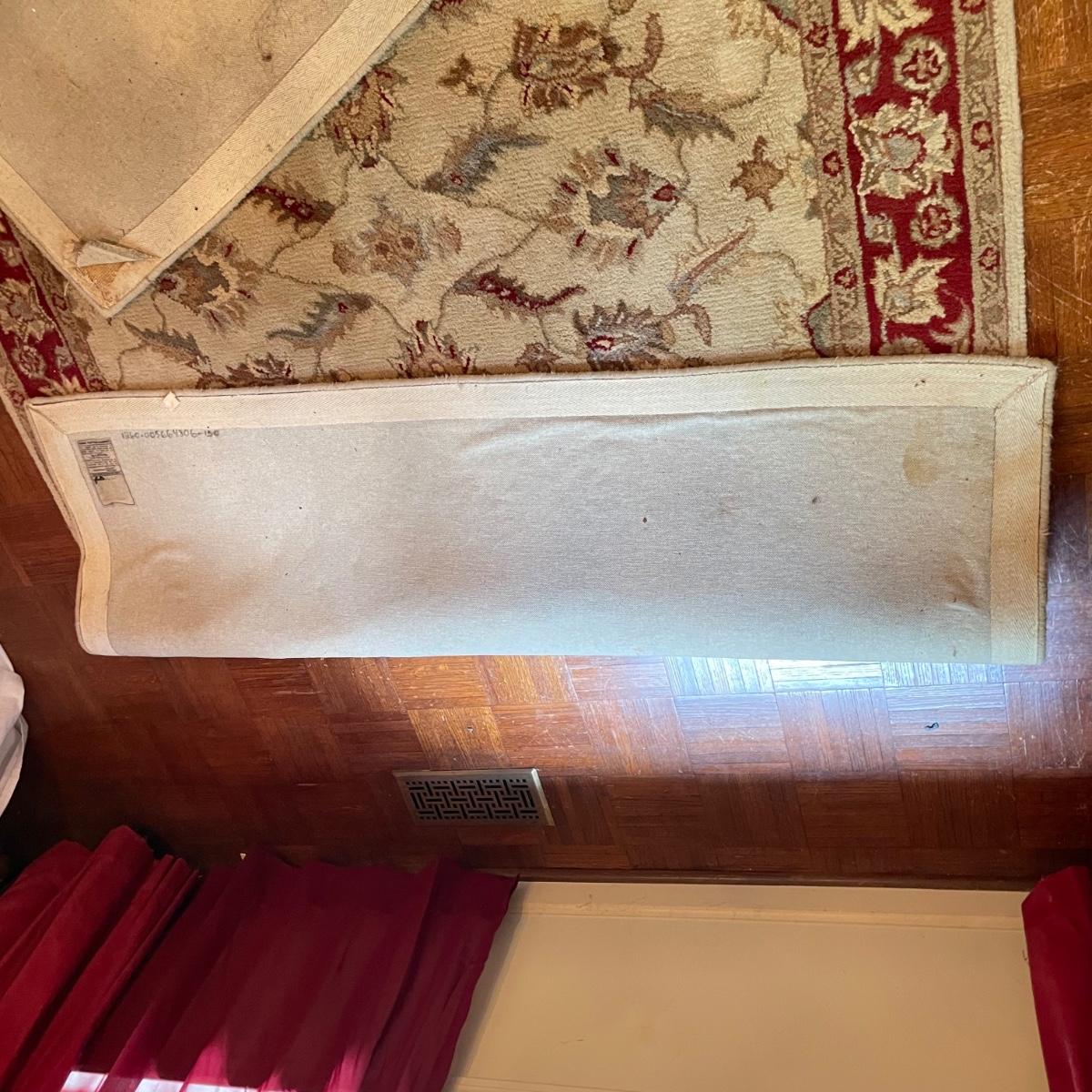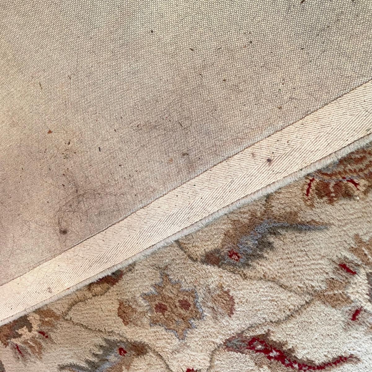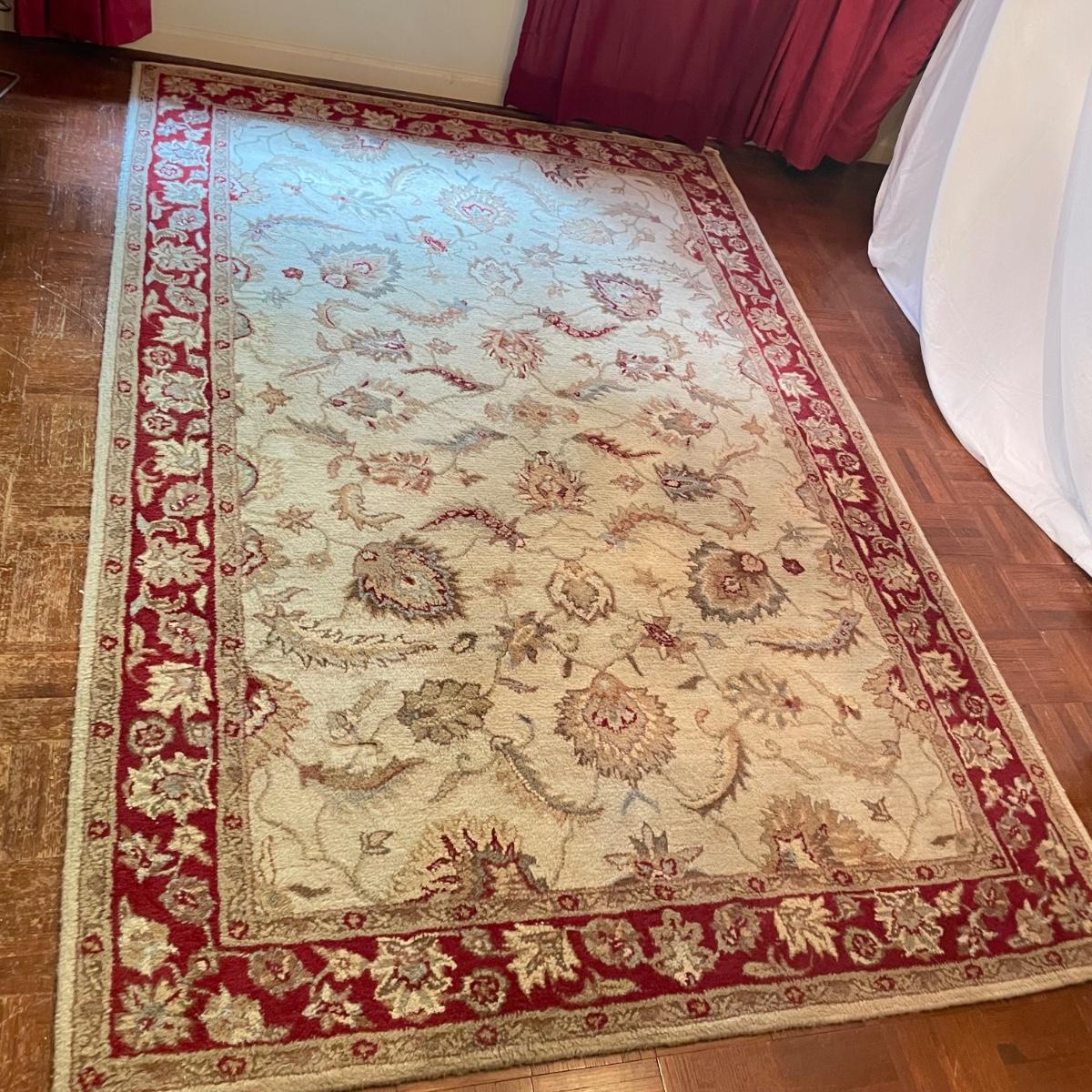 Nicely sized 7’5” x 5’ rug has a tag stating 100% wool and hand tufted in India. Rug has shades of cream and maroon with hints of blue. Rug has some backing beginning to separate, but it is not noticeable from the top. Rug needs cleaning, there is pet hair present. There is also some crinkling inside when we rolled it up, it is not apparent why from the outside. See images. Local pick up only.