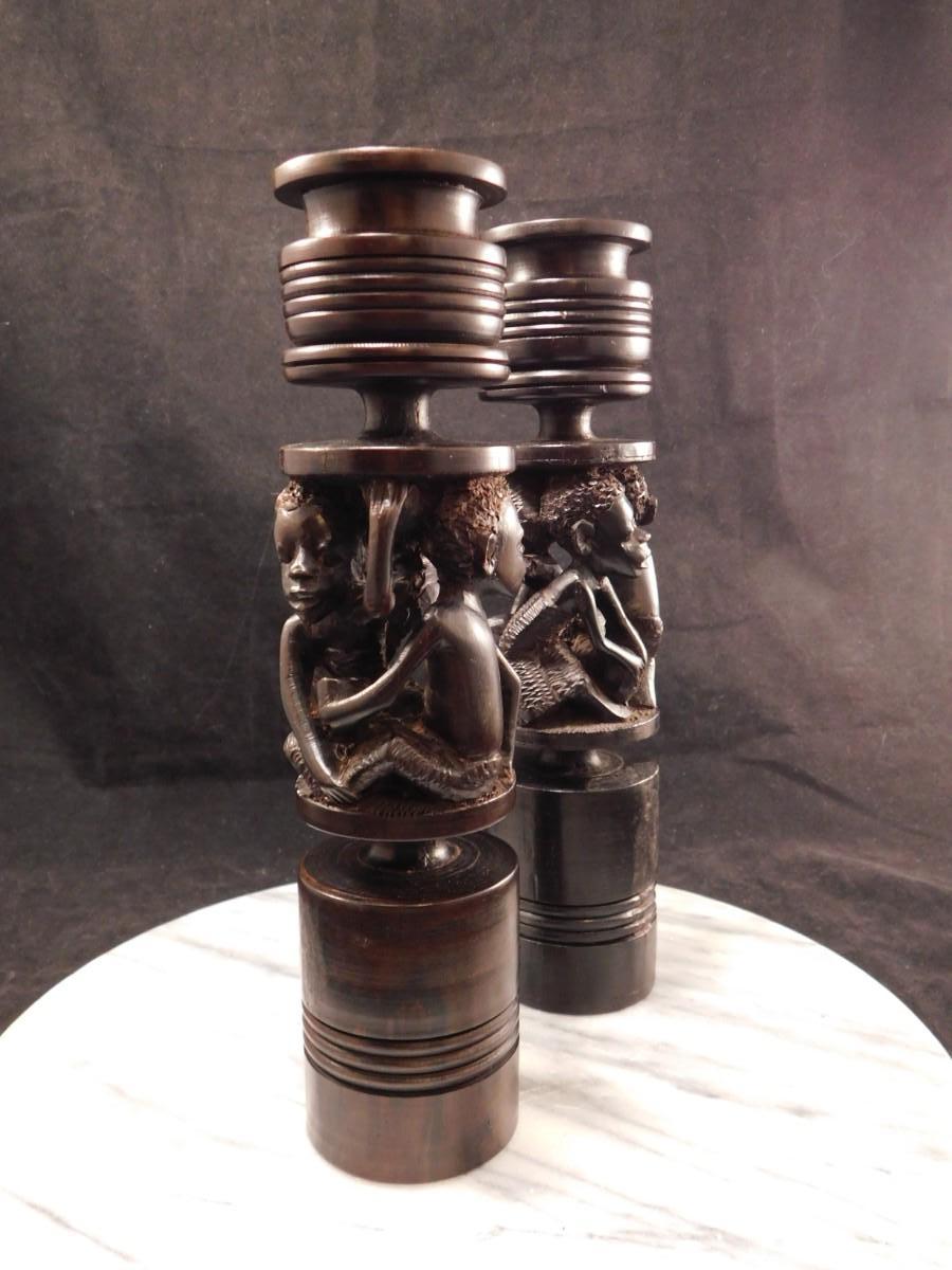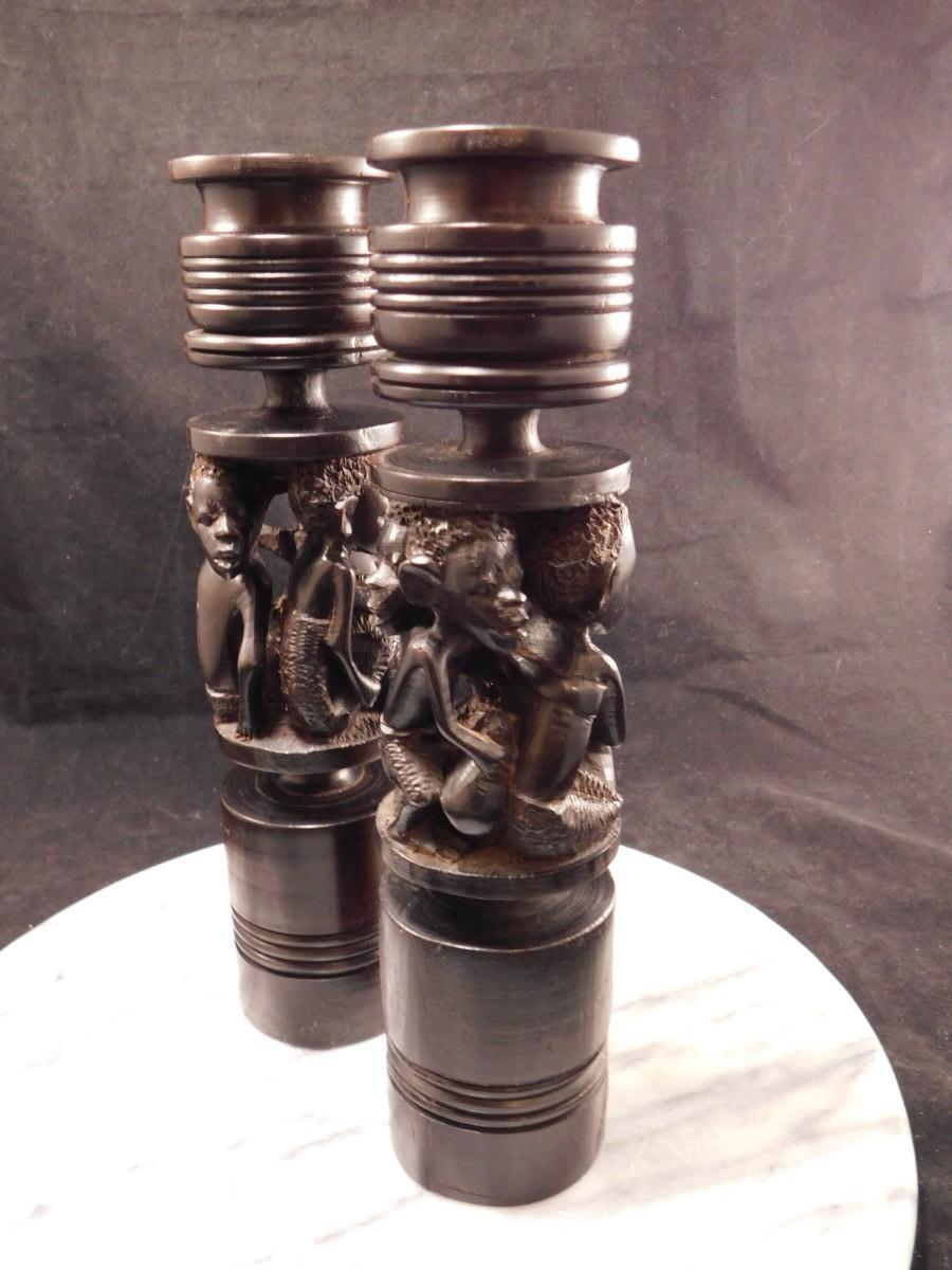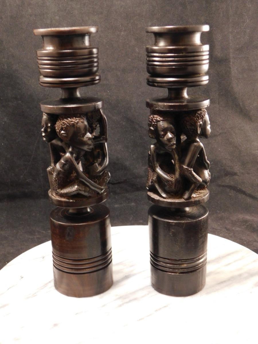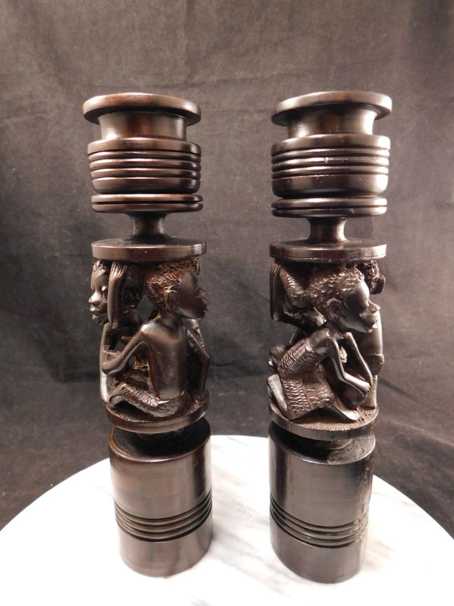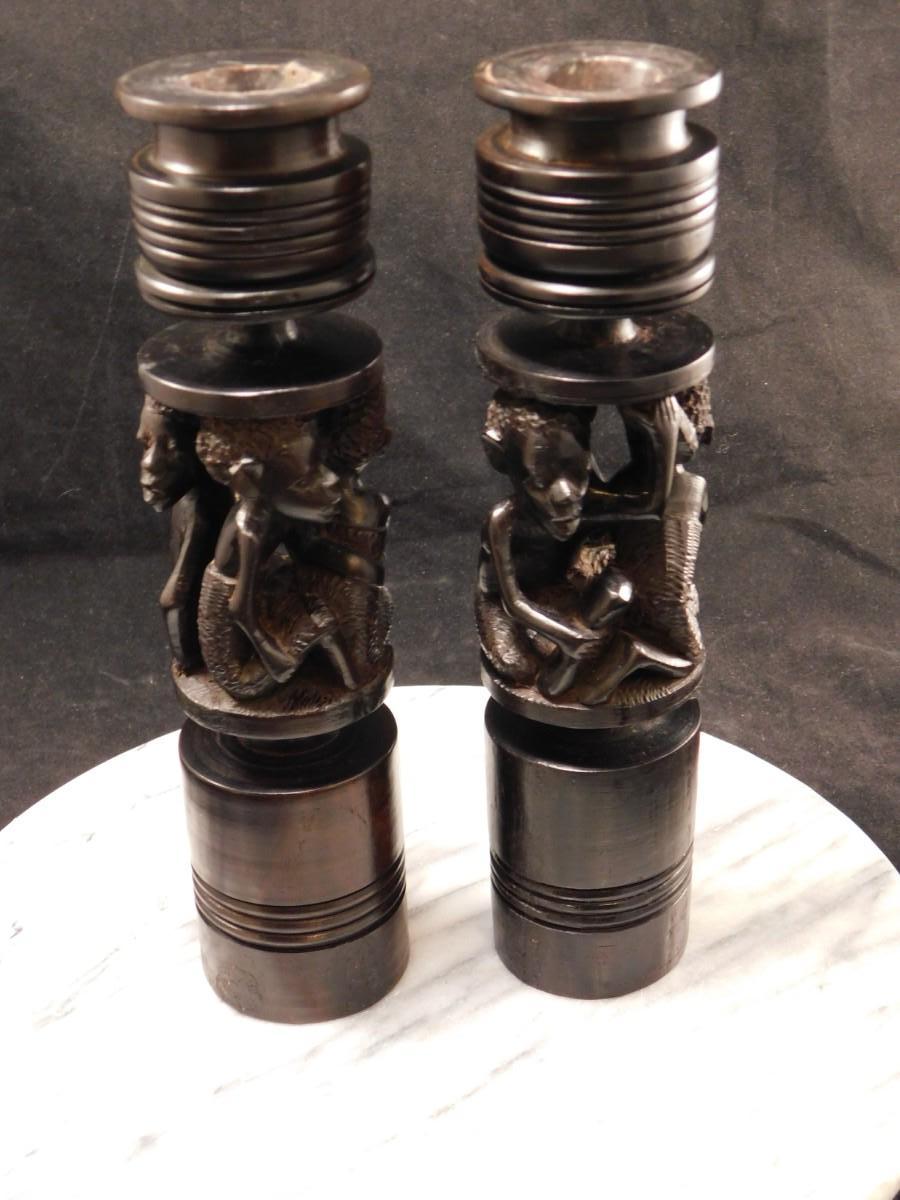 Hand Turned & Carved Wooden Candlesticks, Africa 9.75” Tall