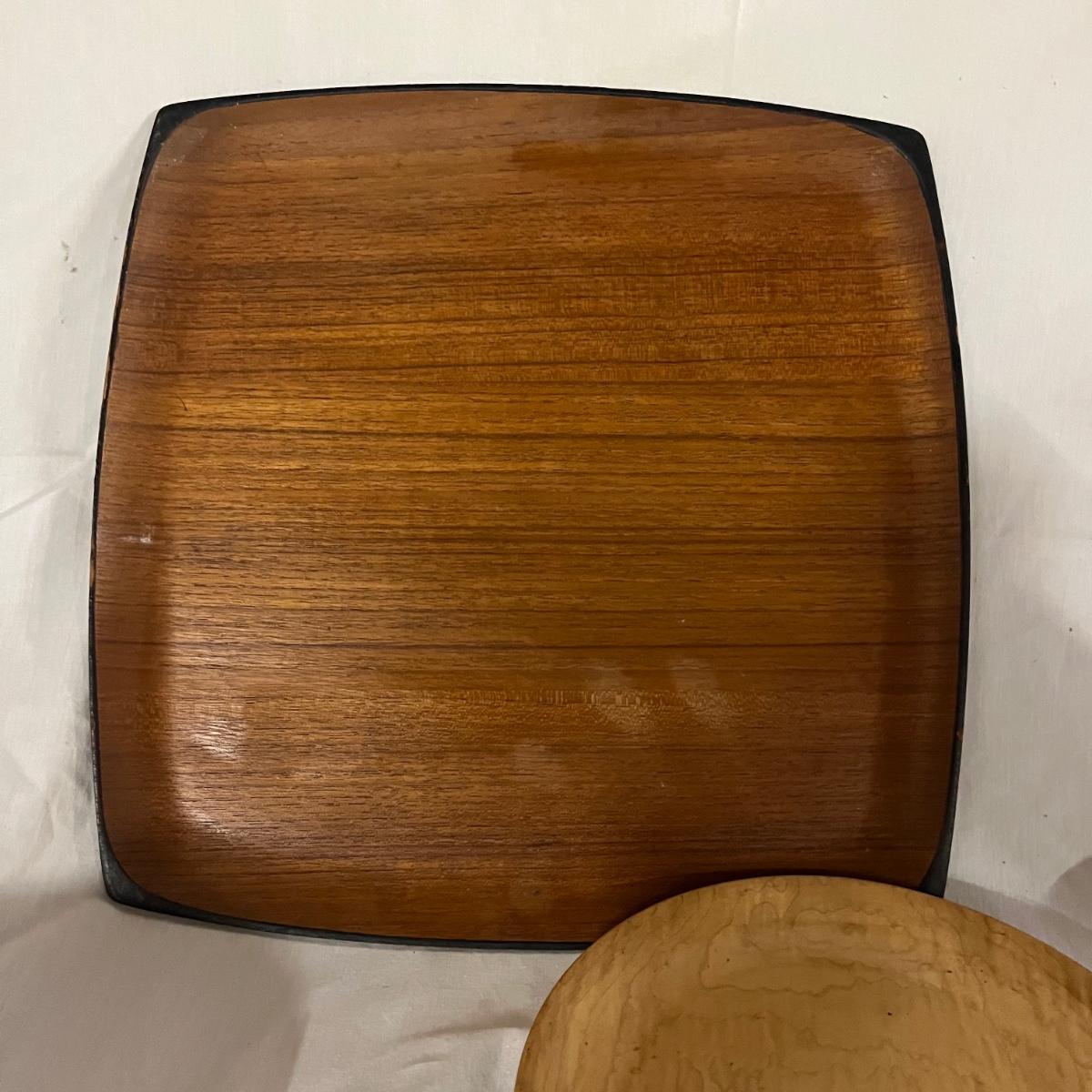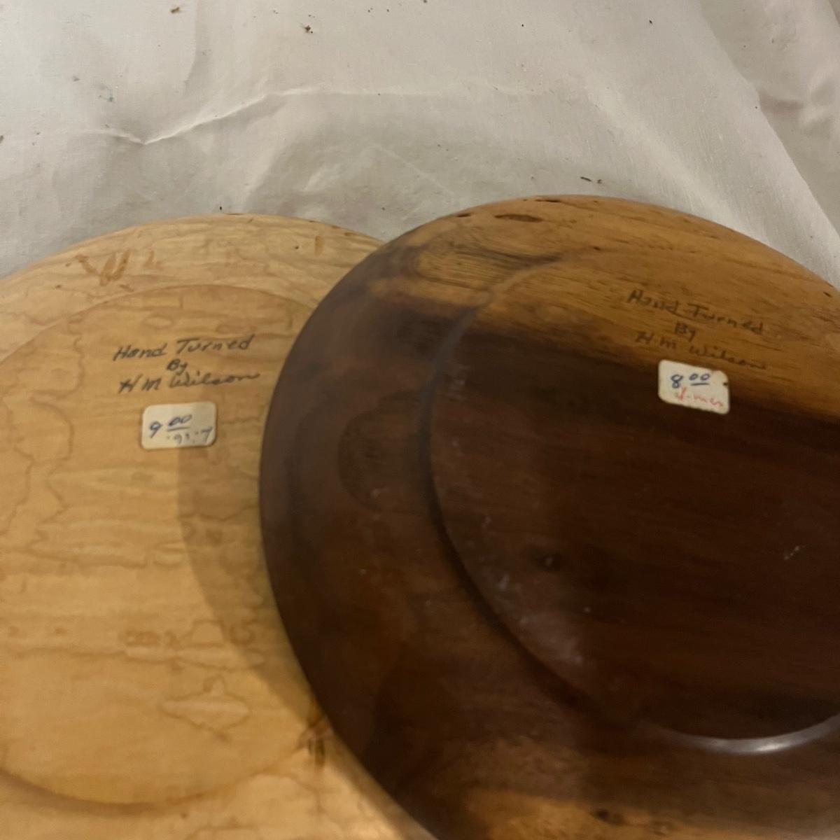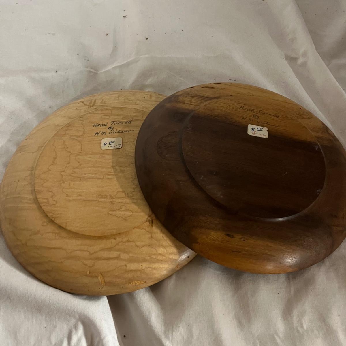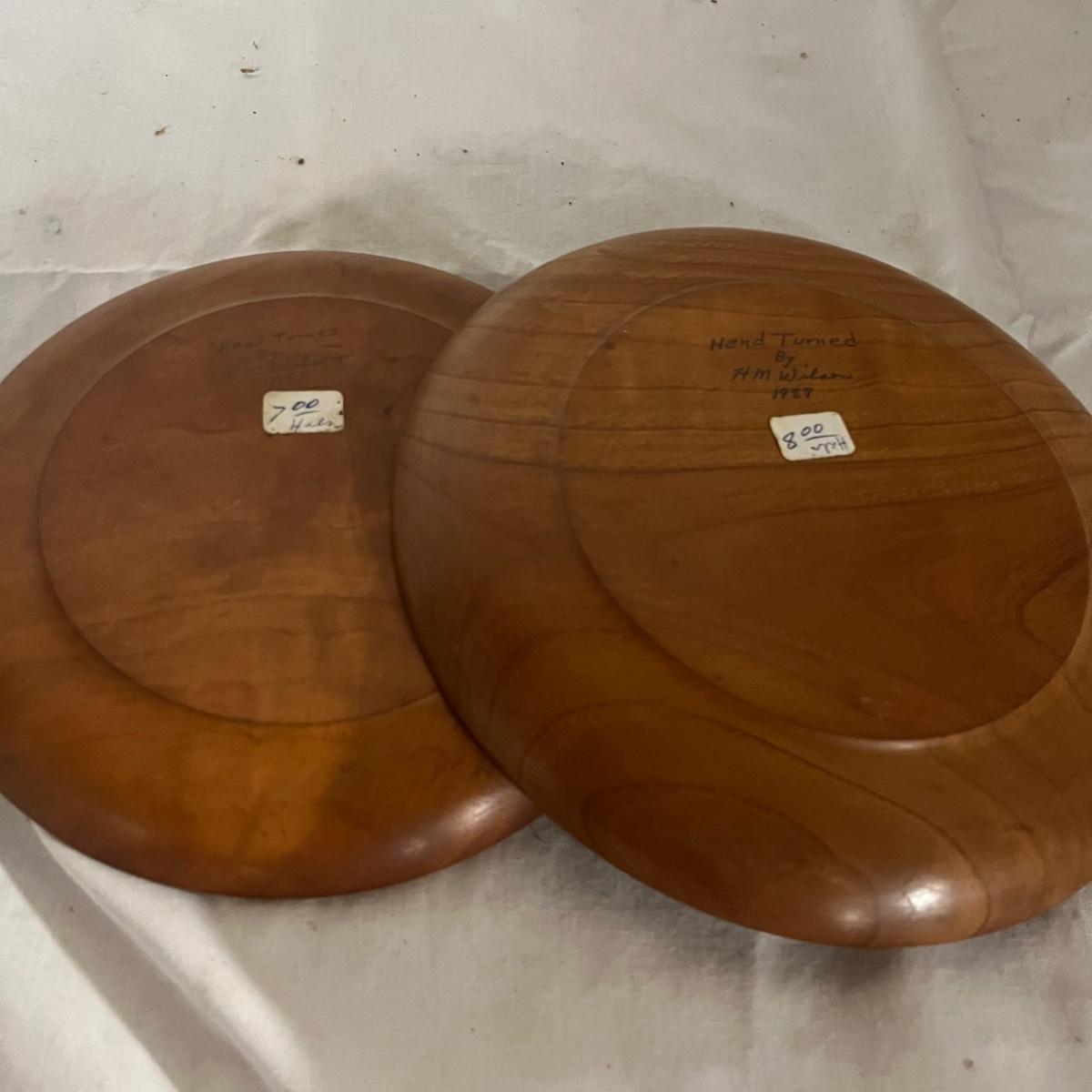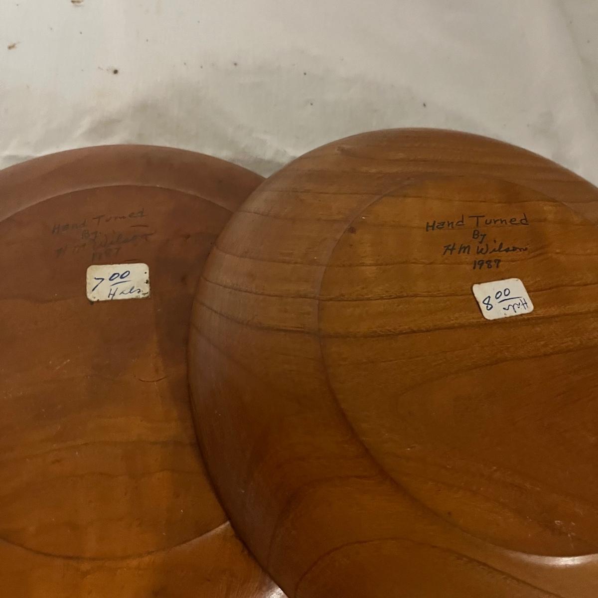 Lot includes Teak tray, large wooden bowl, small wooden bowl, four signed plates by H.M. Wilson, two unsigned plates, bowl and a stainless steel bowl, spoon and tray. Small bowl has stain in bottom, see pictures. Teak tray measures 13.25” x 13.25”. Also includes six steak knives in wooden holder.