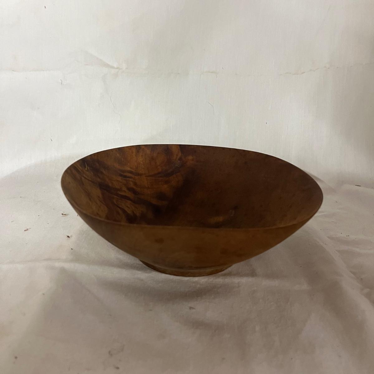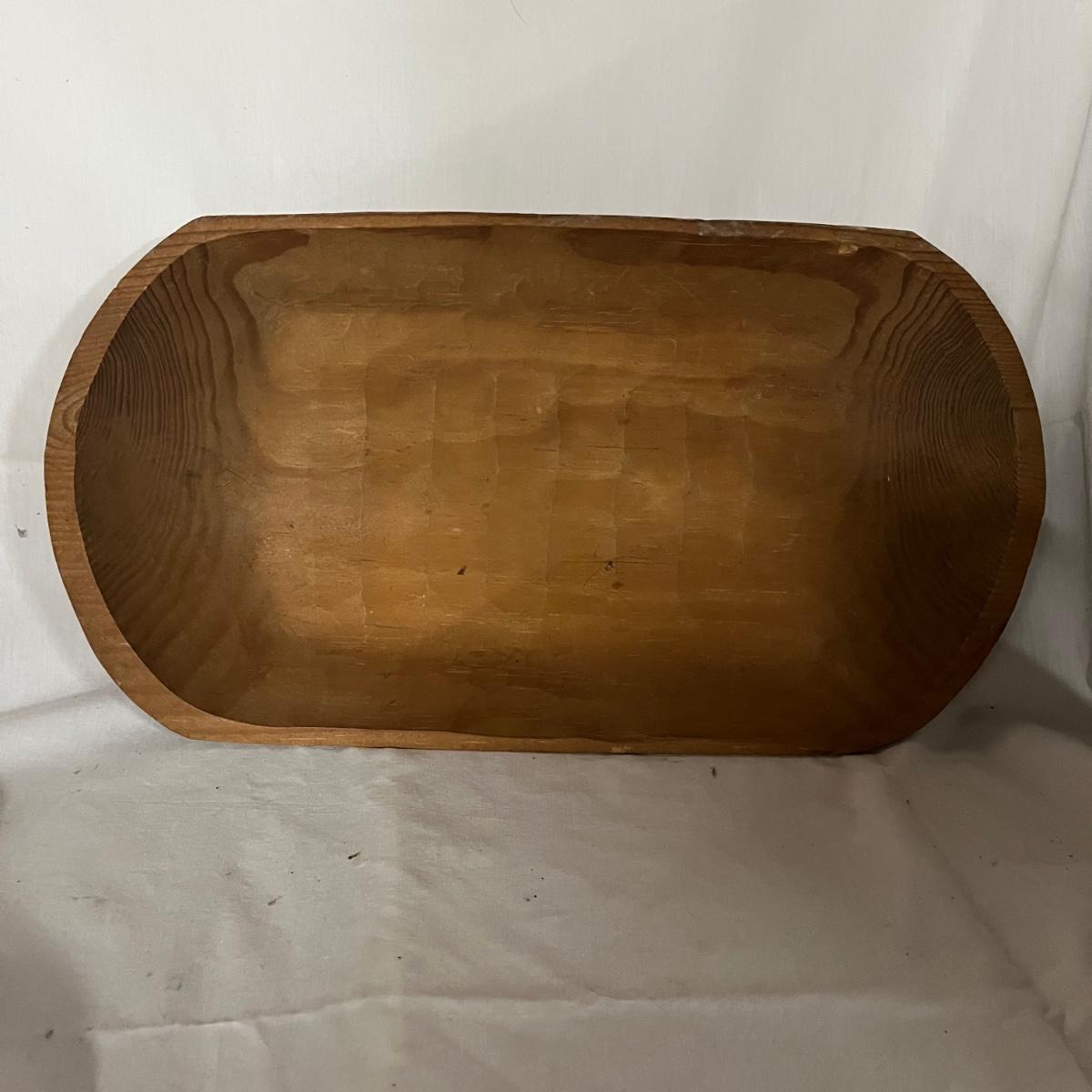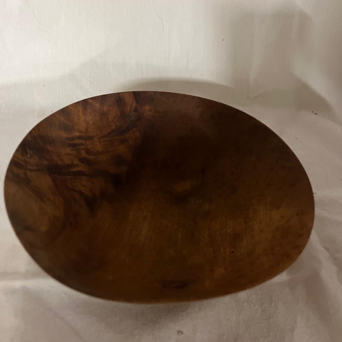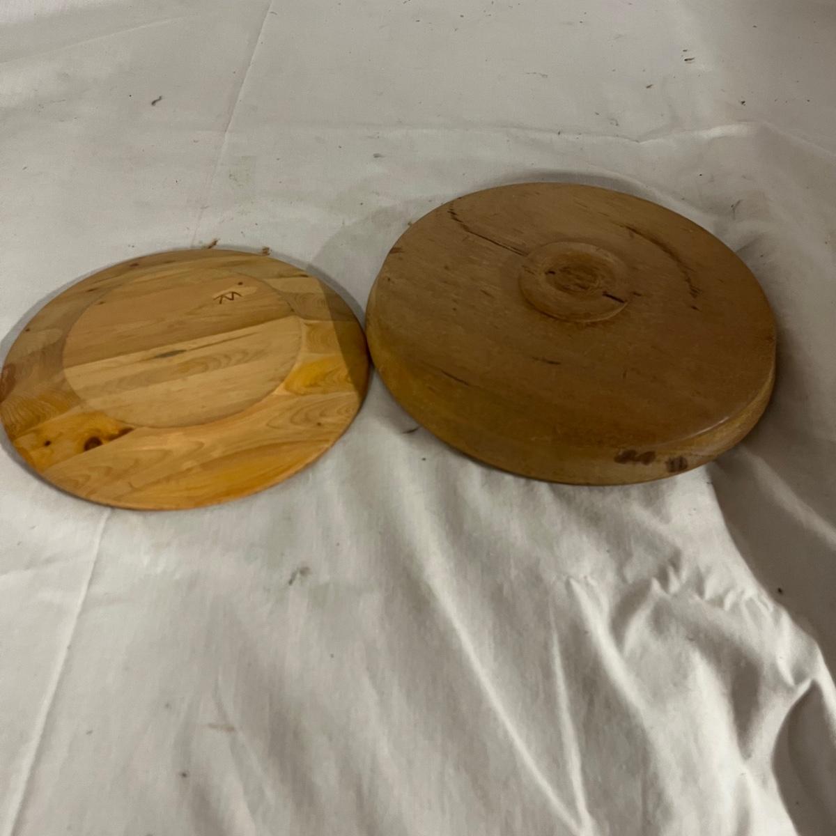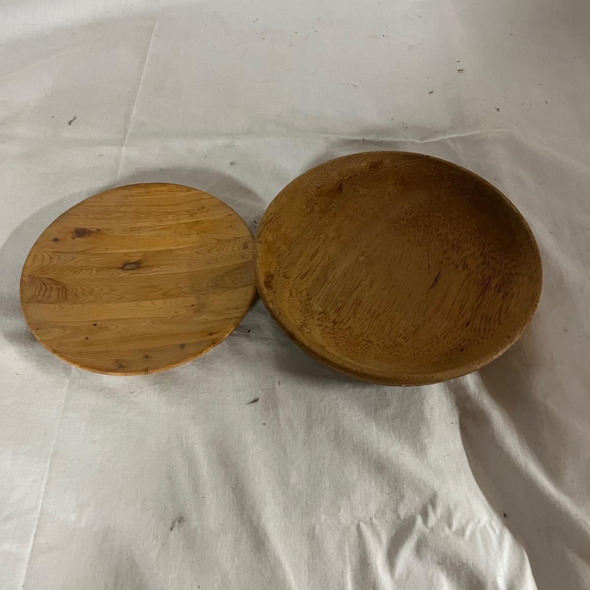 Lot includes Teak tray, large wooden bowl, small wooden bowl, four signed plates by H.M. Wilson, two unsigned plates, bowl and a stainless steel bowl, spoon and tray. Small bowl has stain in bottom, see pictures. Teak tray measures 13.25” x 13.25”. Also includes six steak knives in wooden holder.