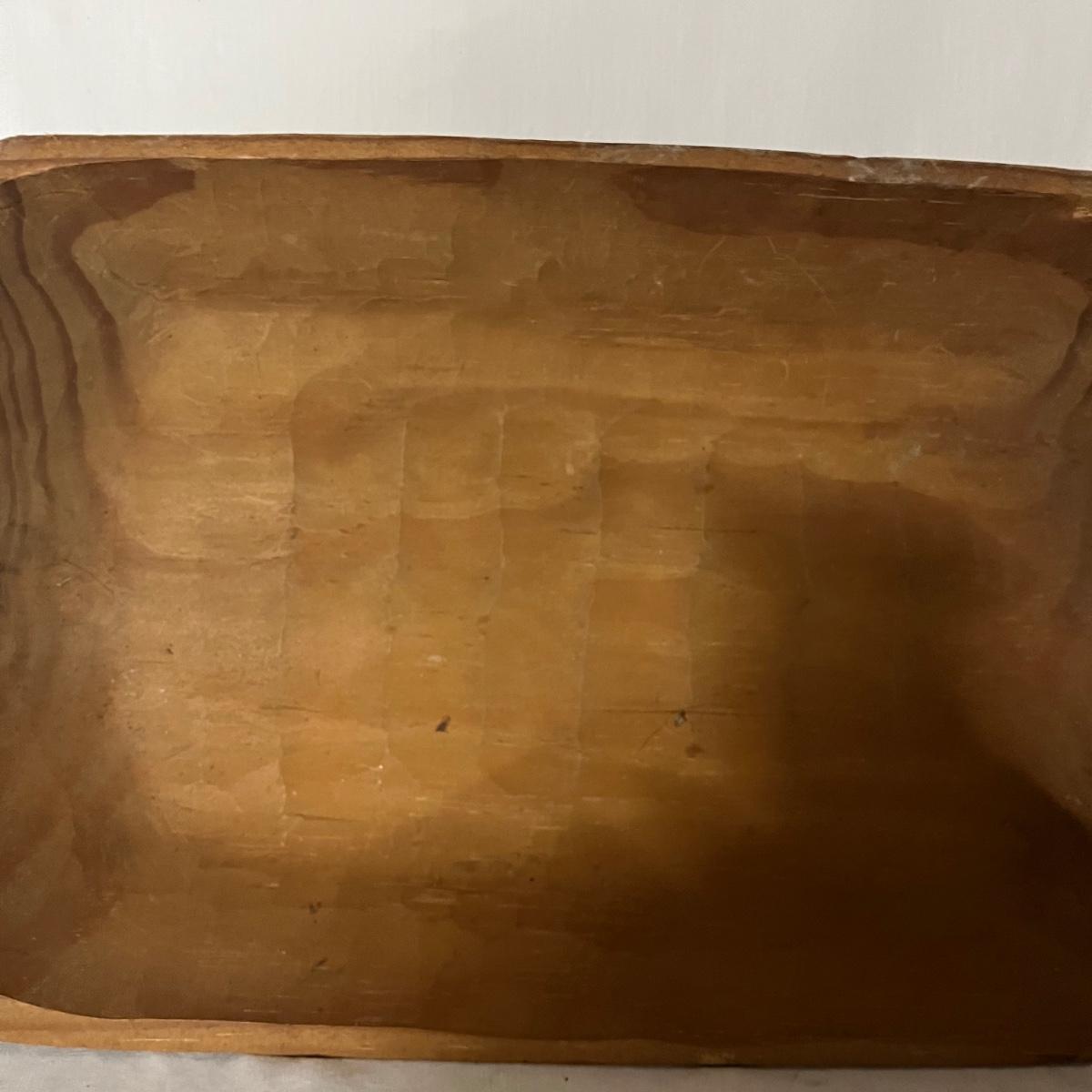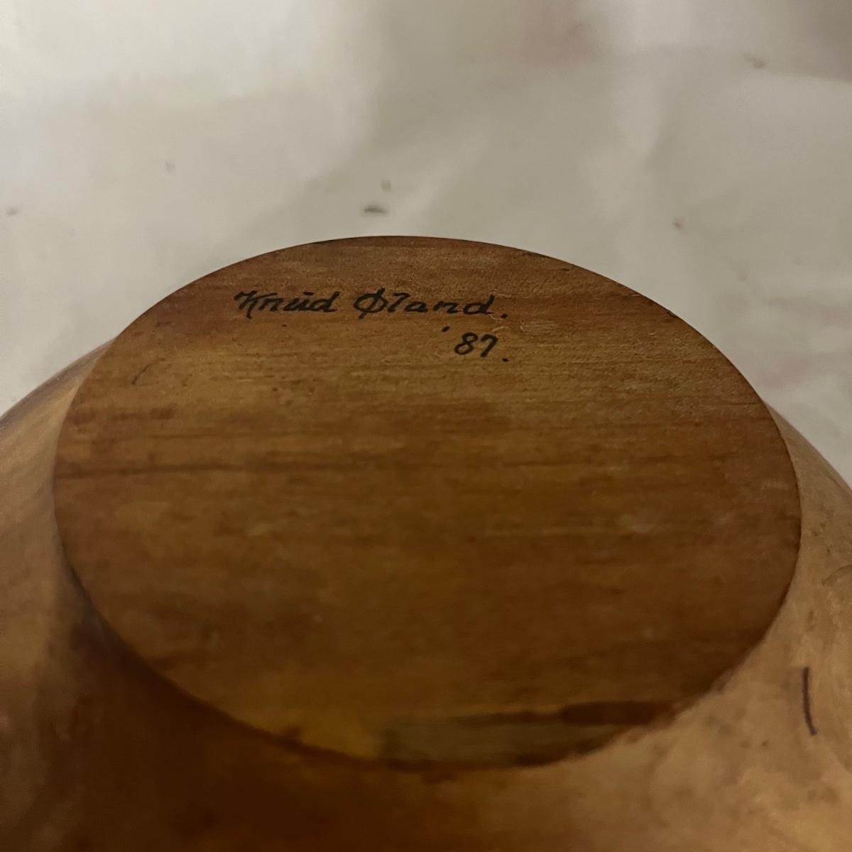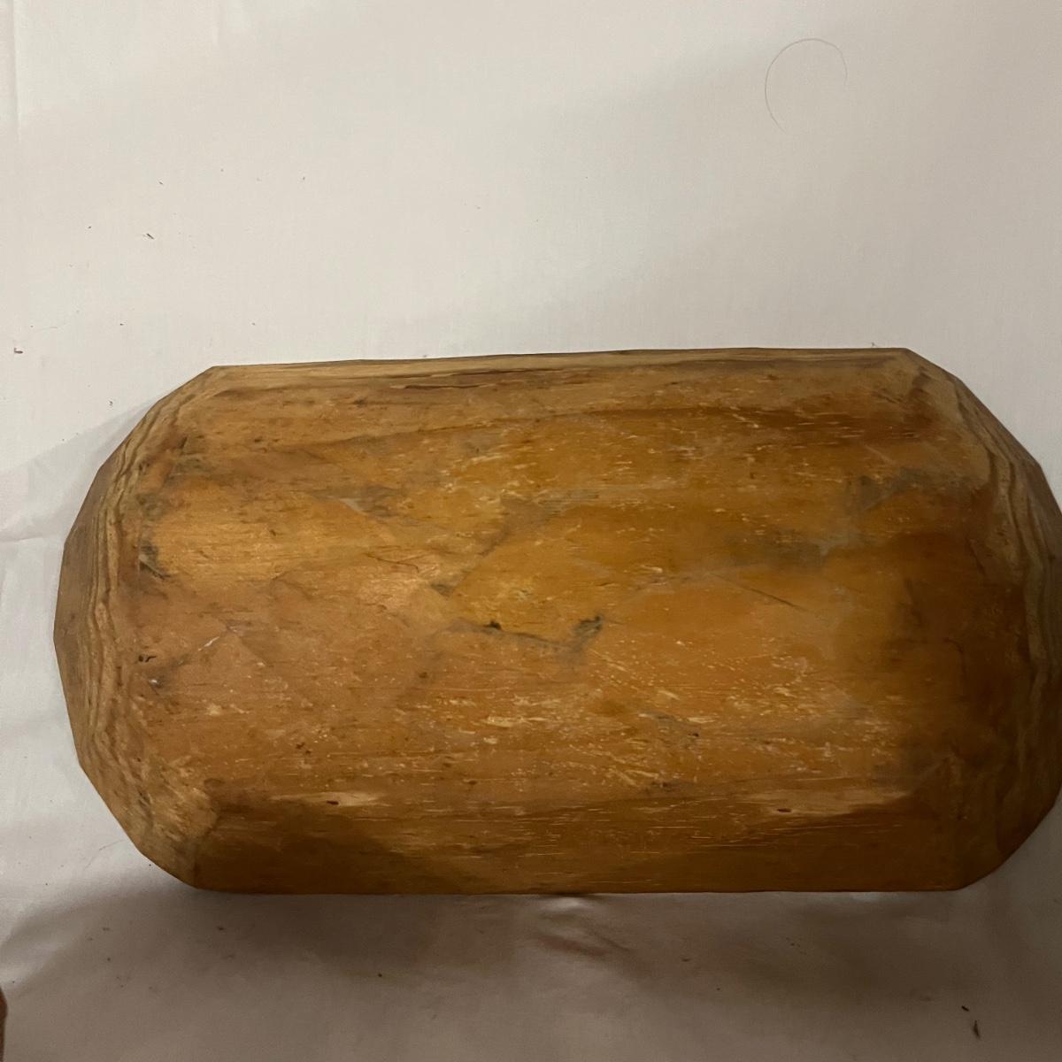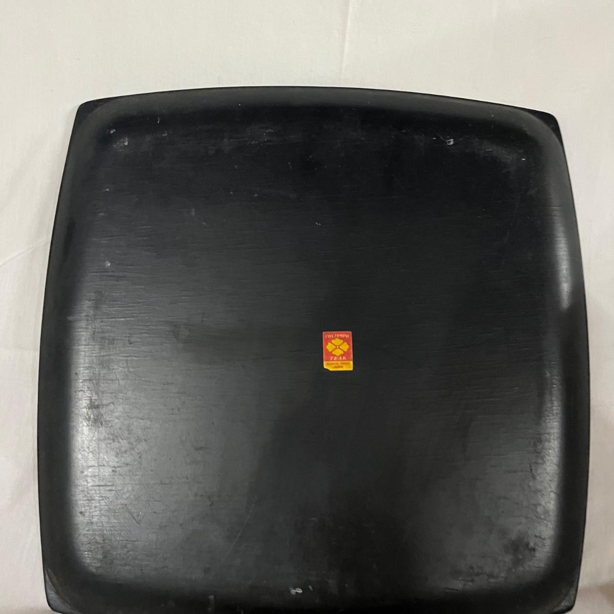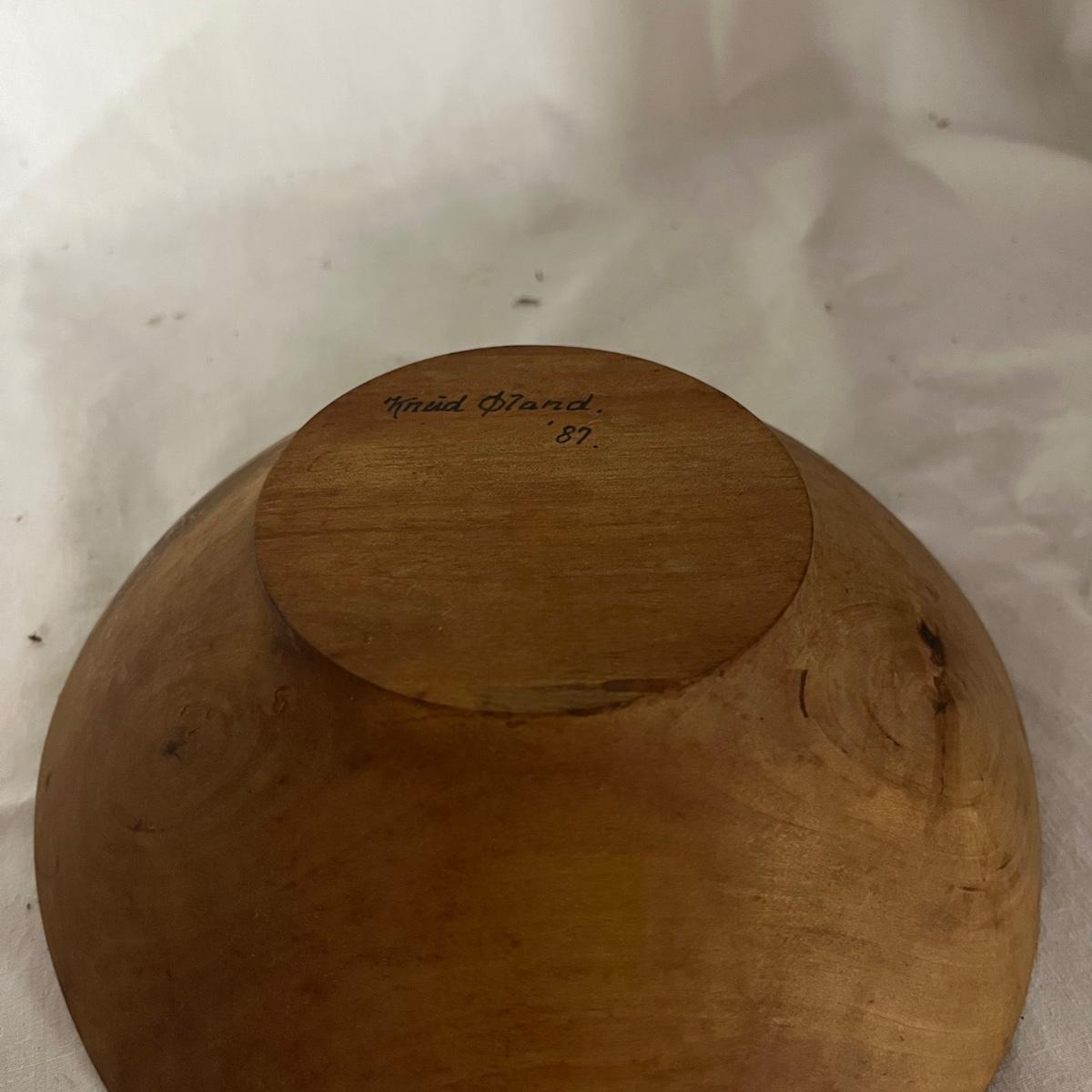 Lot includes Teak tray, large wooden bowl, small wooden bowl, four signed plates by H.M. Wilson, two unsigned plates, bowl and a stainless steel bowl, spoon and tray. Small bowl has stain in bottom, see pictures. Teak tray measures 13.25” x 13.25”. Also includes six steak knives in wooden holder.