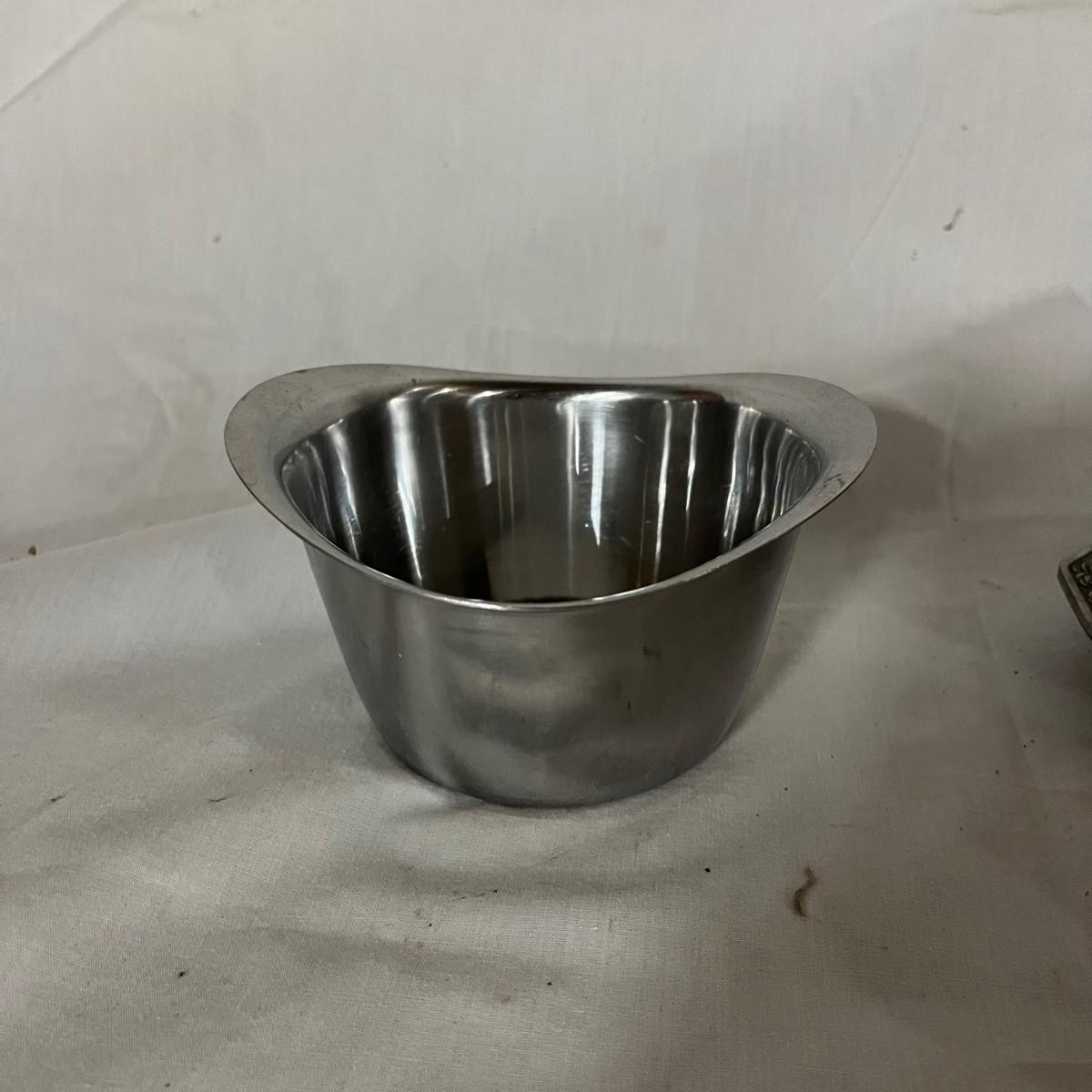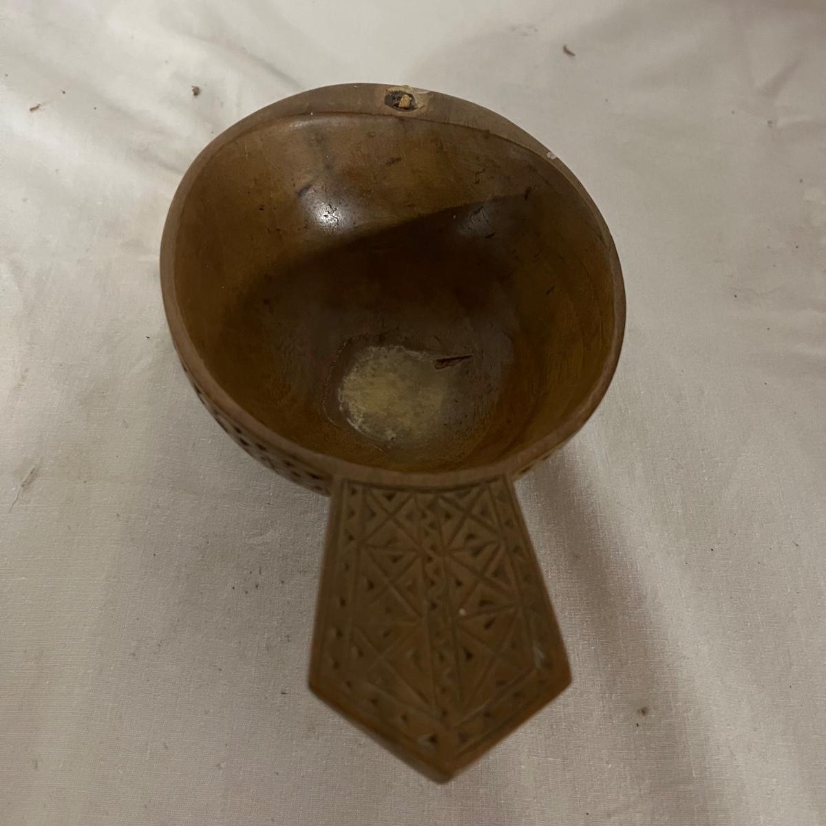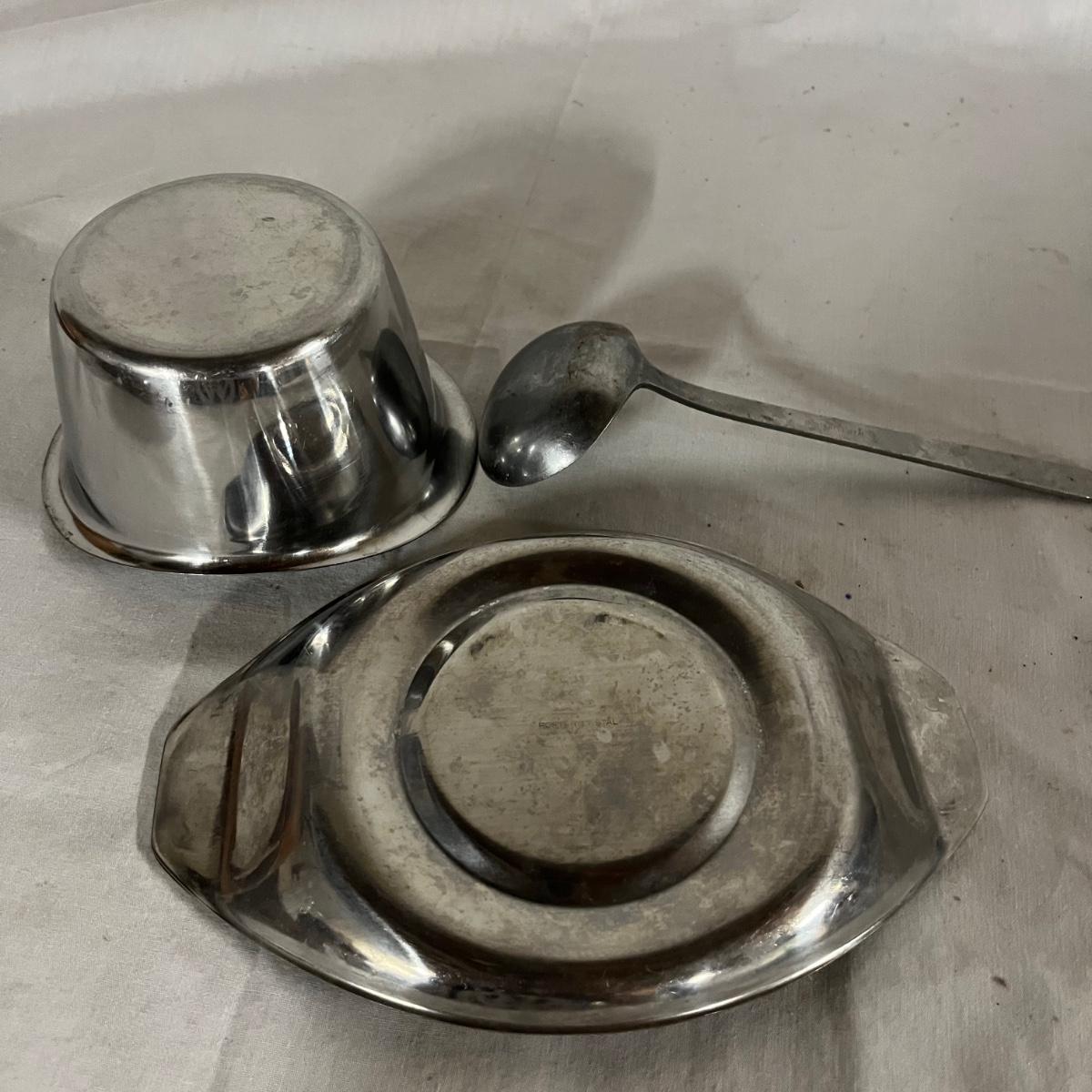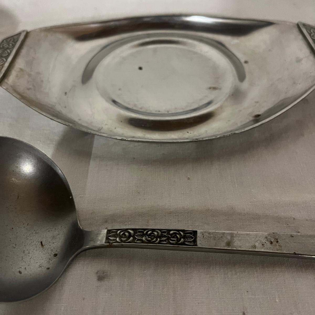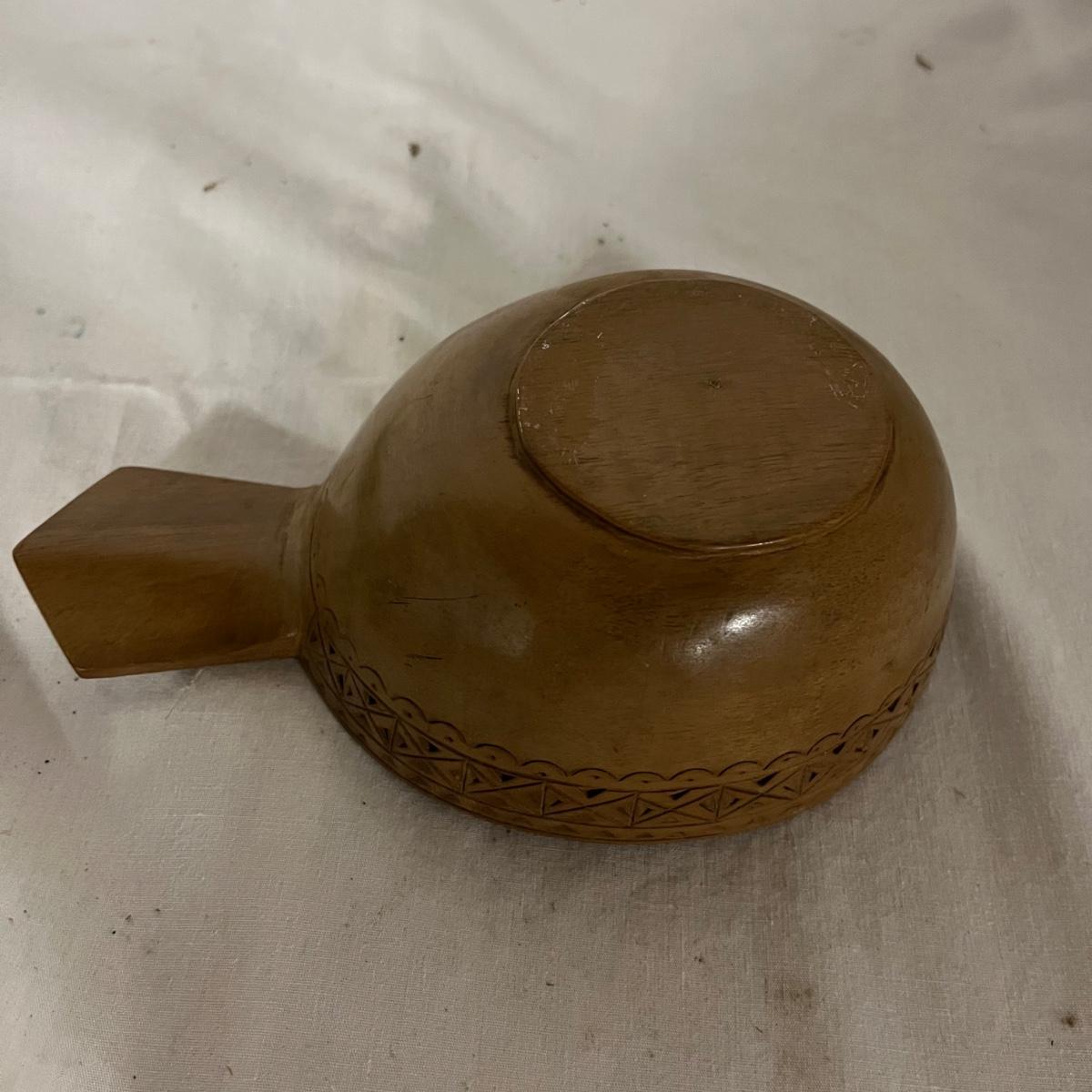 Lot includes Teak tray, large wooden bowl, small wooden bowl, four signed plates by H.M. Wilson, two unsigned plates, bowl and a stainless steel bowl, spoon and tray. Small bowl has stain in bottom, see pictures. Teak tray measures 13.25” x 13.25”. Also includes six steak knives in wooden holder.