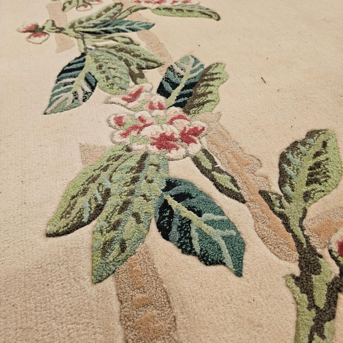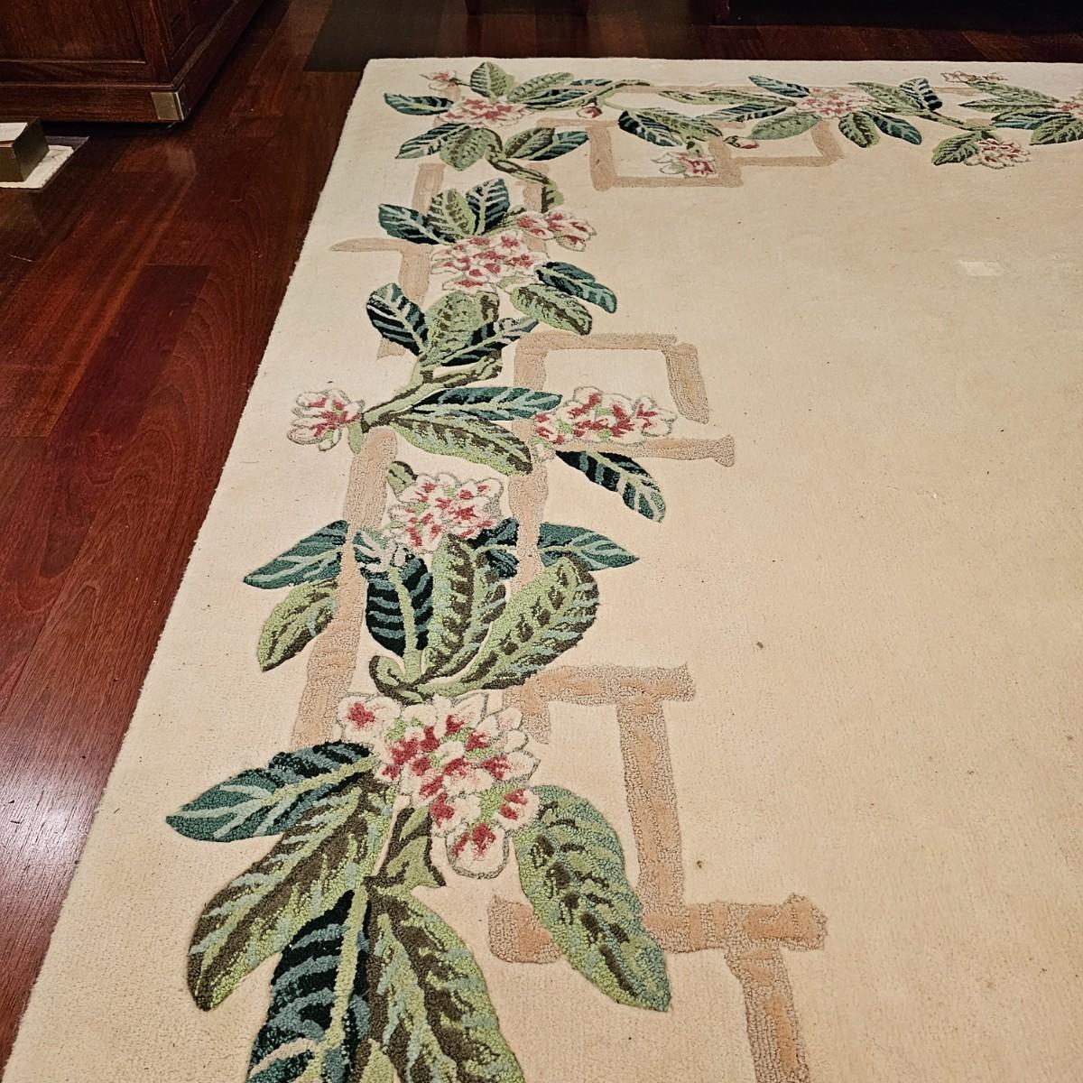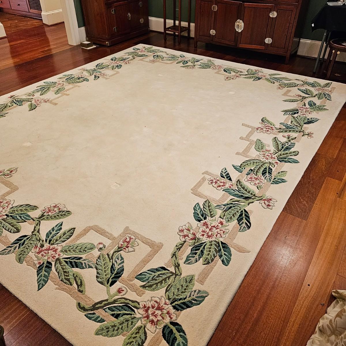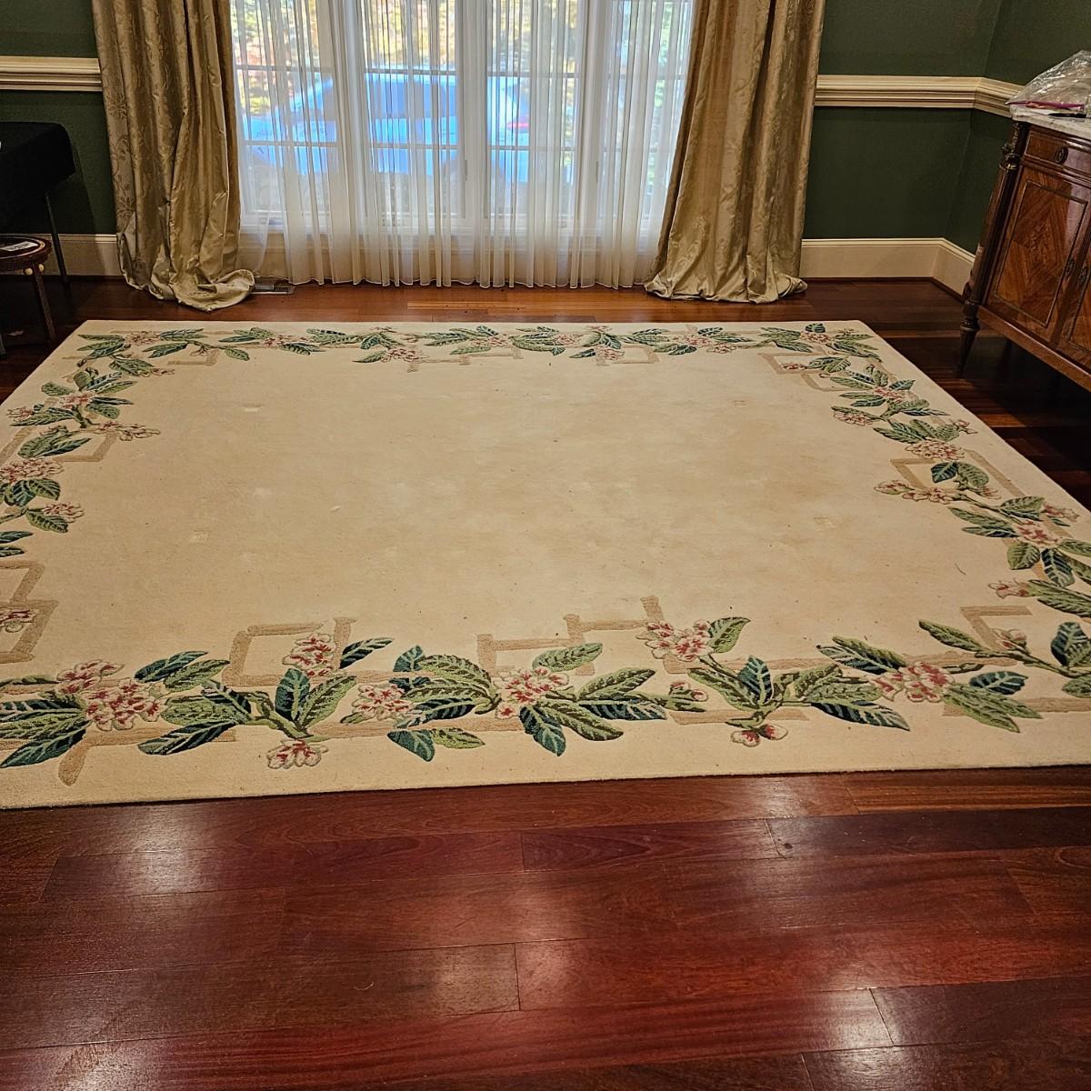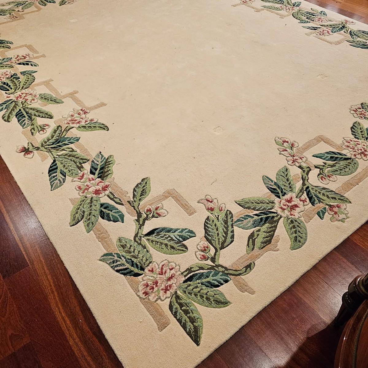 Beautiful cream and floral hand woven rug with floral/trellis border. Rug has sculptured flowers and leaves along edge, fully bound edges on back and also has a full pad. Some minor spots on back of rug, see photos for details. Local pickup only. Winning bidder must bring assistance to help move and load this item due to its weight and/or size.