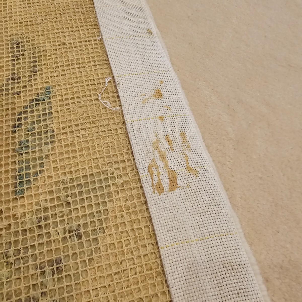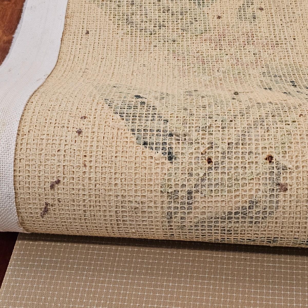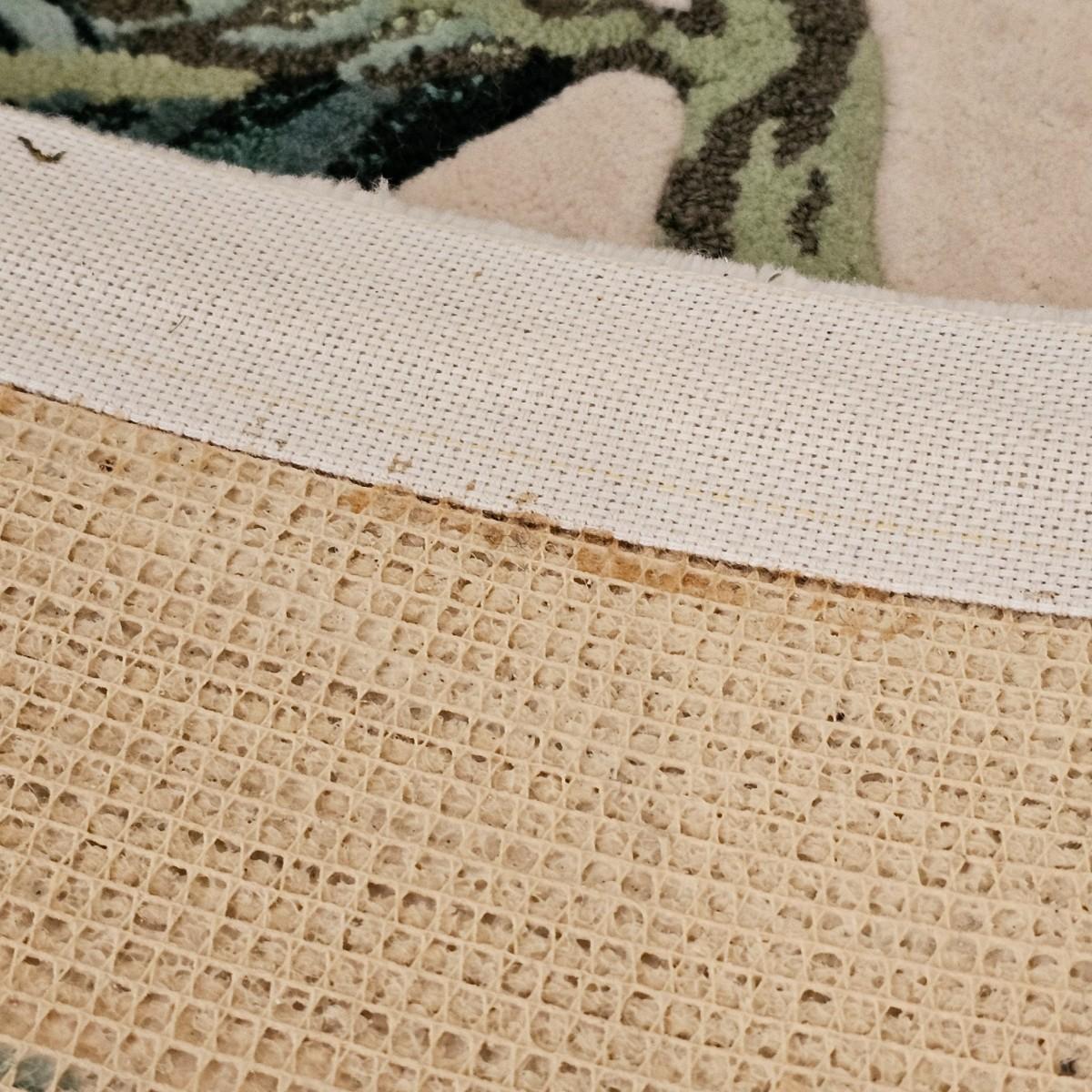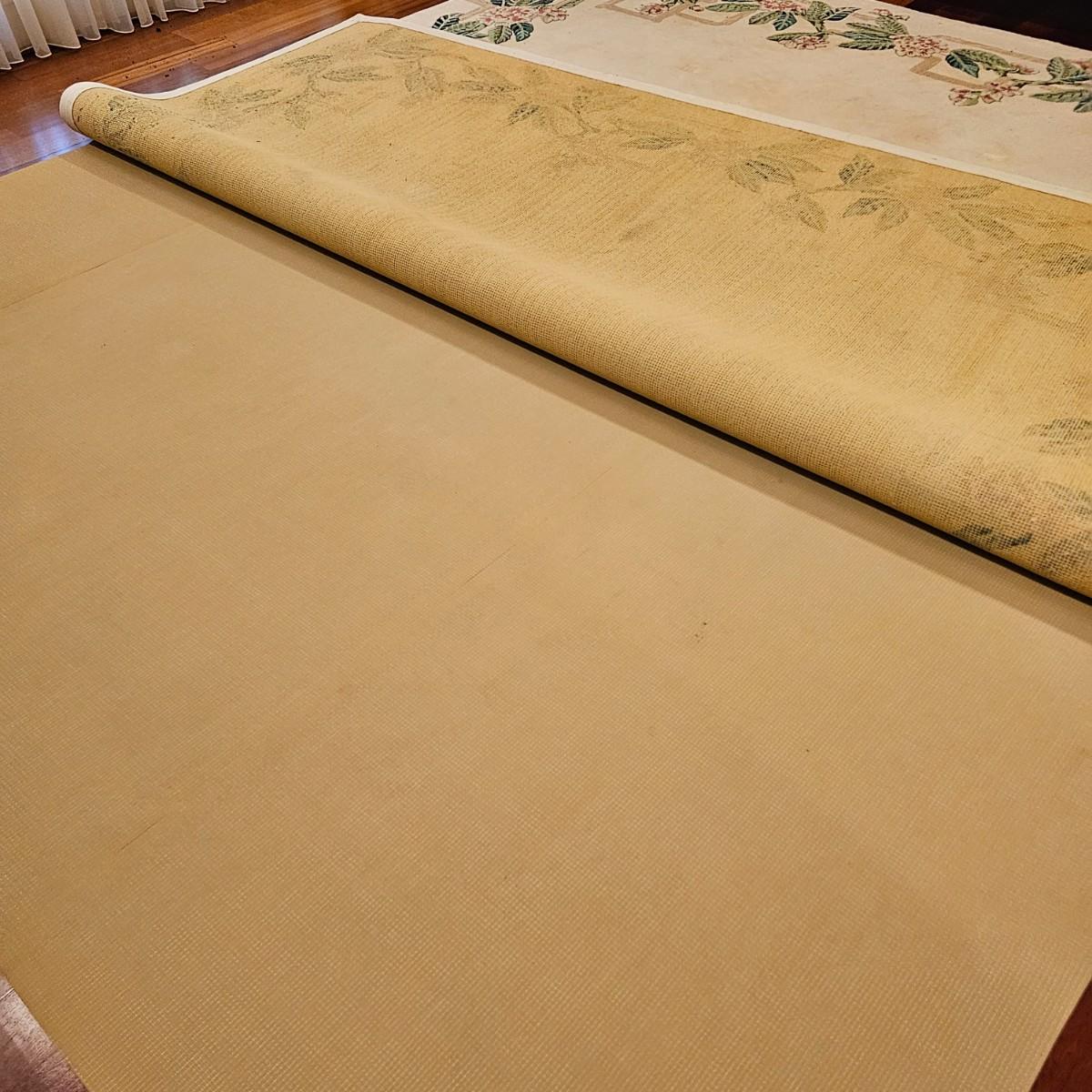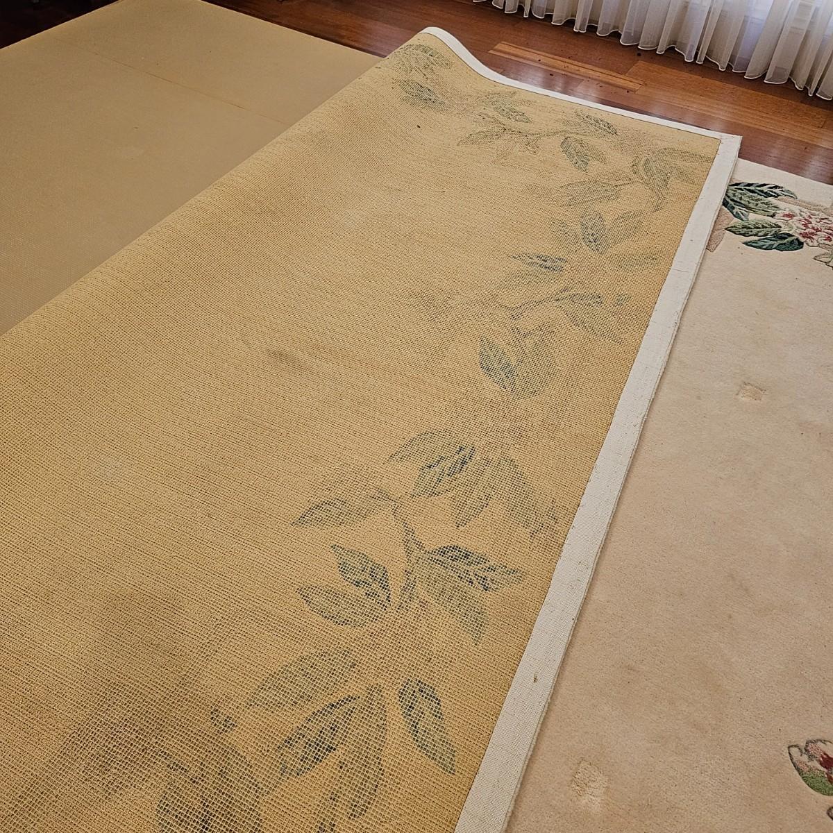 Beautiful cream and floral hand woven rug with floral/trellis border. Rug has sculptured flowers and leaves along edge, fully bound edges on back and also has a full pad. Some minor spots on back of rug, see photos for details. Local pickup only. Winning bidder must bring assistance to help move and load this item due to its weight and/or size.
