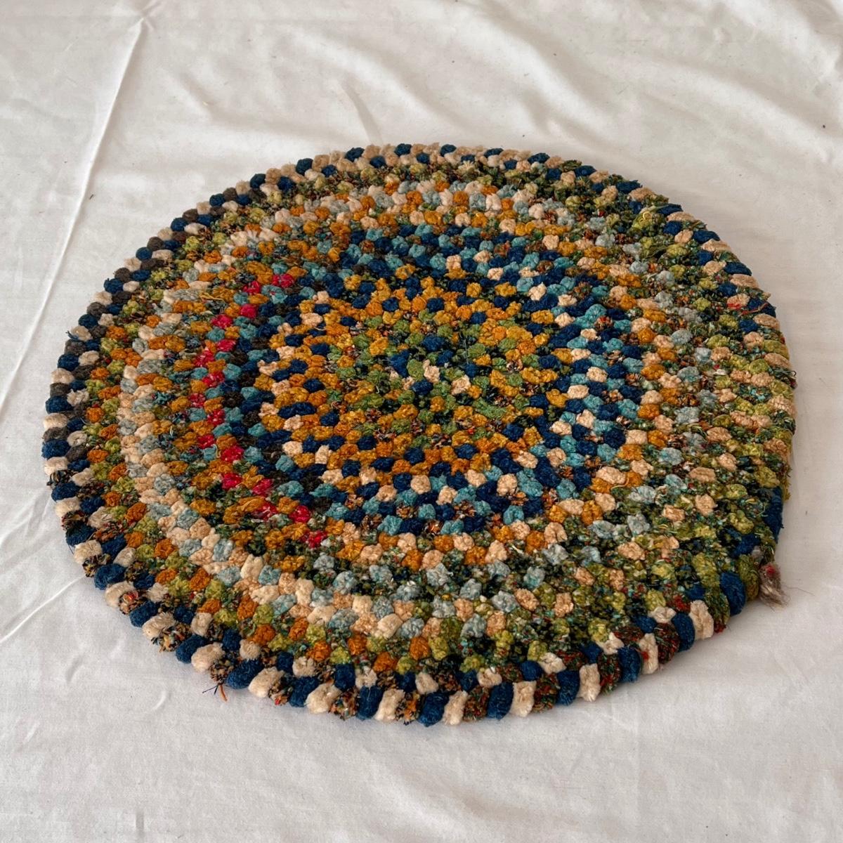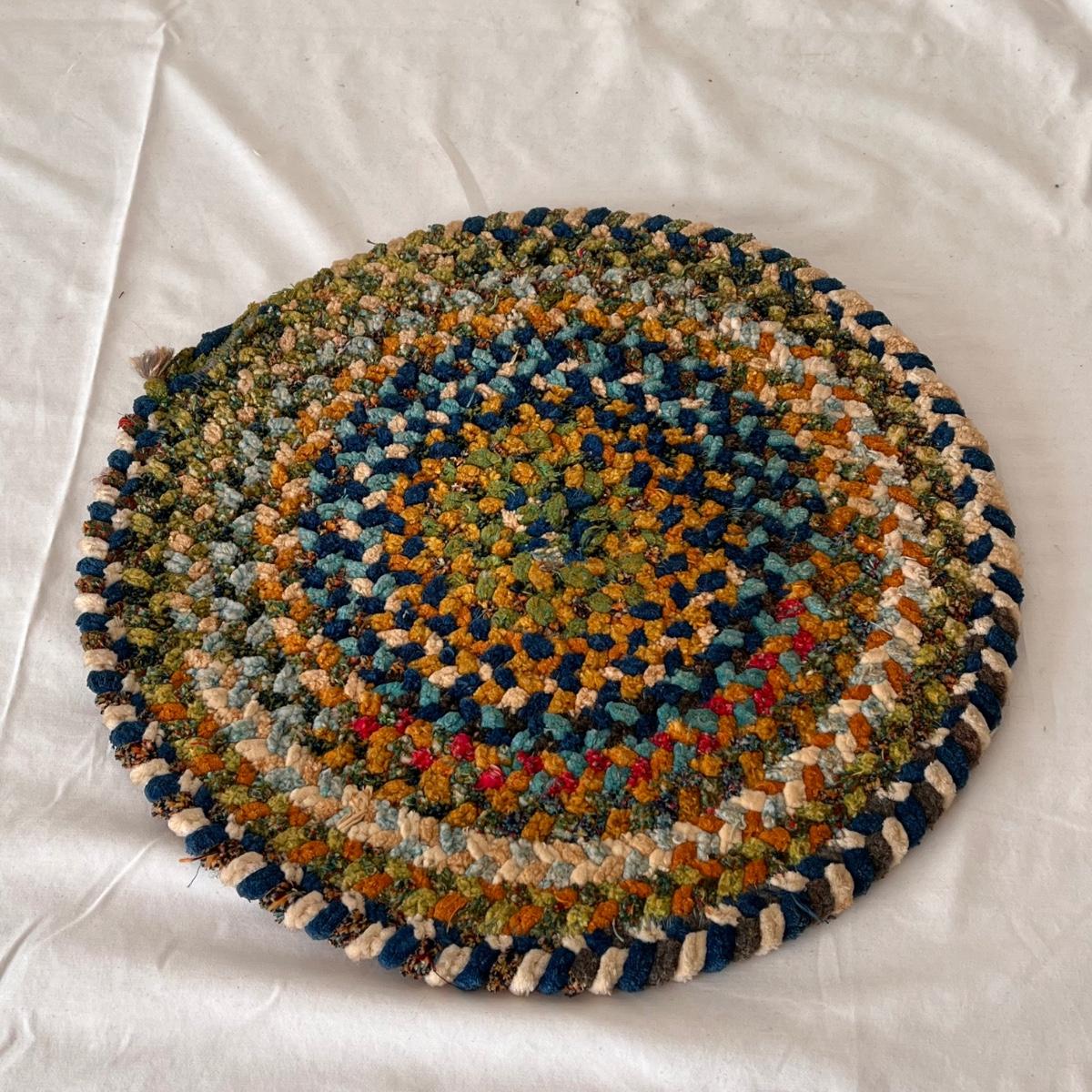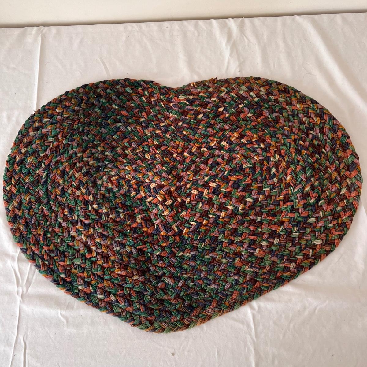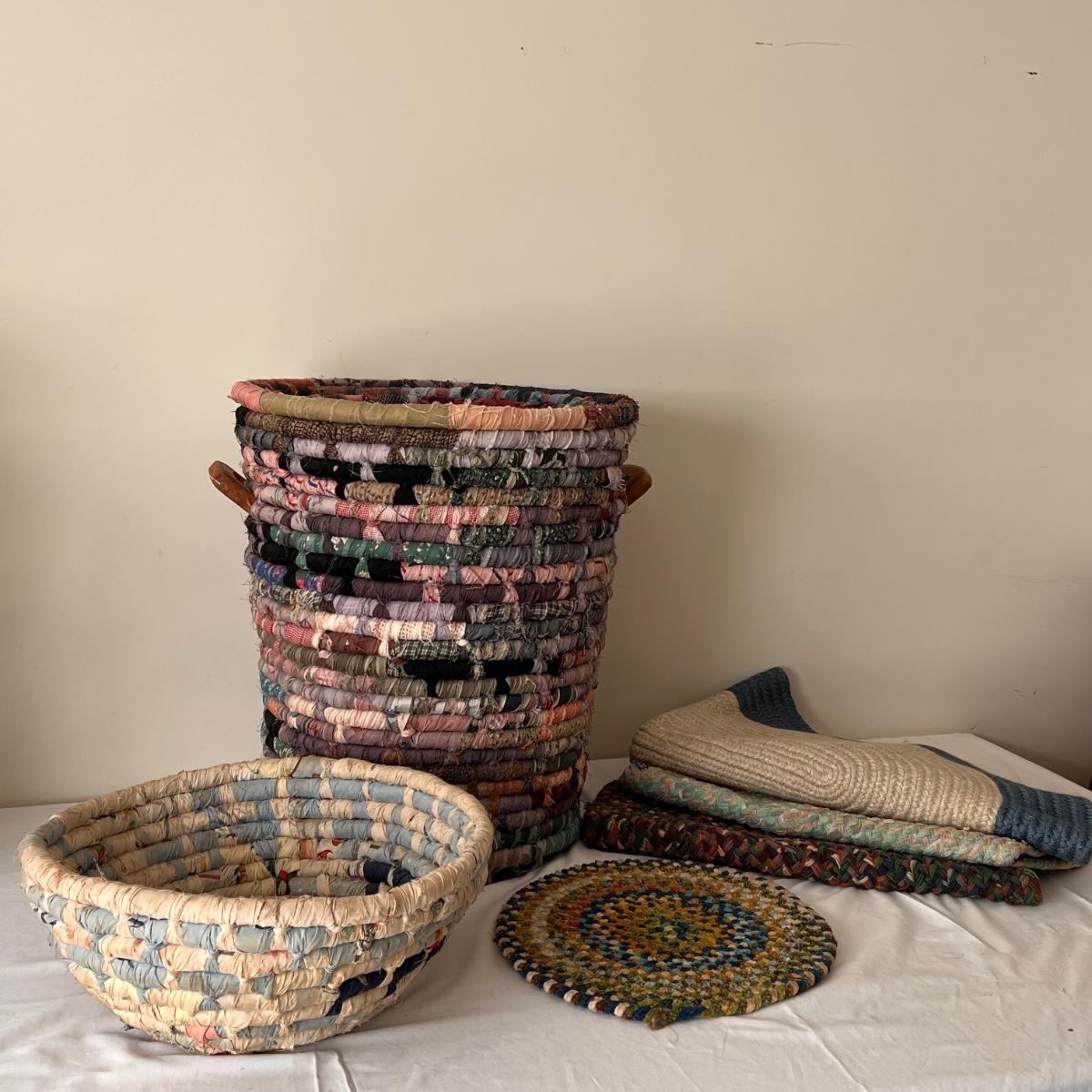 This lot includes three rugs, one large basket with a removable lid, a round mat, and a smaller basket. Two of the rugs appear to be hand woven into a heart braid. The largest is the tan and blue rug that measures 44” x 26”H. The large basket measures 21”D x 23”H. Shipping available.