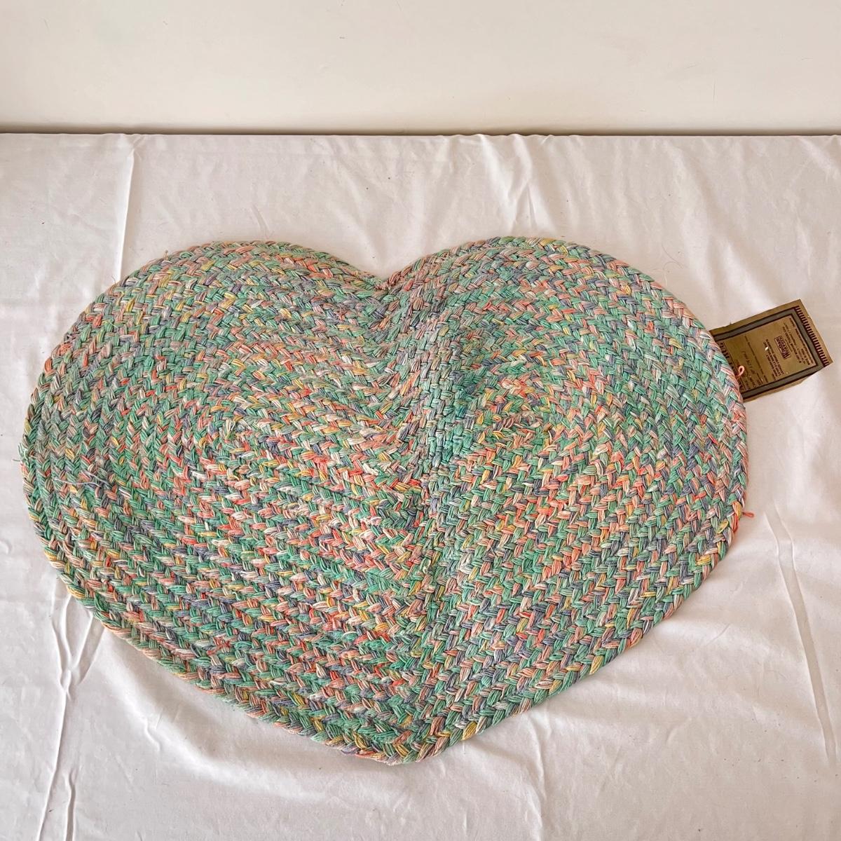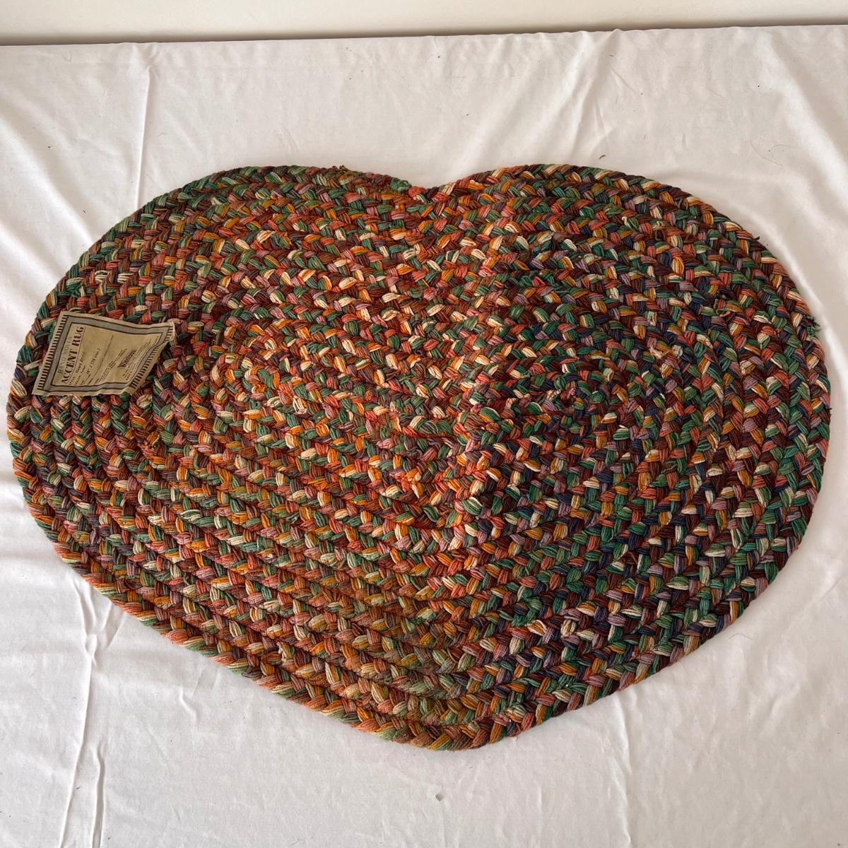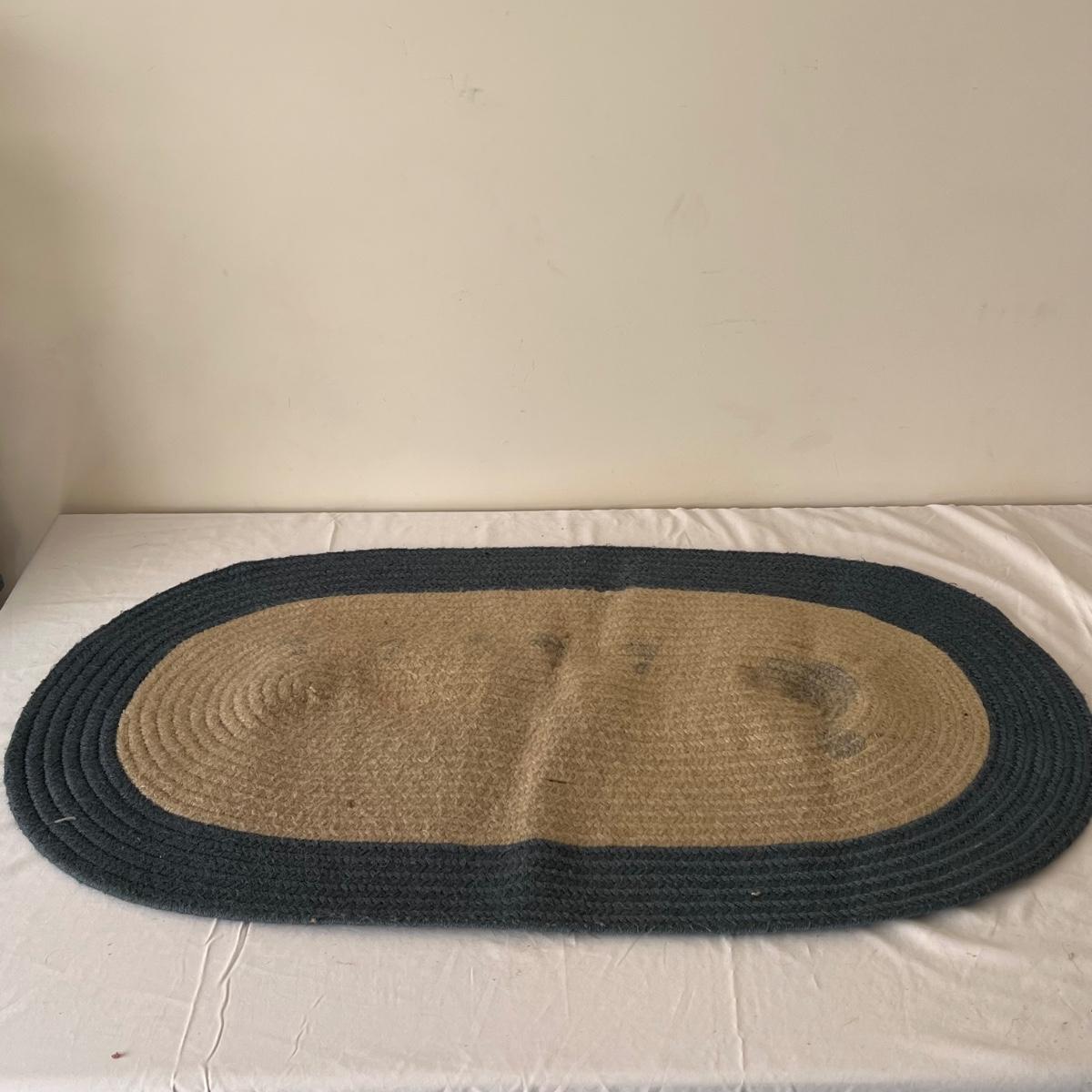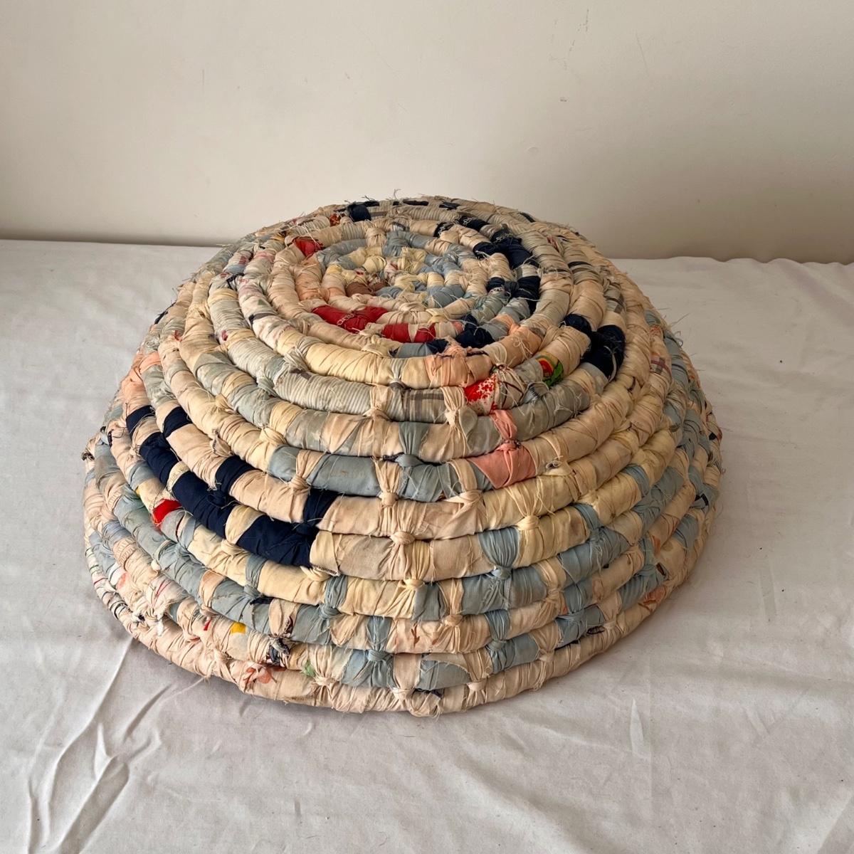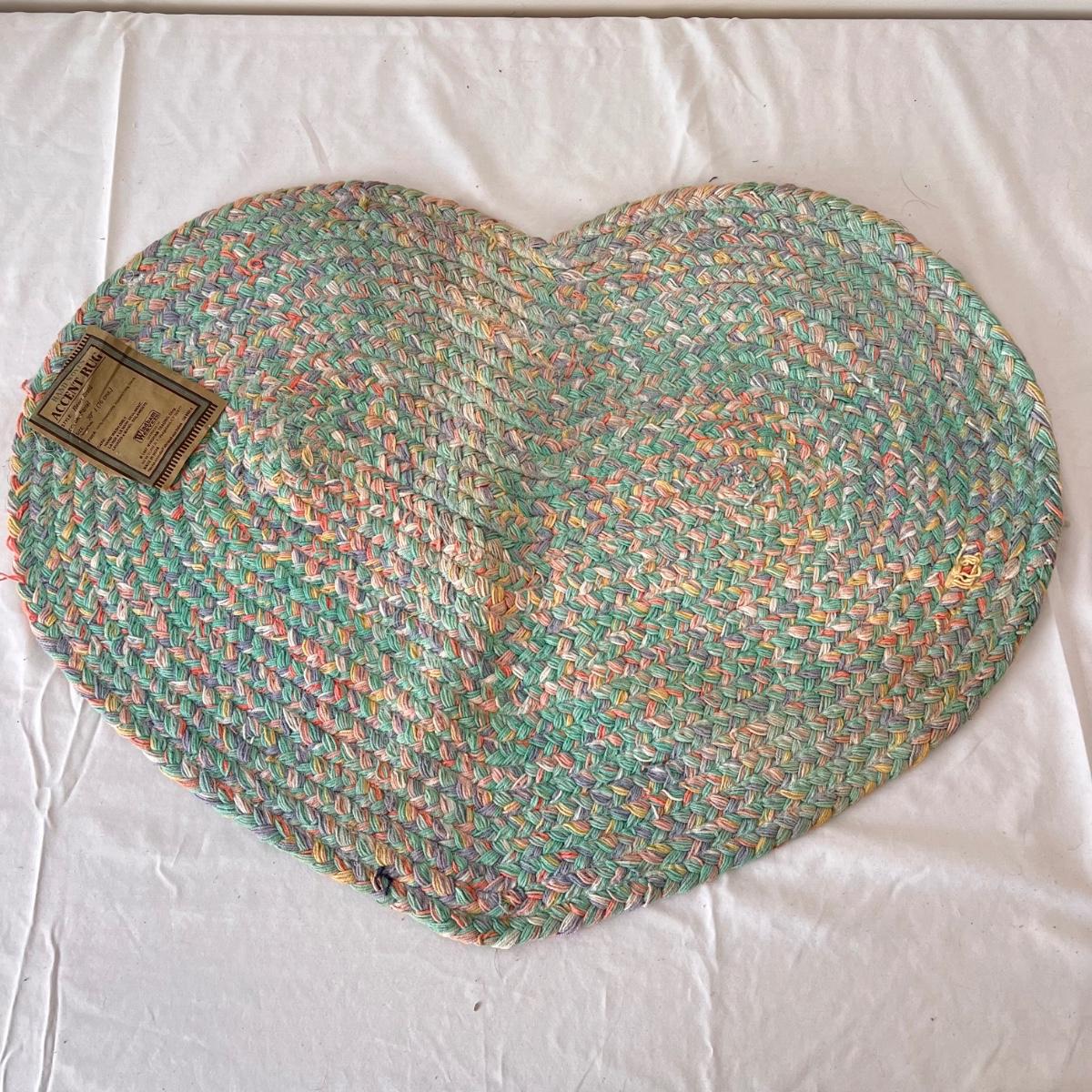 This lot includes three rugs, one large basket with a removable lid, a round mat, and a smaller basket. Two of the rugs appear to be hand woven into a heart braid. The largest is the tan and blue rug that measures 44” x 26”H. The large basket measures 21”D x 23”H. Shipping available.
