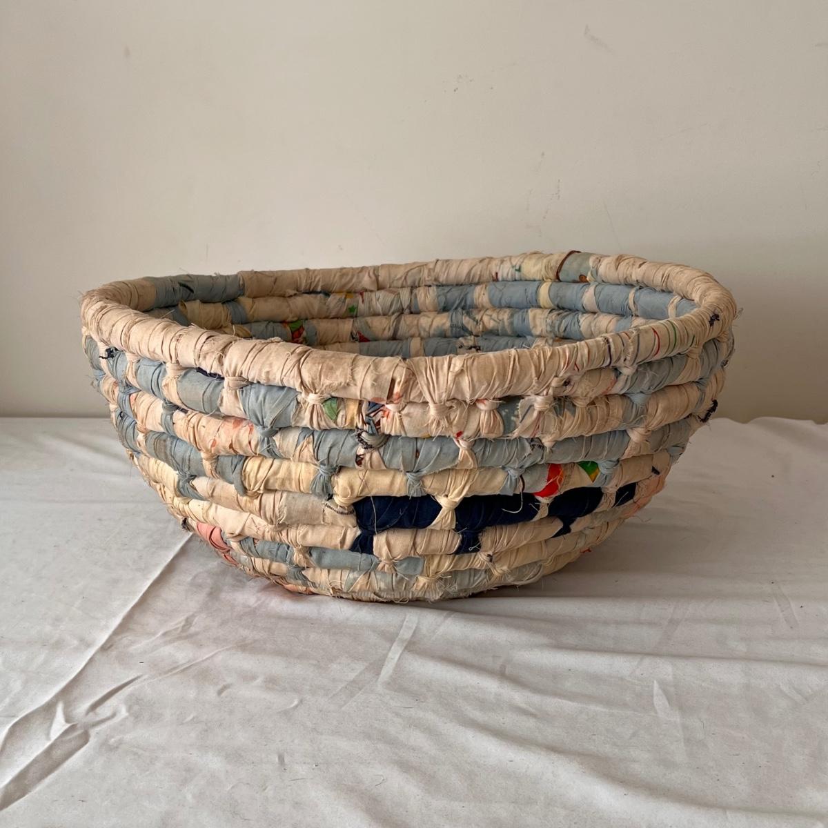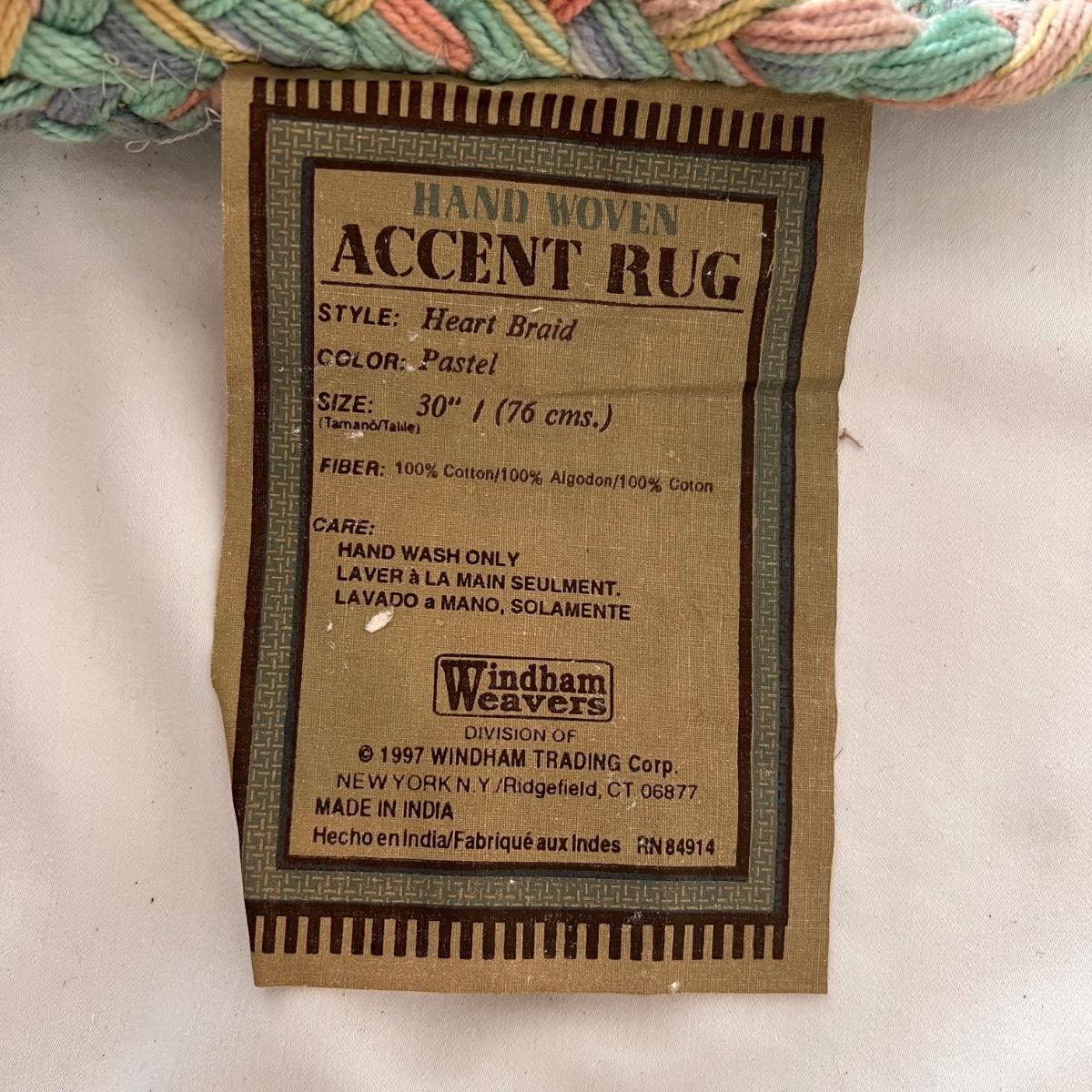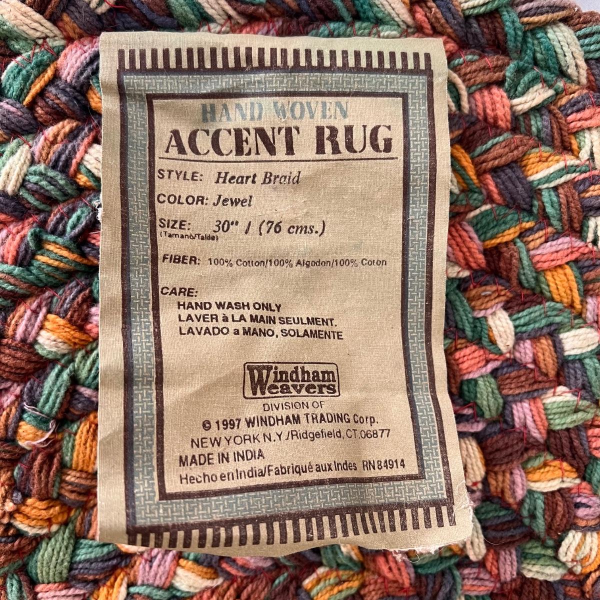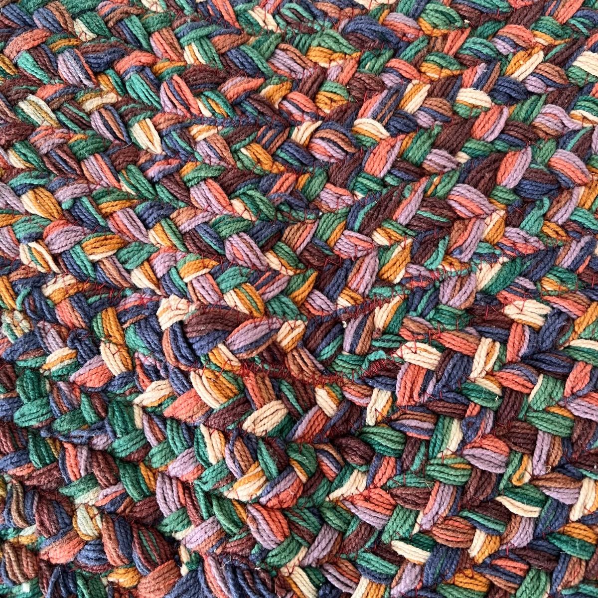 This lot includes three rugs, one large basket with a removable lid, a round mat, and a smaller basket. Two of the rugs appear to be hand woven into a heart braid. The largest is the tan and blue rug that measures 44” x 26”H. The large basket measures 21”D x 23”H. Shipping available.