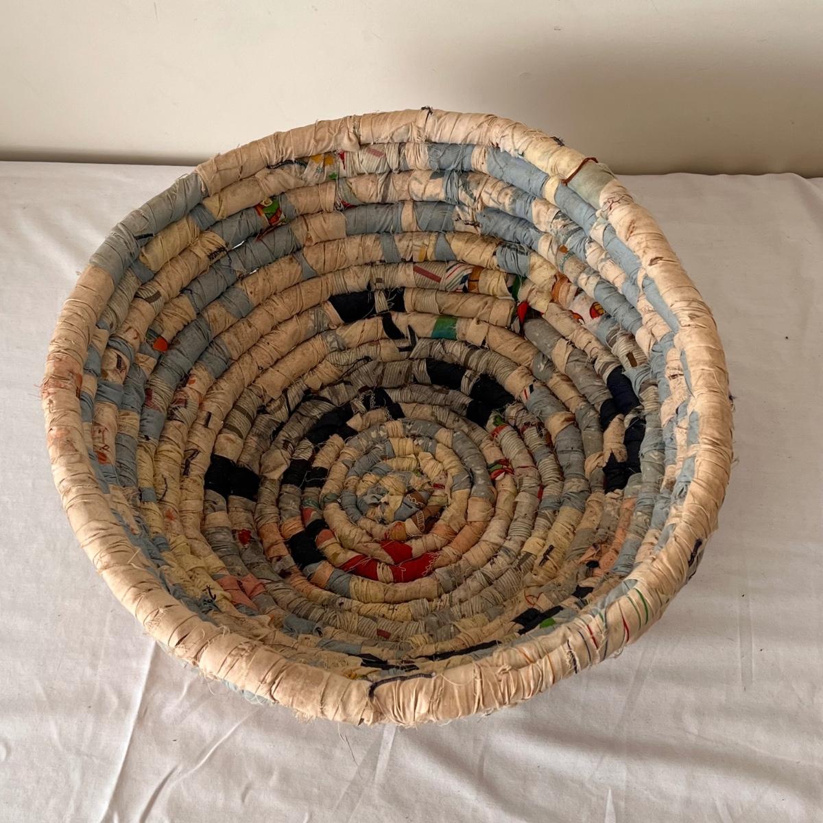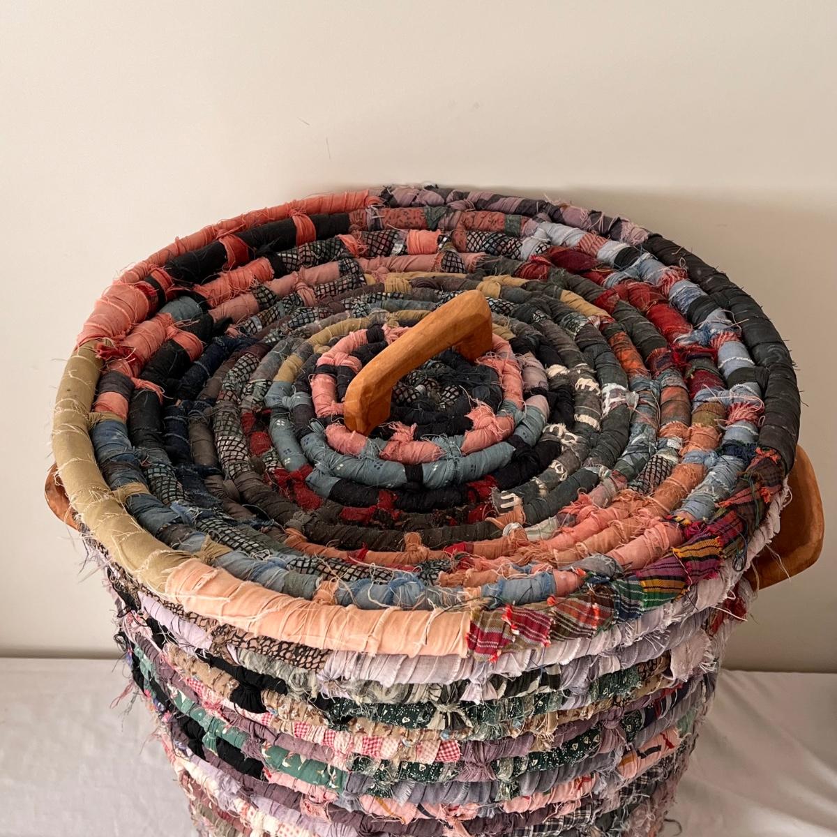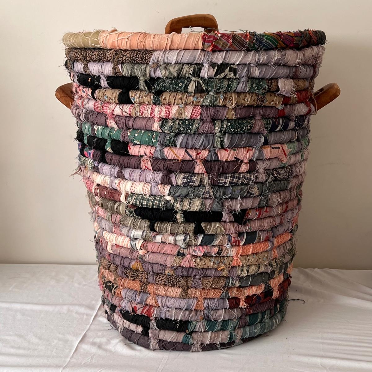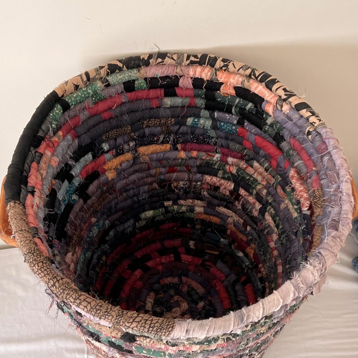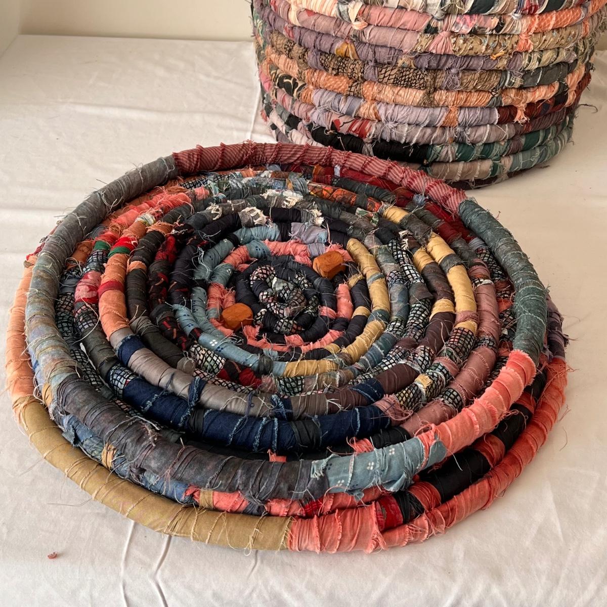 This lot includes three rugs, one large basket with a removable lid, a round mat, and a smaller basket. Two of the rugs appear to be hand woven into a heart braid. The largest is the tan and blue rug that measures 44” x 26”H. The large basket measures 21”D x 23”H. Shipping available.